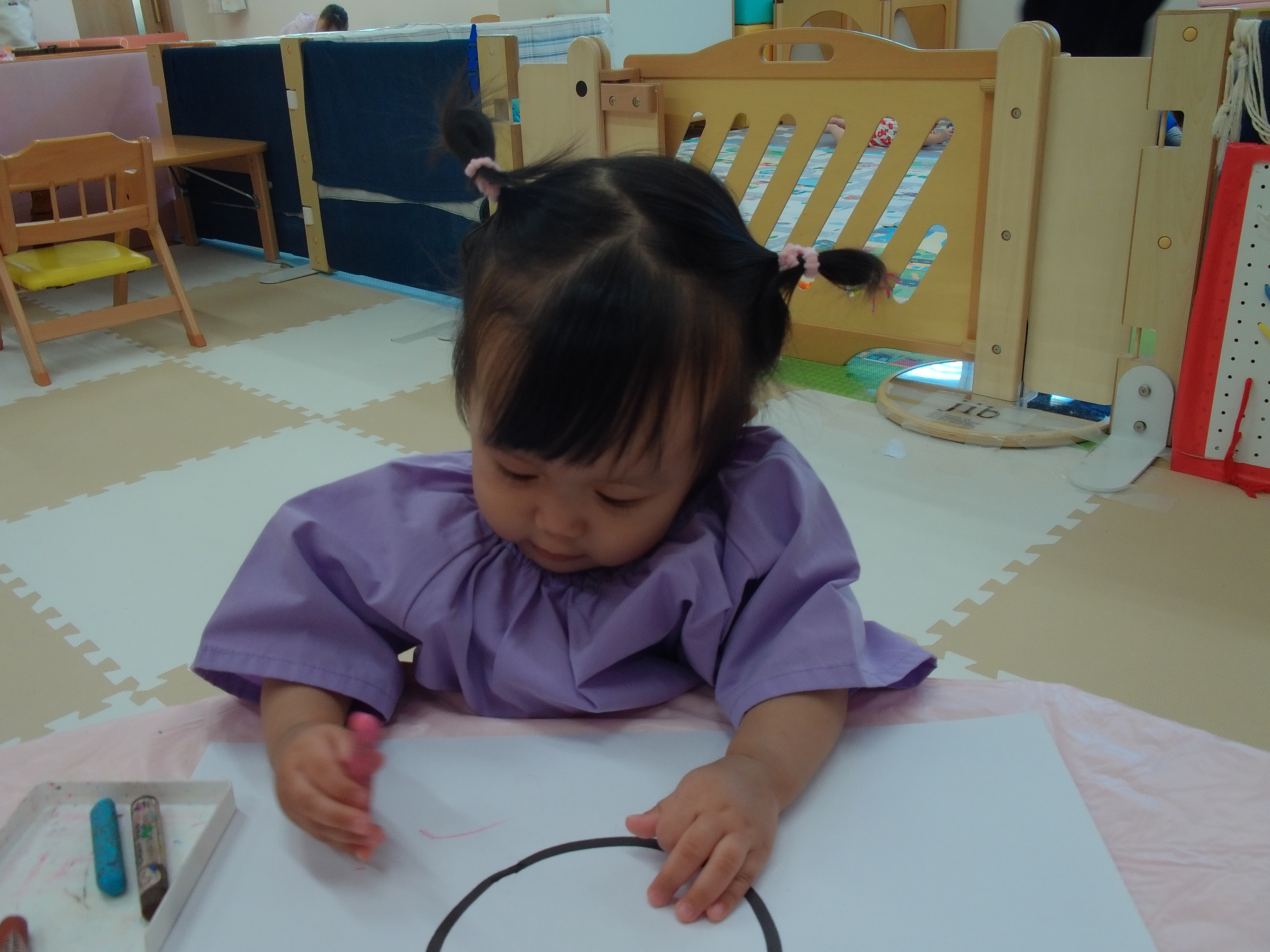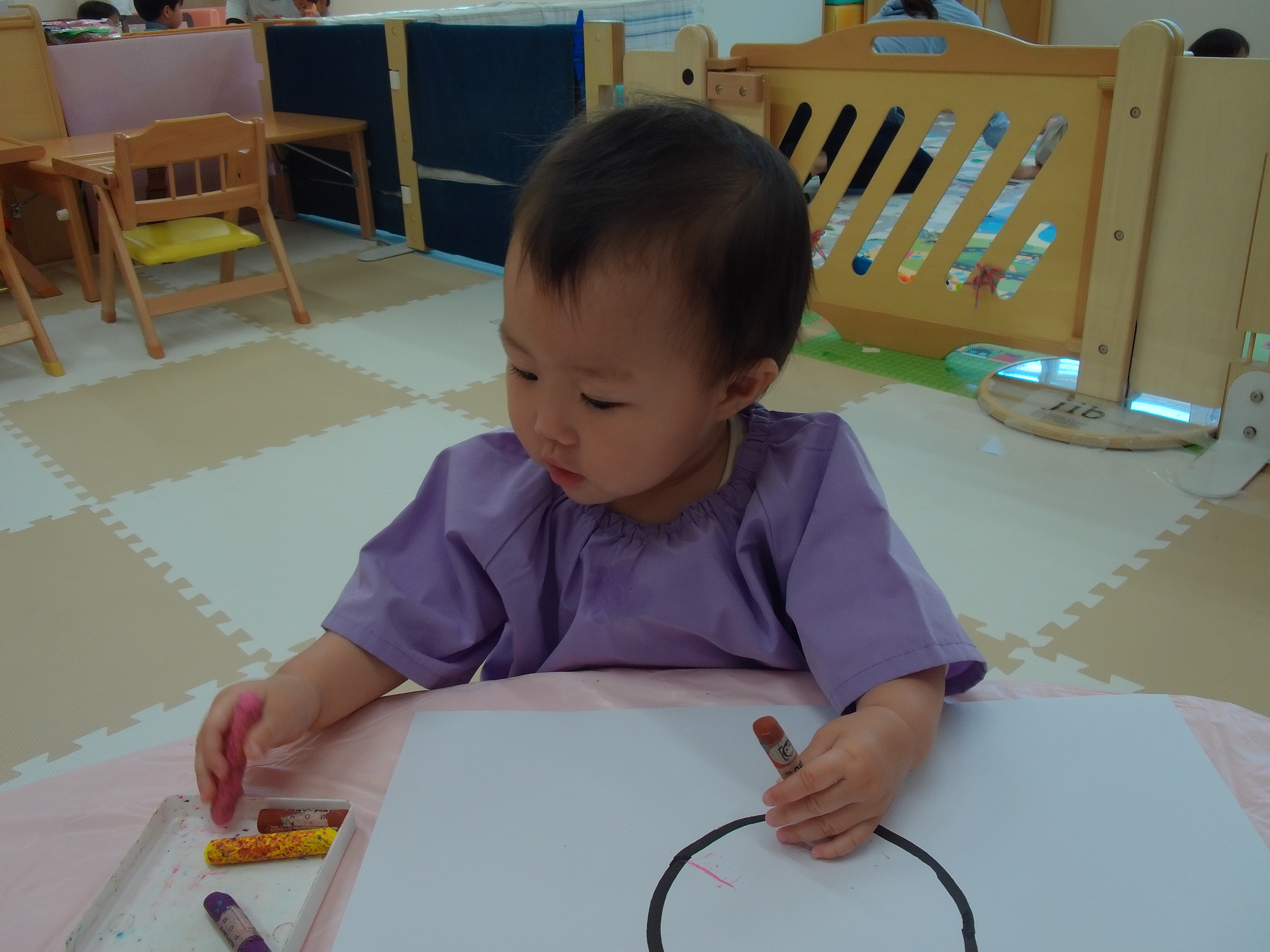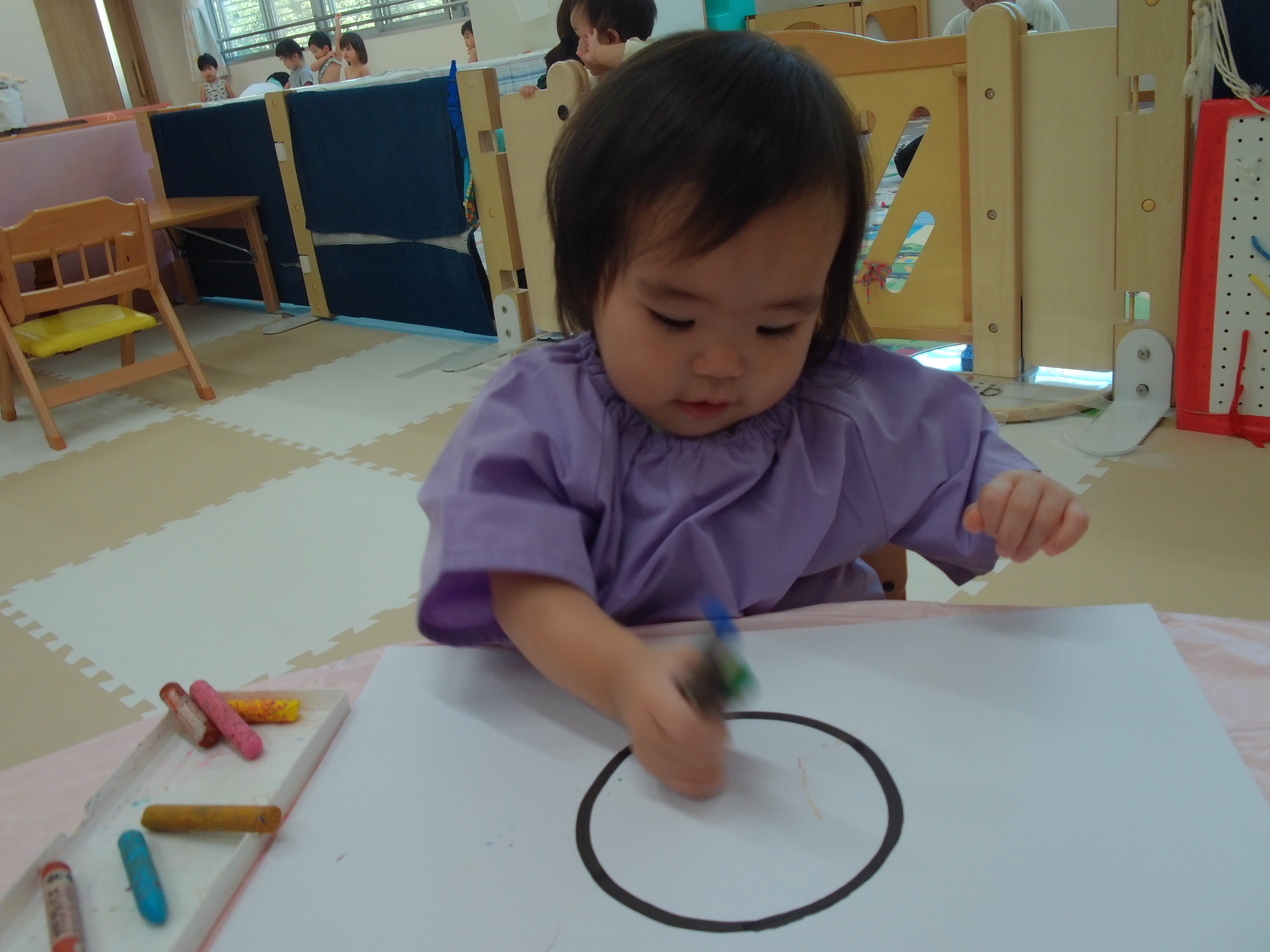 今日は丸が描かれた画用紙になぐり描きをしました。