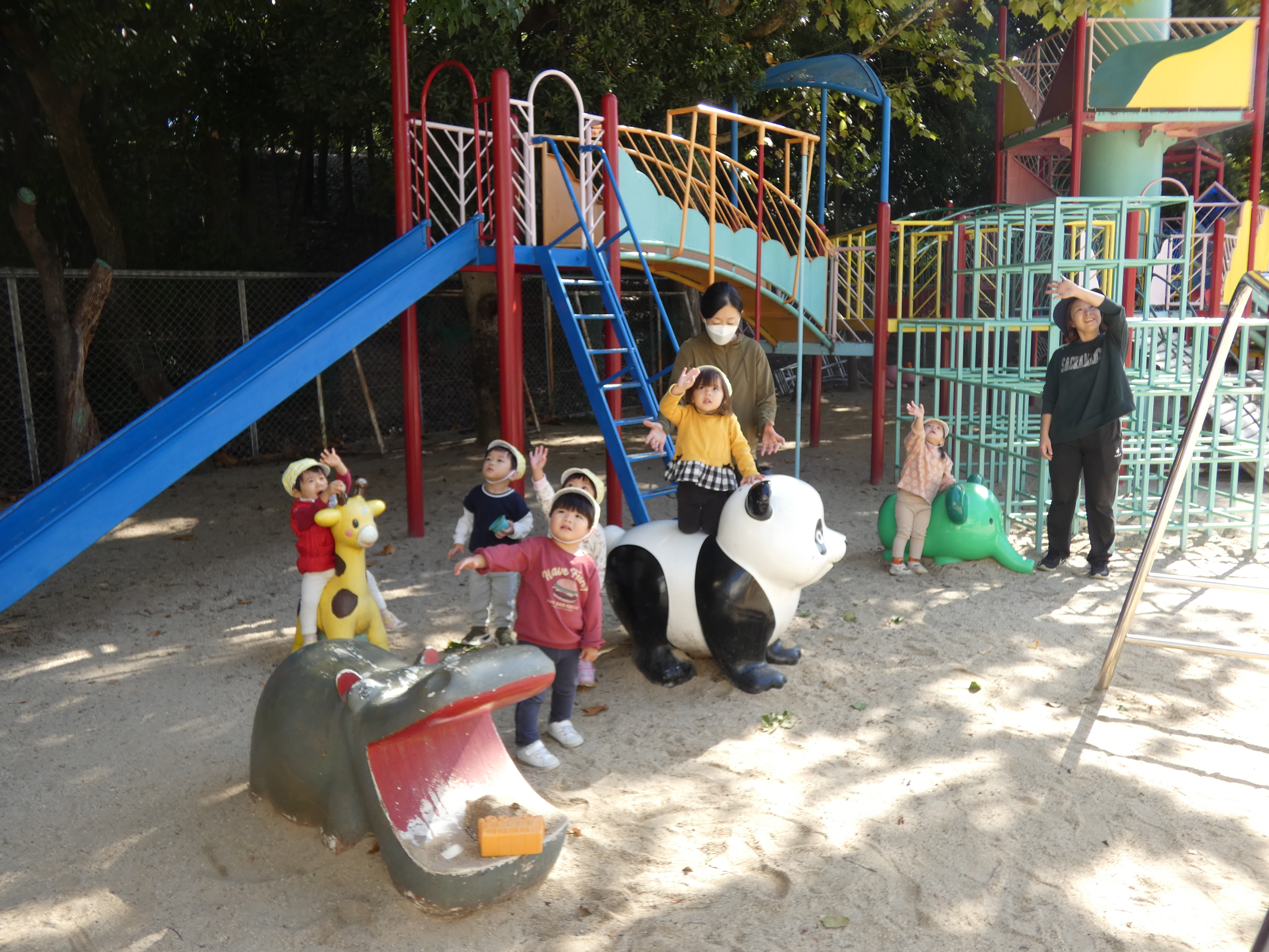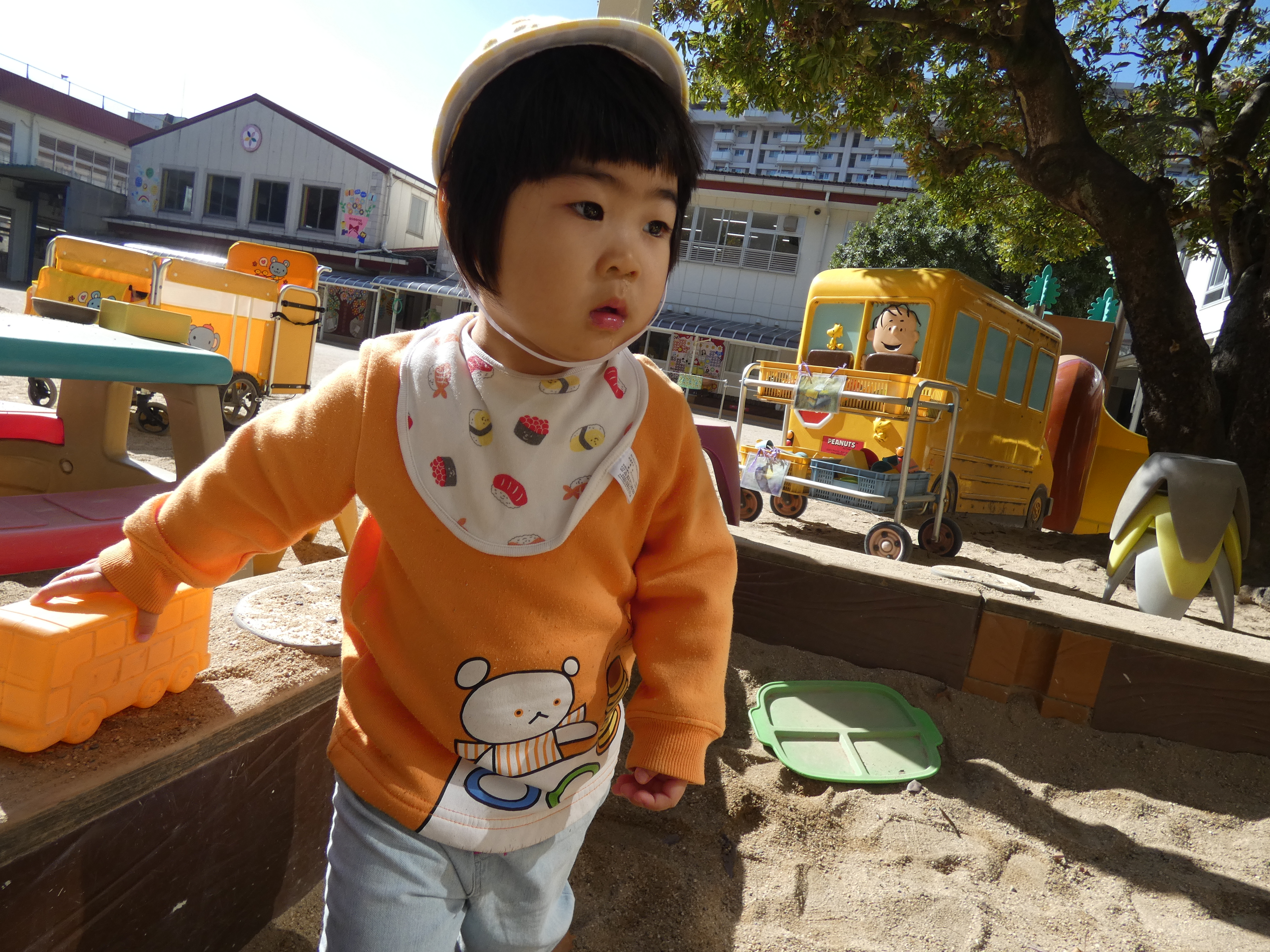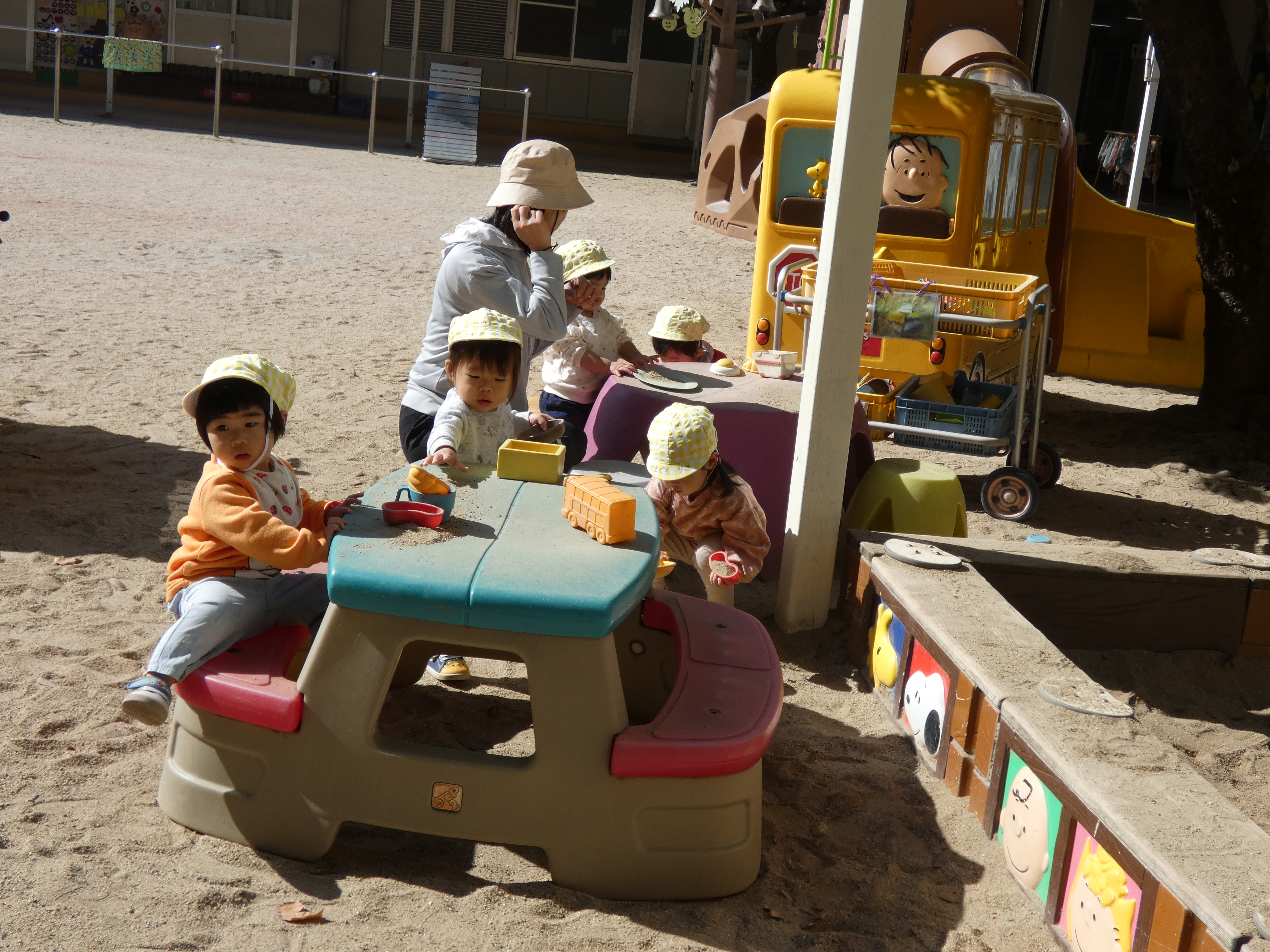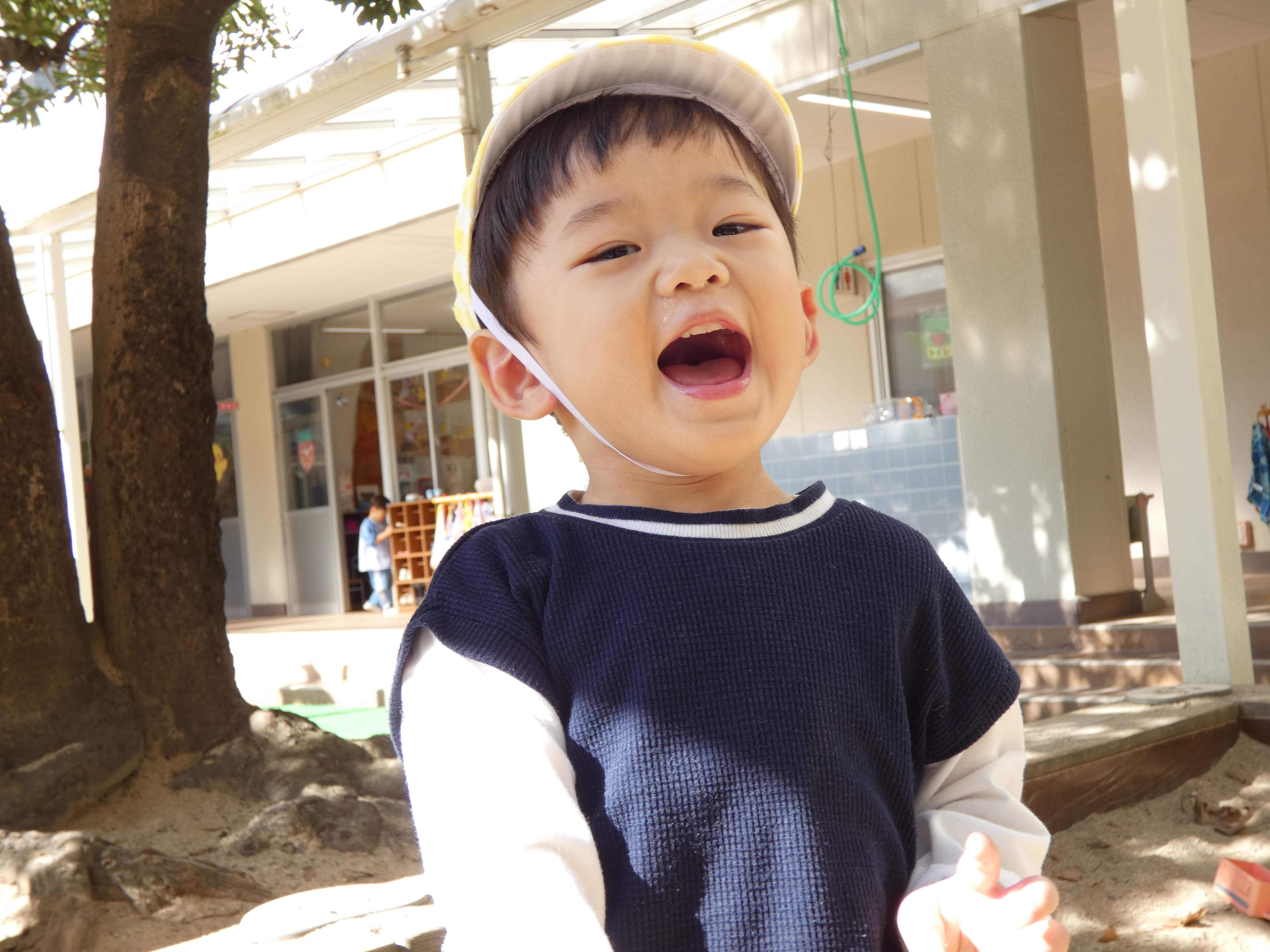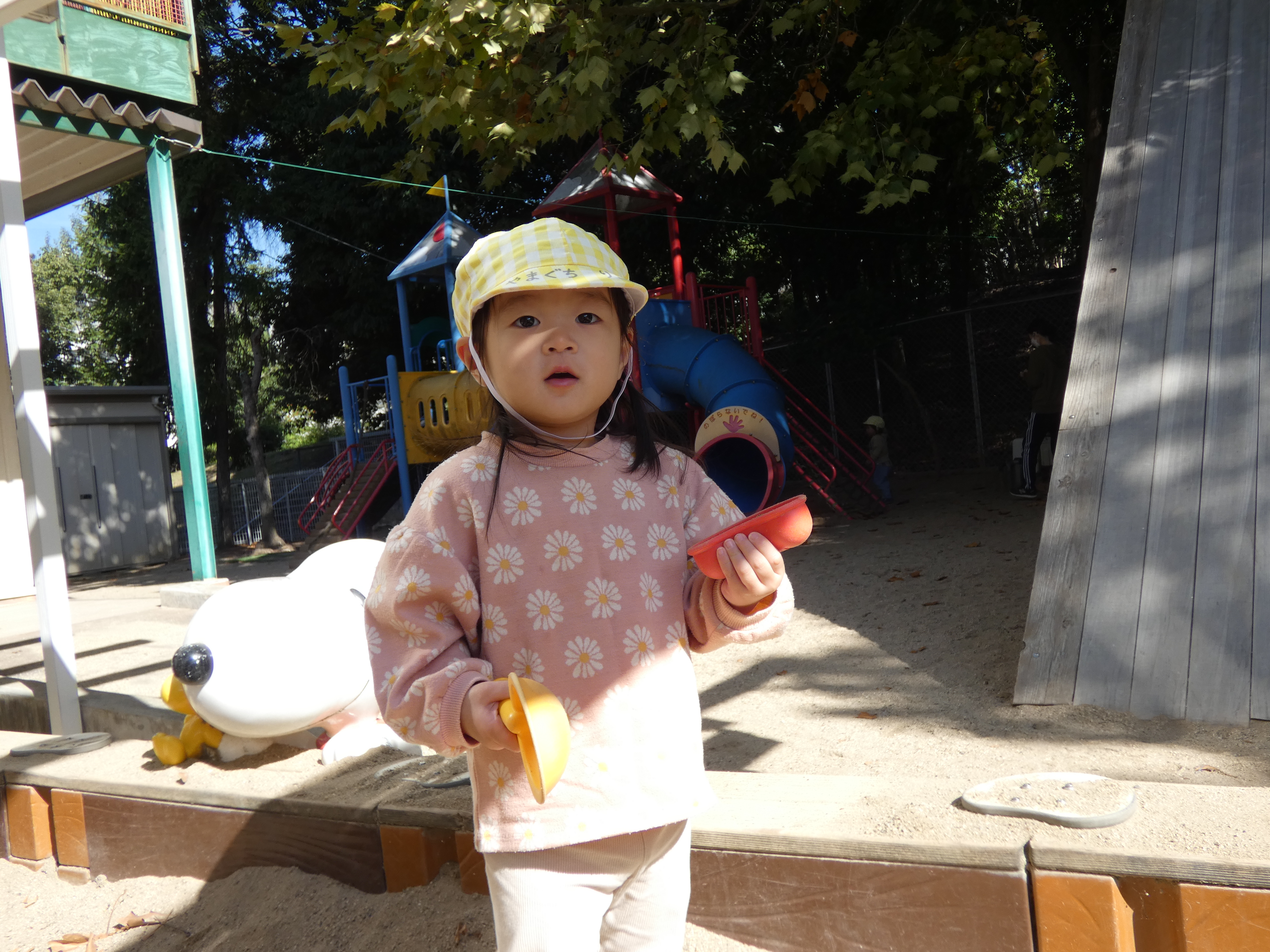 真っ青な秋空が広がる今日。園庭でたっぷり遊んだつき組のお友だちです。