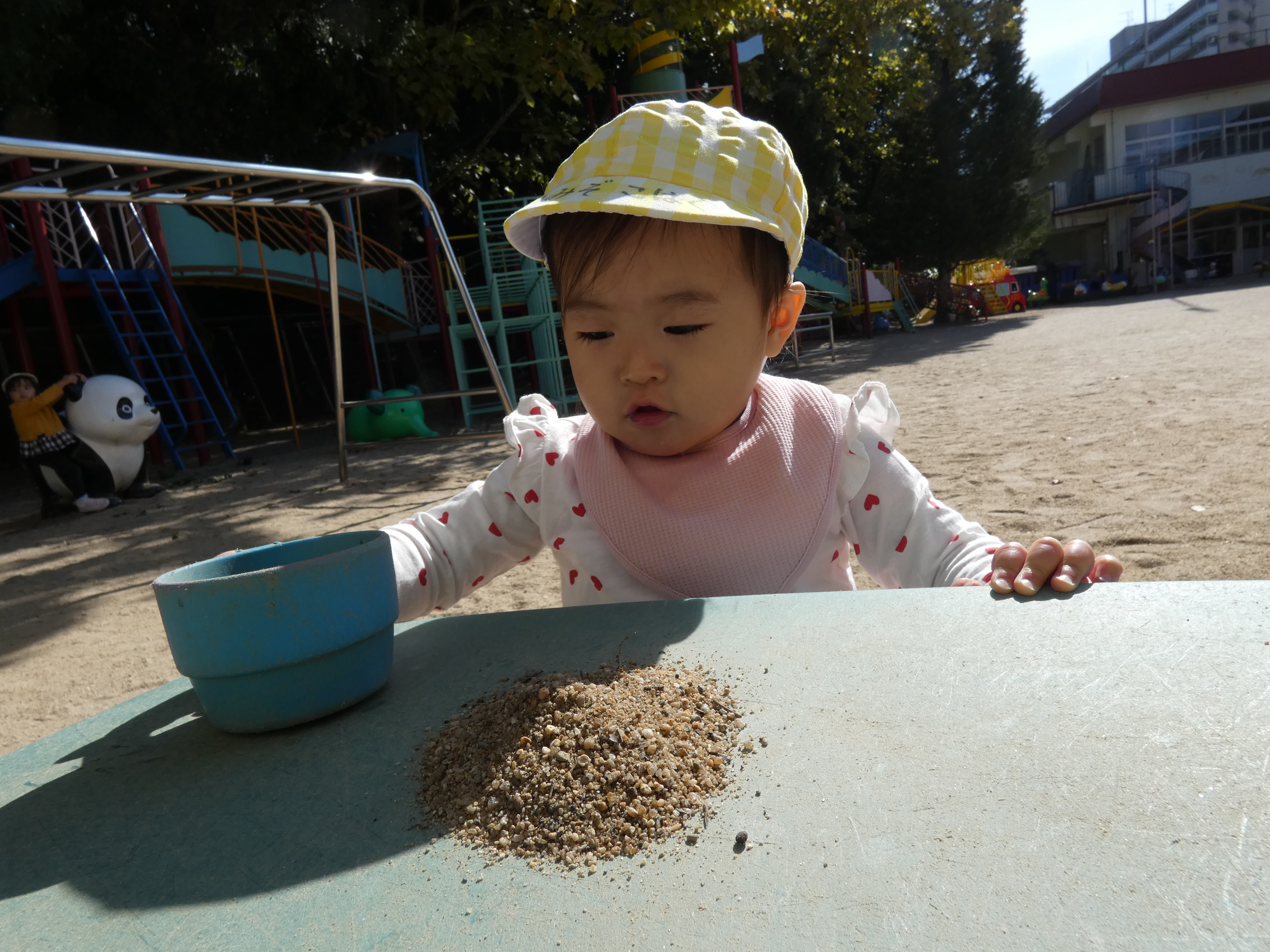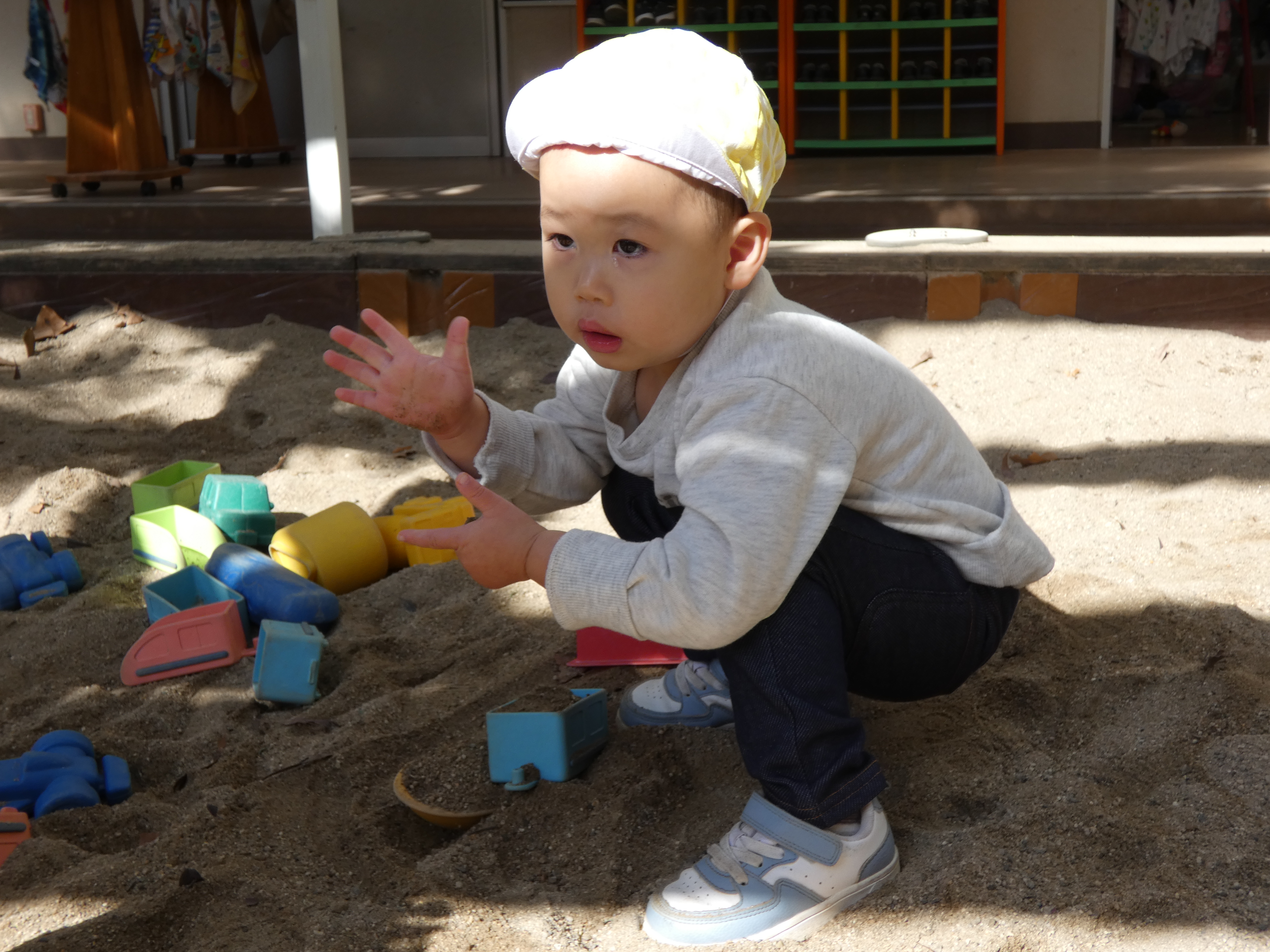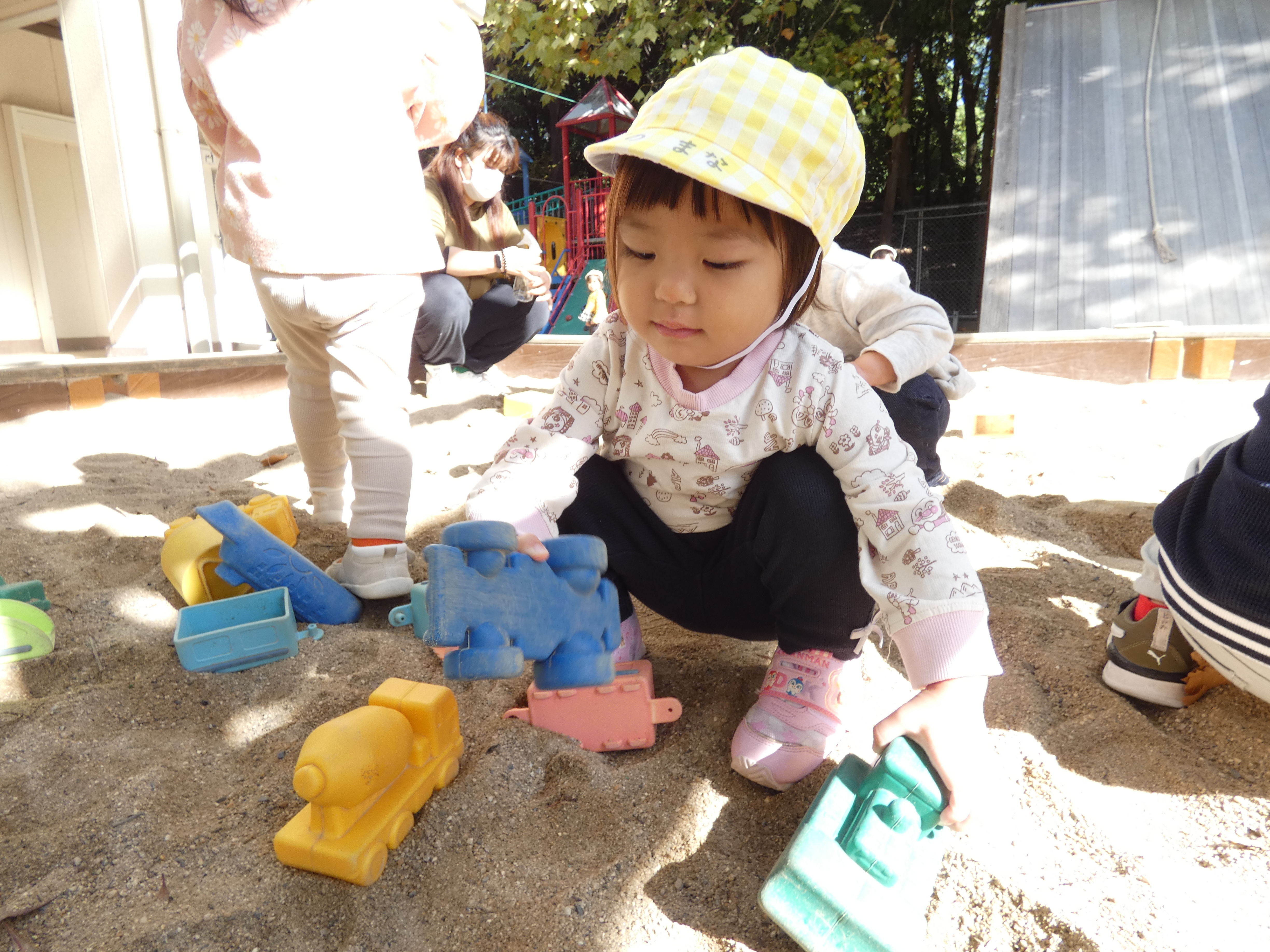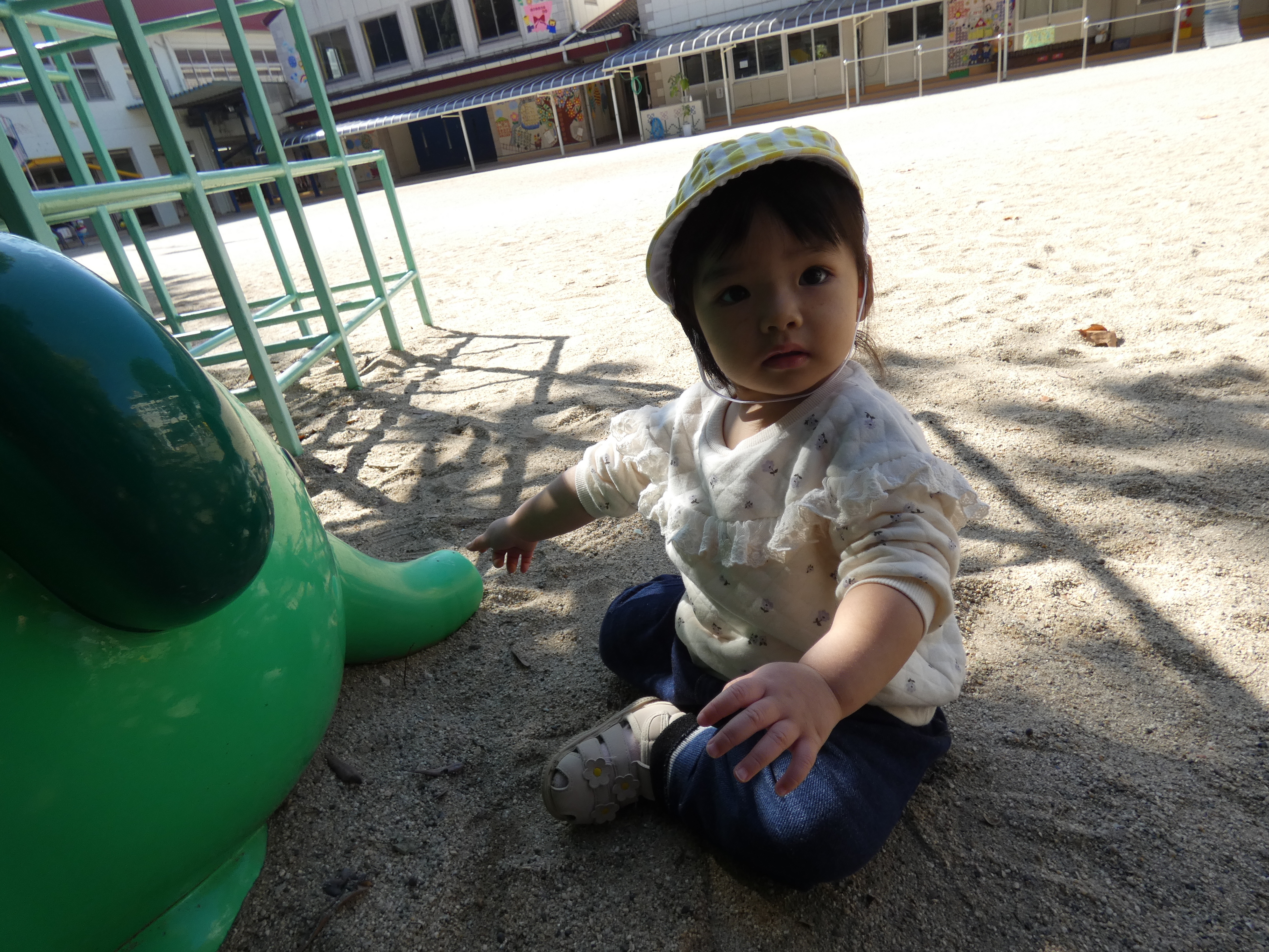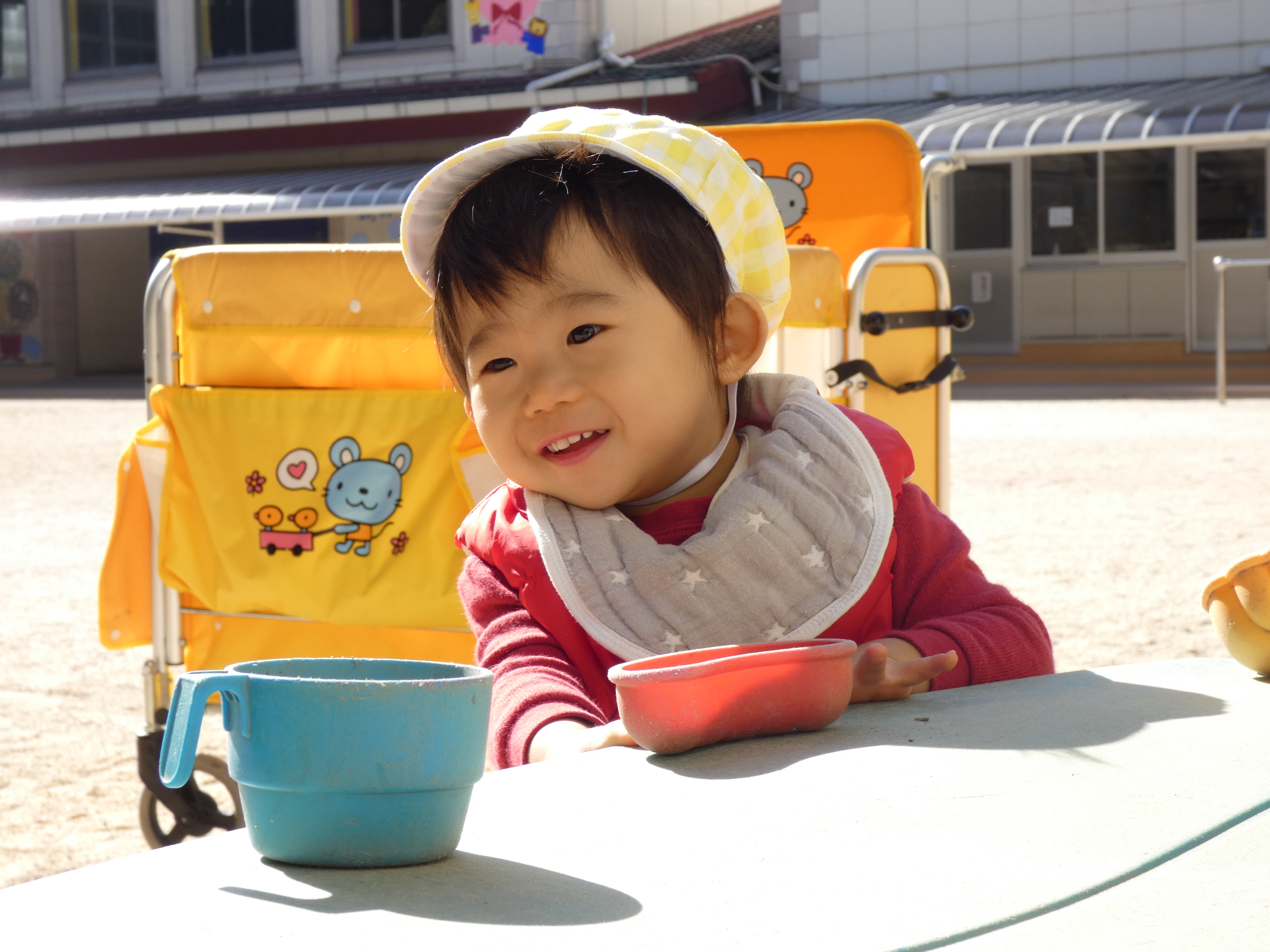真っ青な秋空が広がる今日。園庭でたっぷり遊んだつき組のお友だちです。