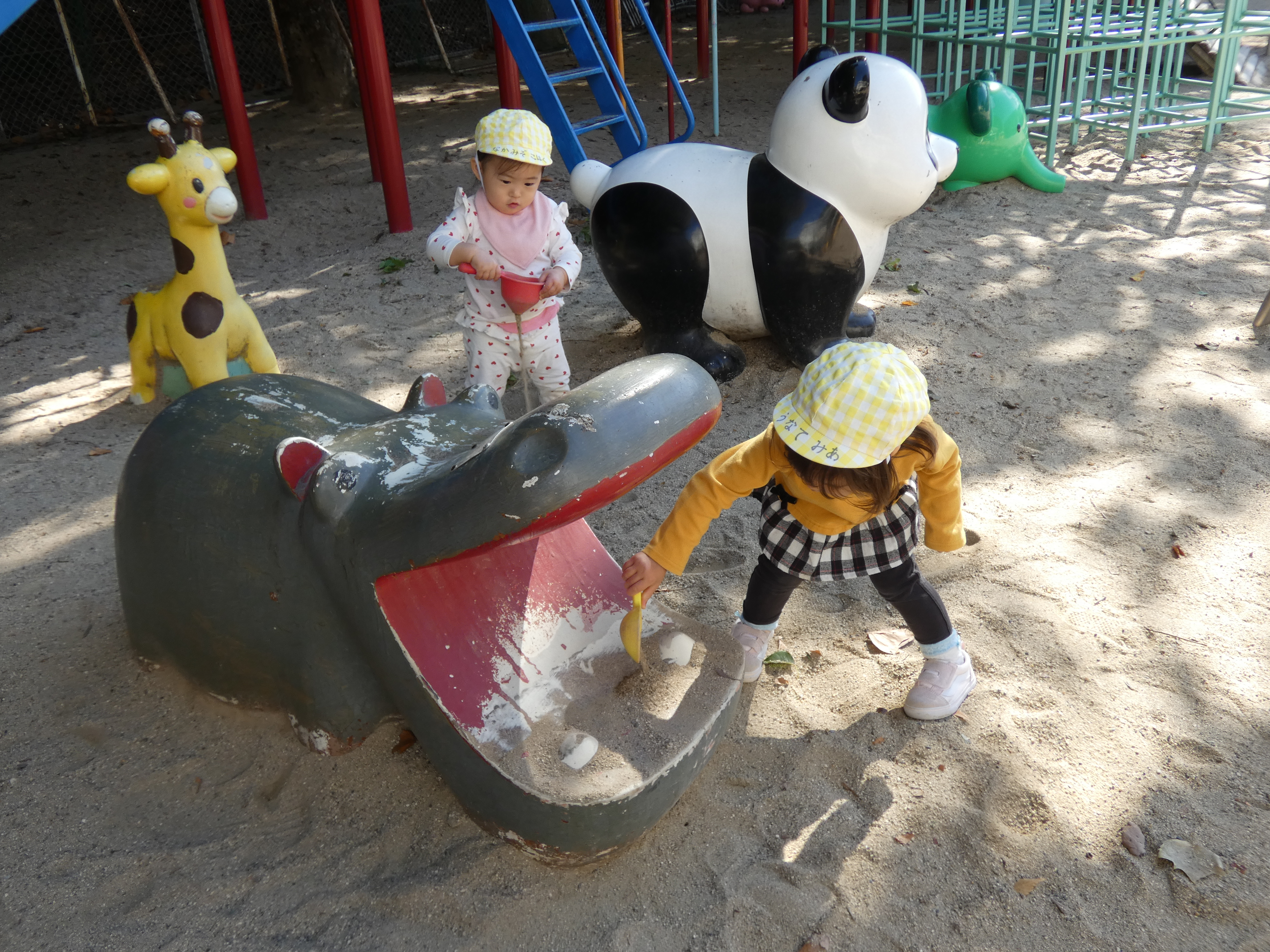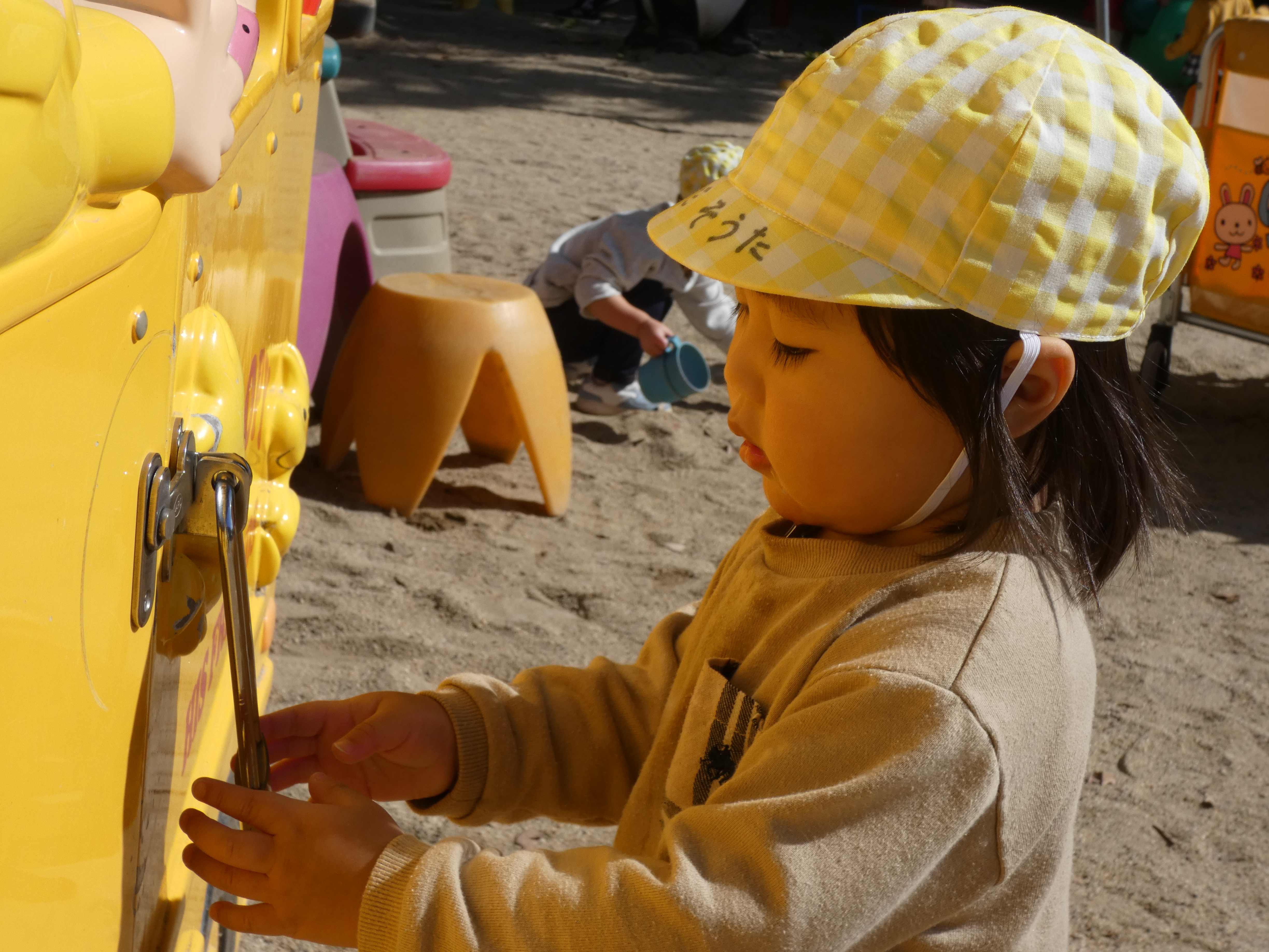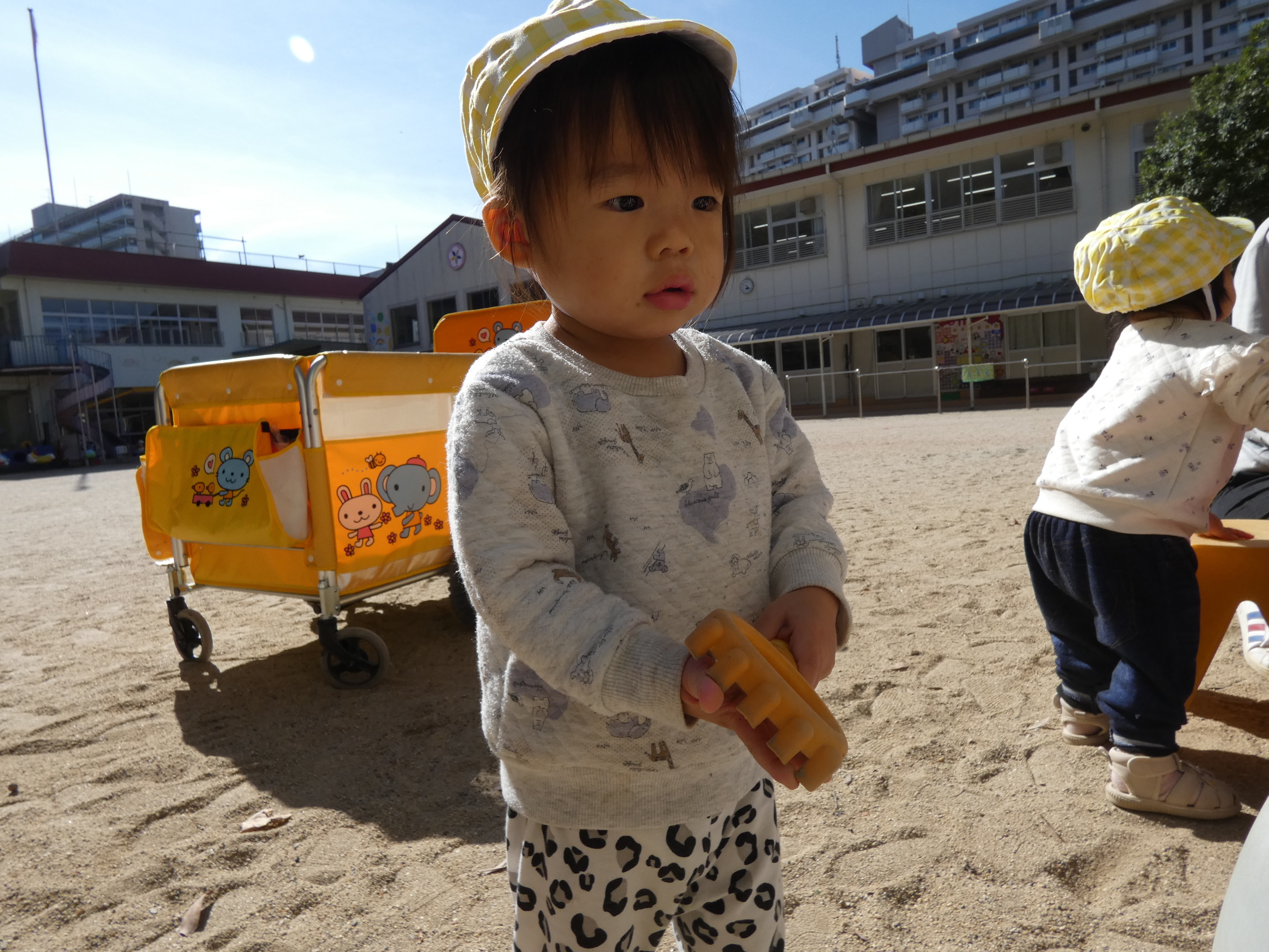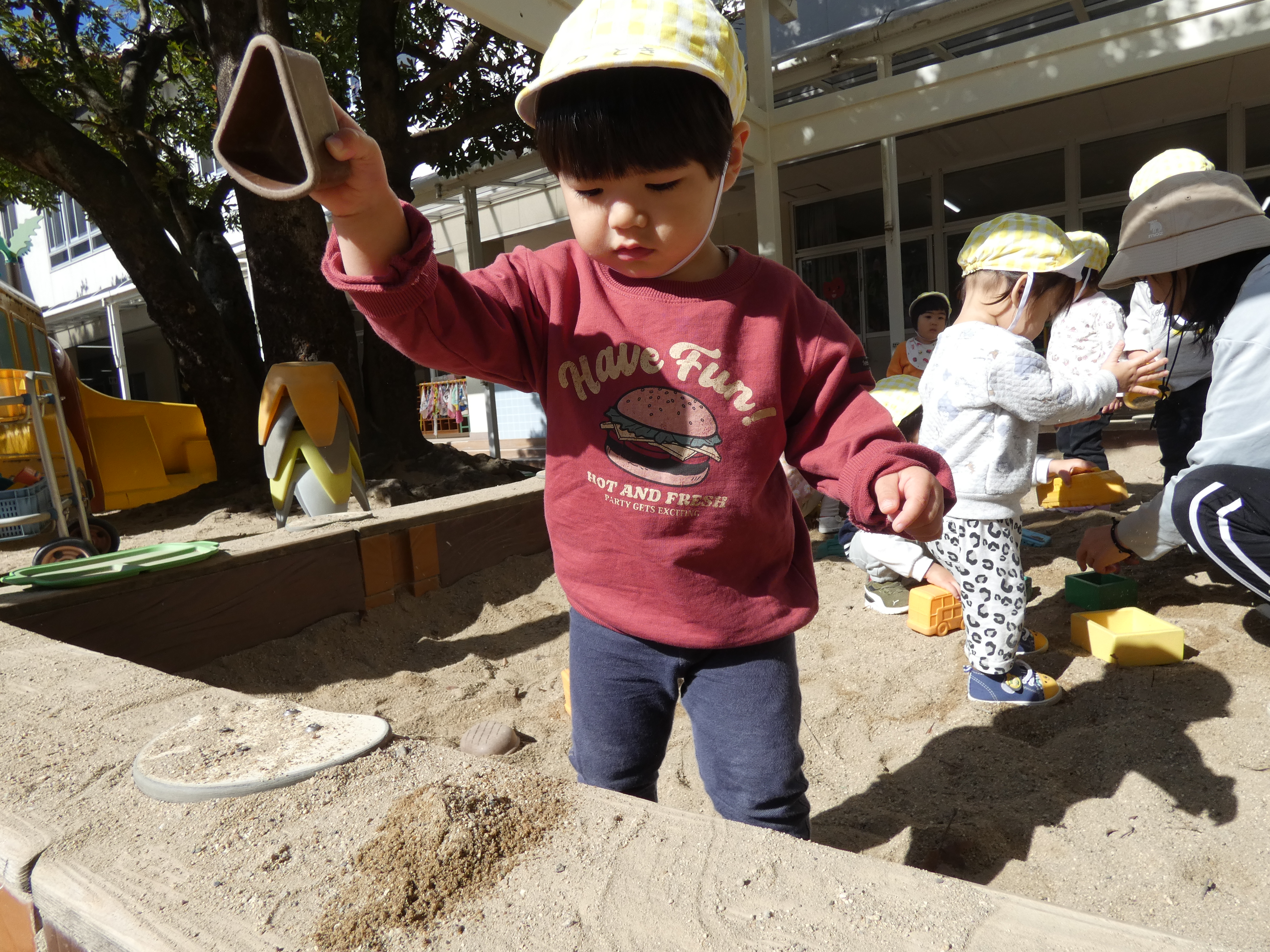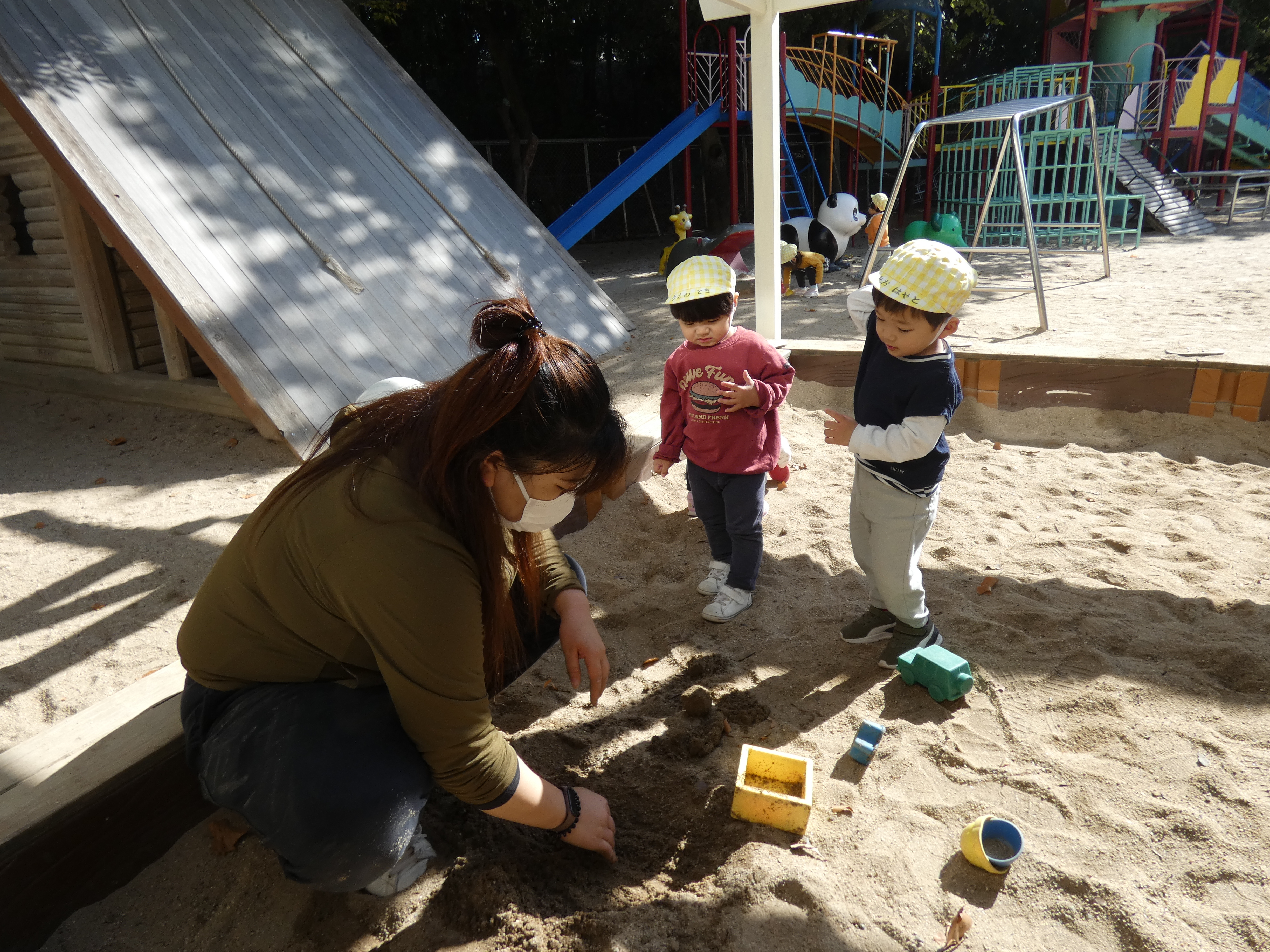 真っ青な秋空が広がる今日。園庭でたっぷり遊んだつき組のお友だちです。