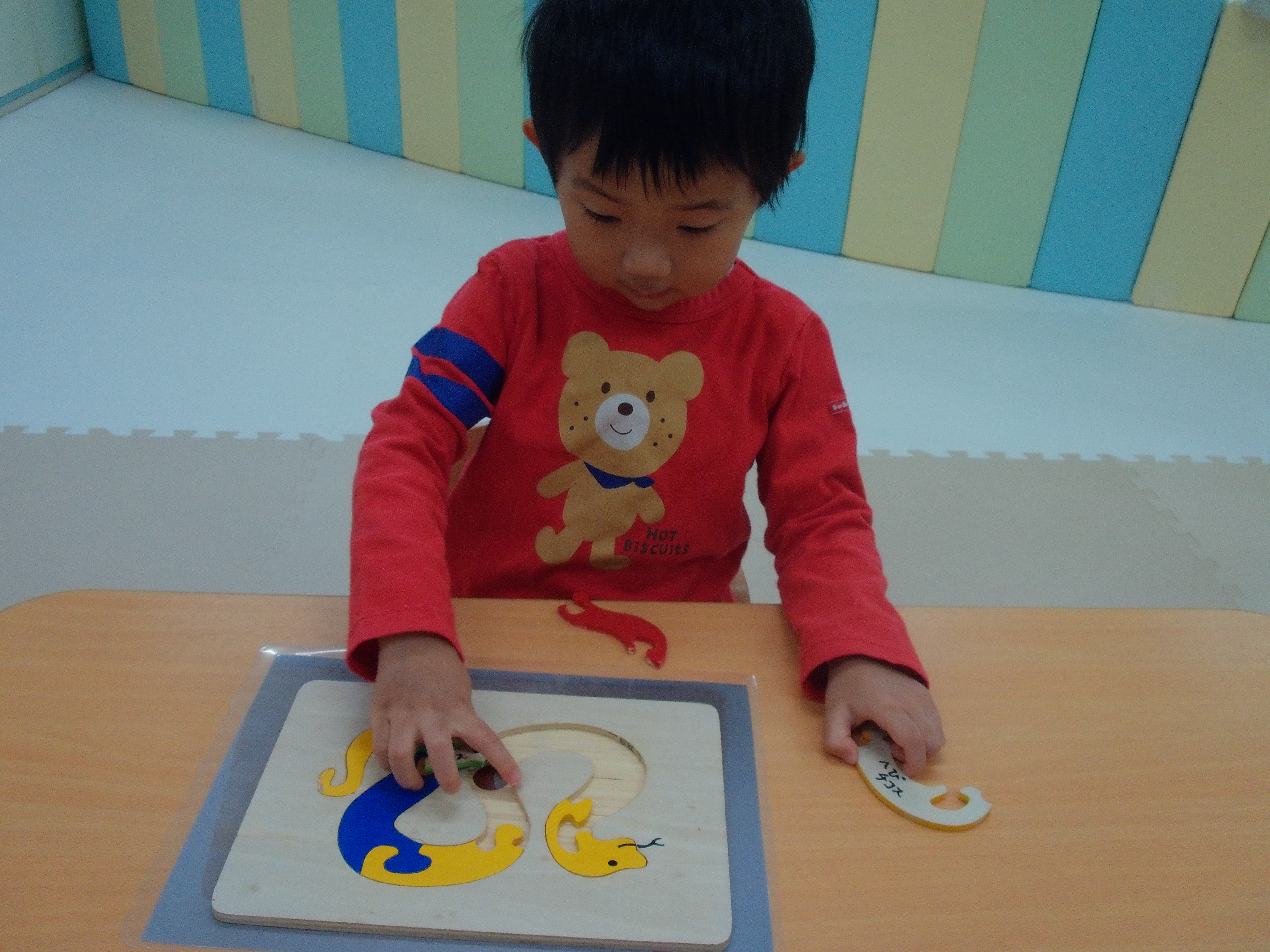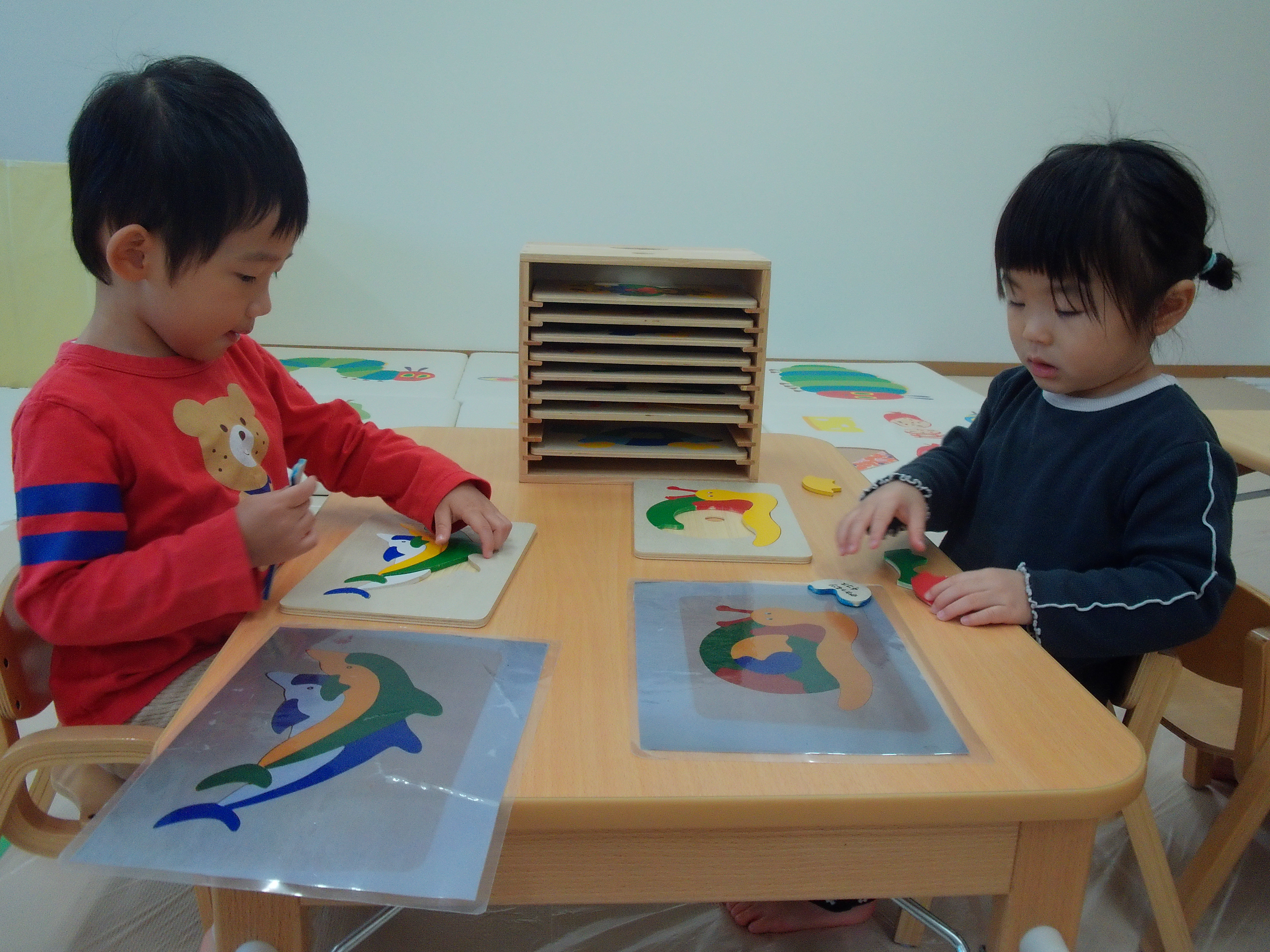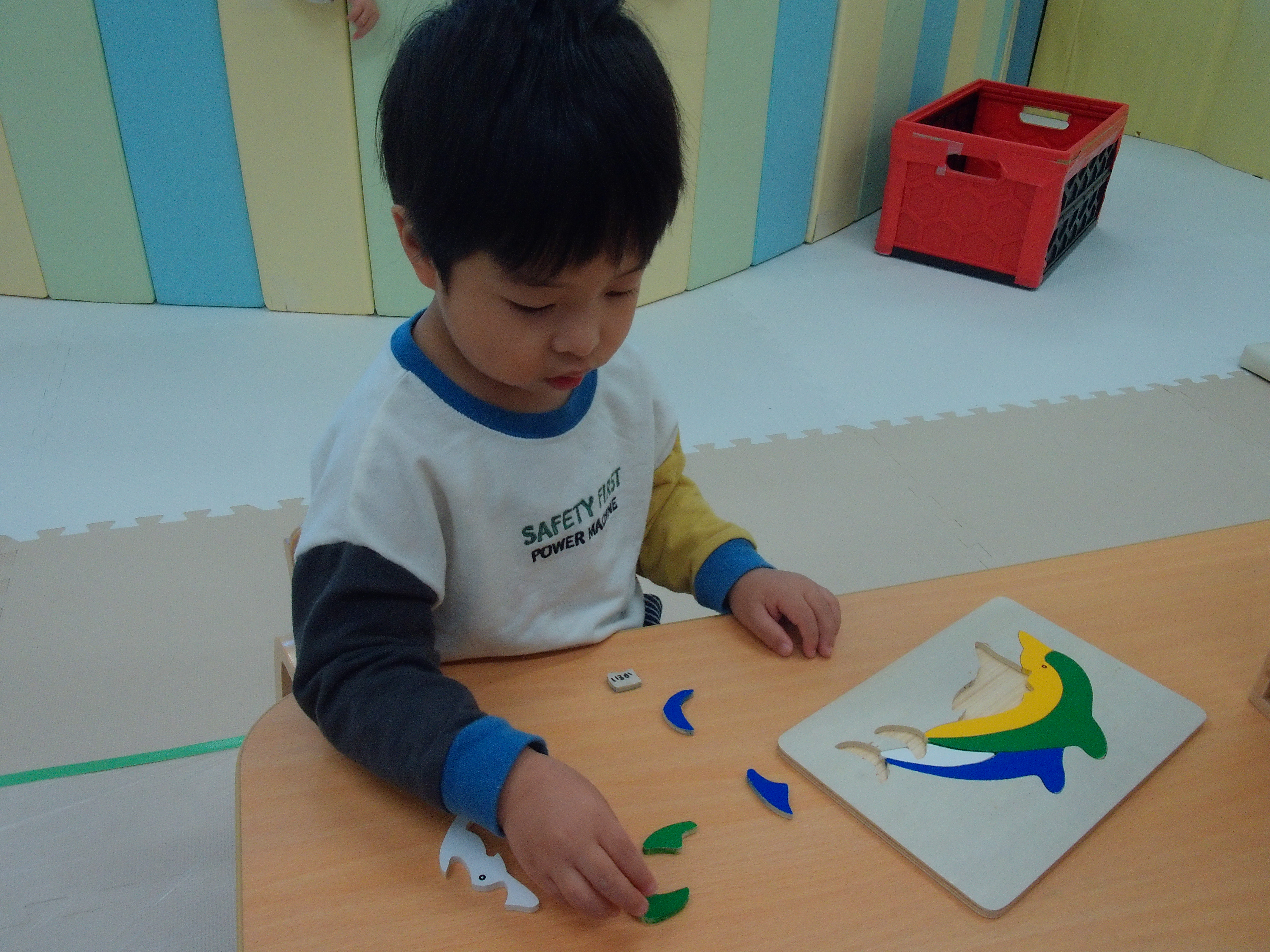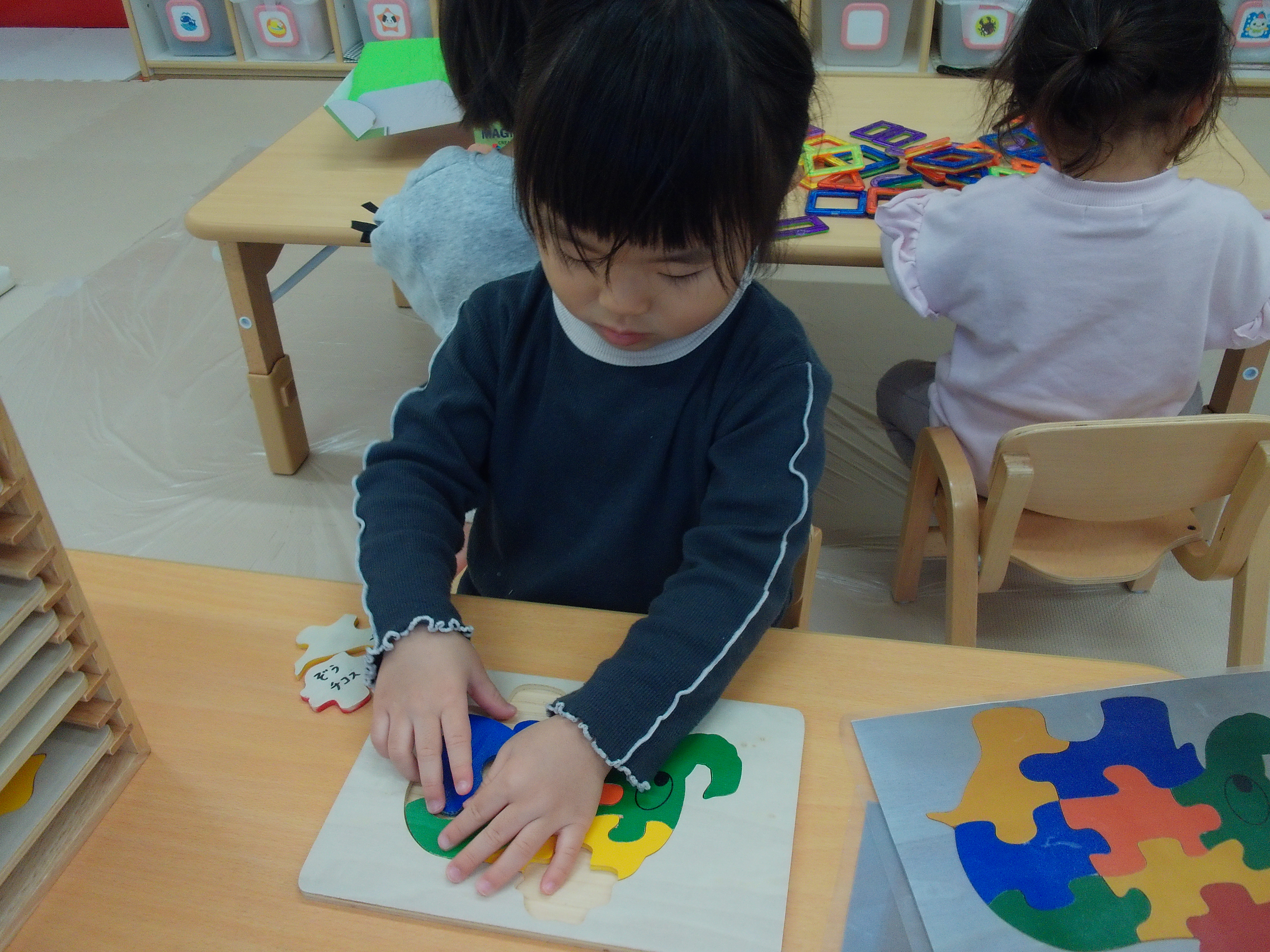 舟井先生の絵画指導のためしばらく合同保育で過ごしたそら組さん。難しいパズルも早く完成するようになっています。