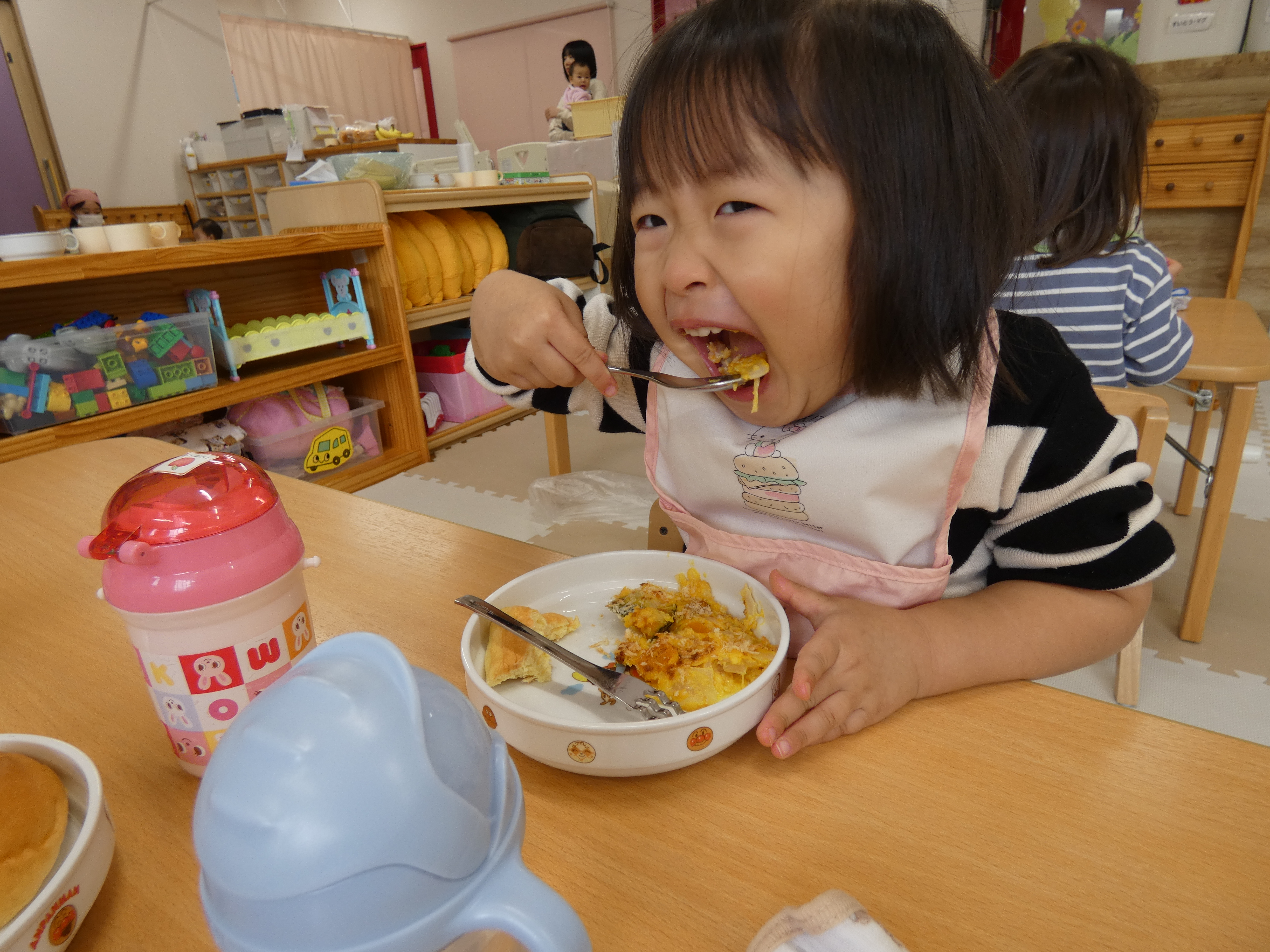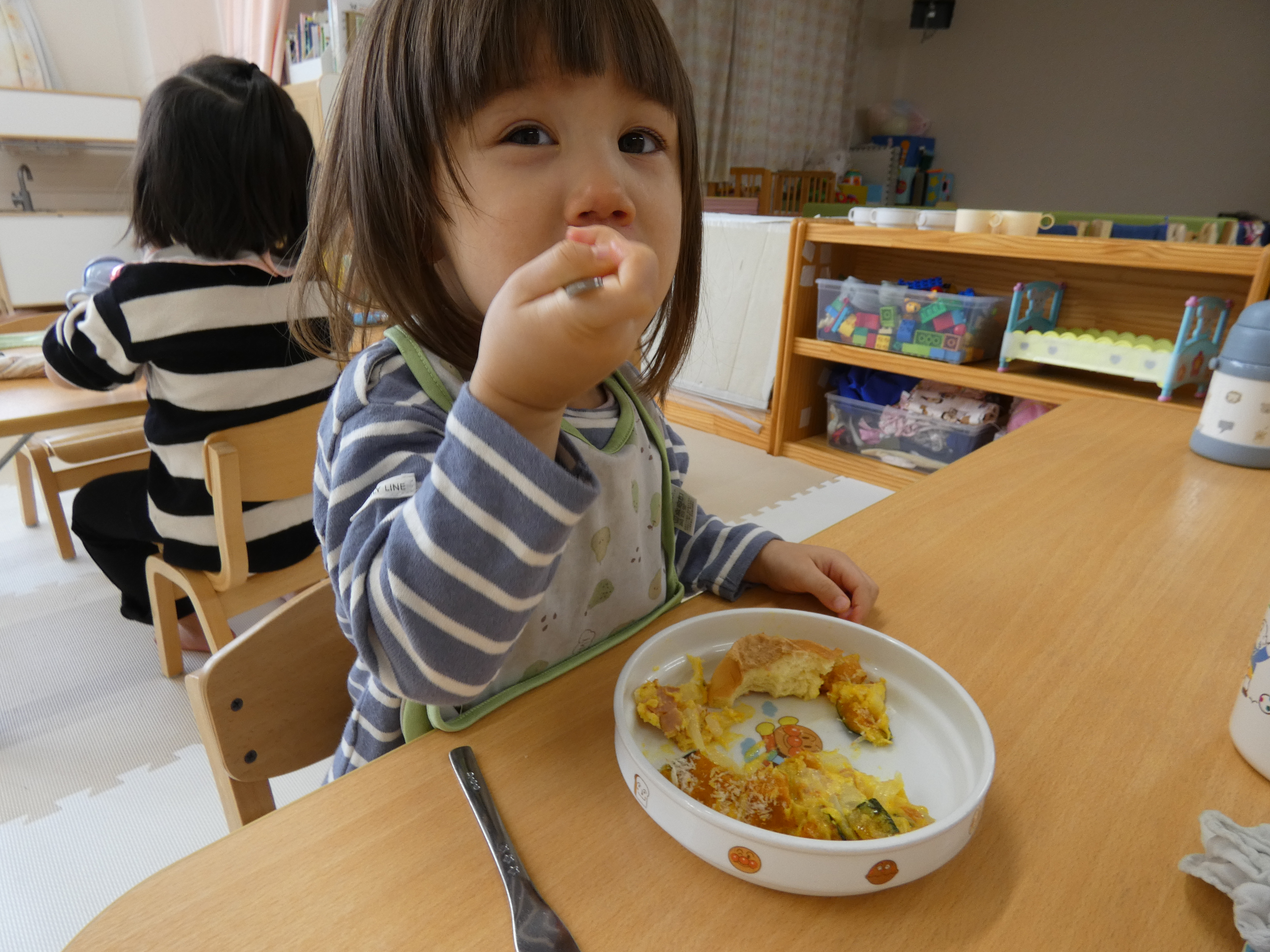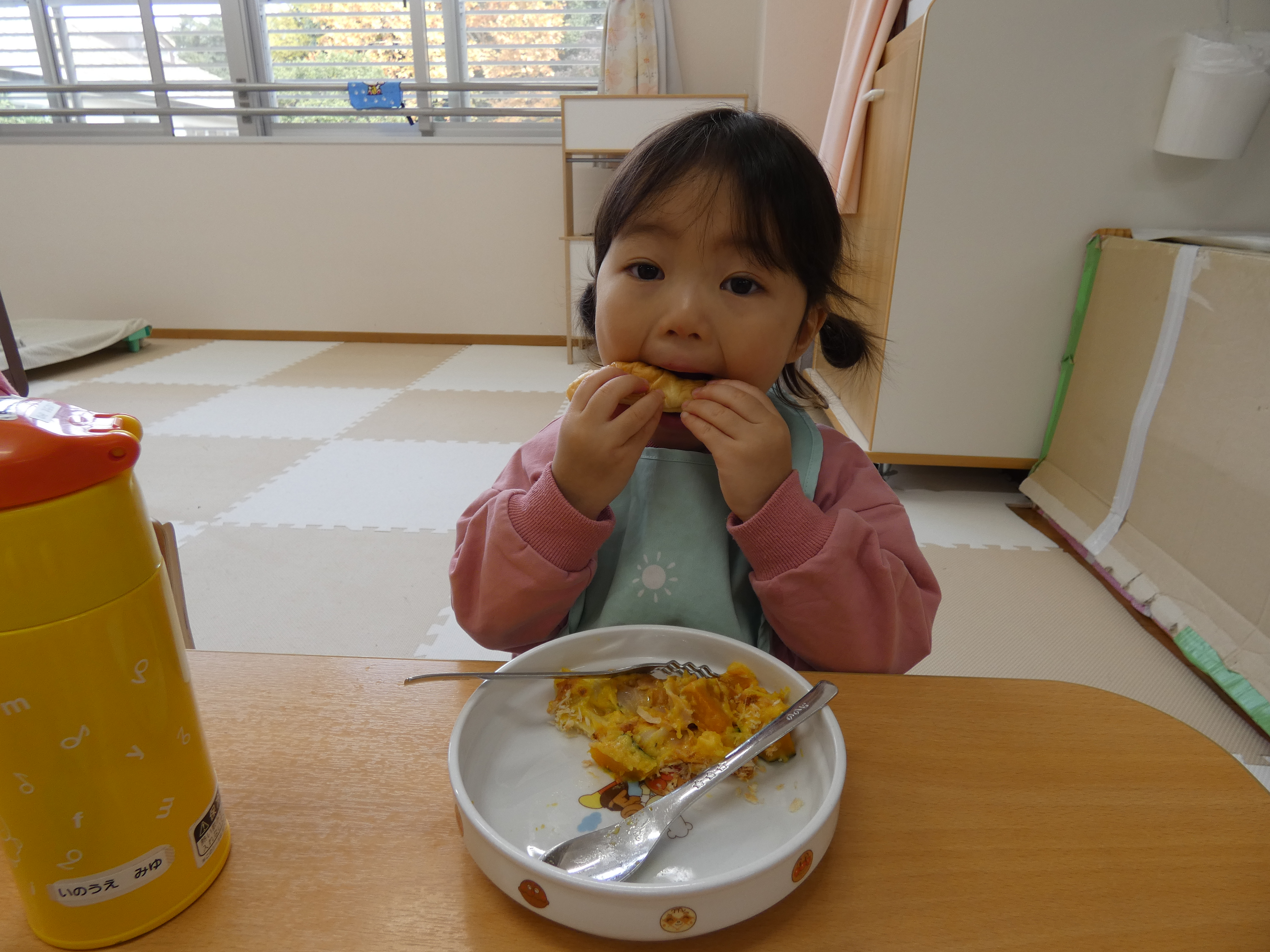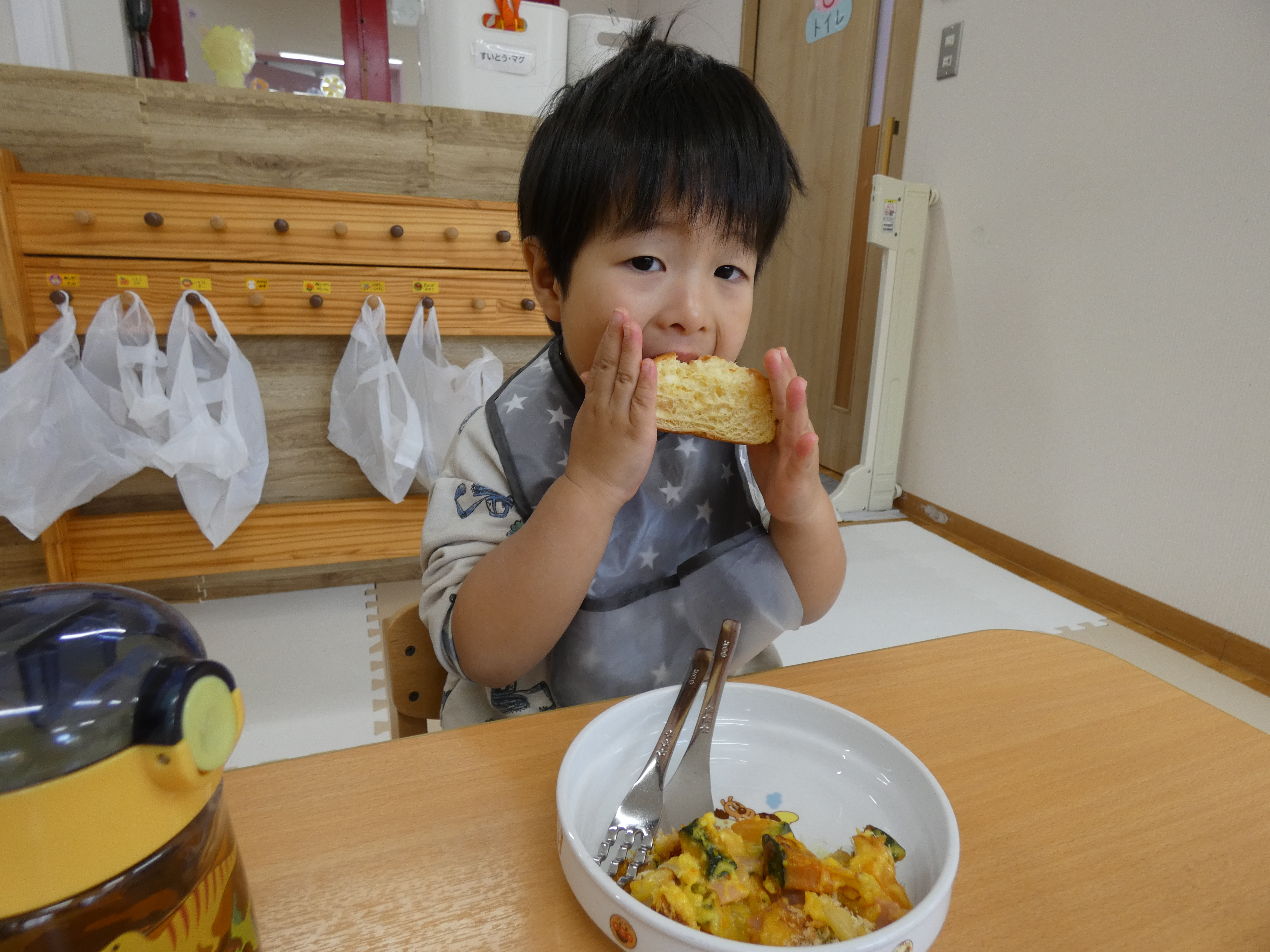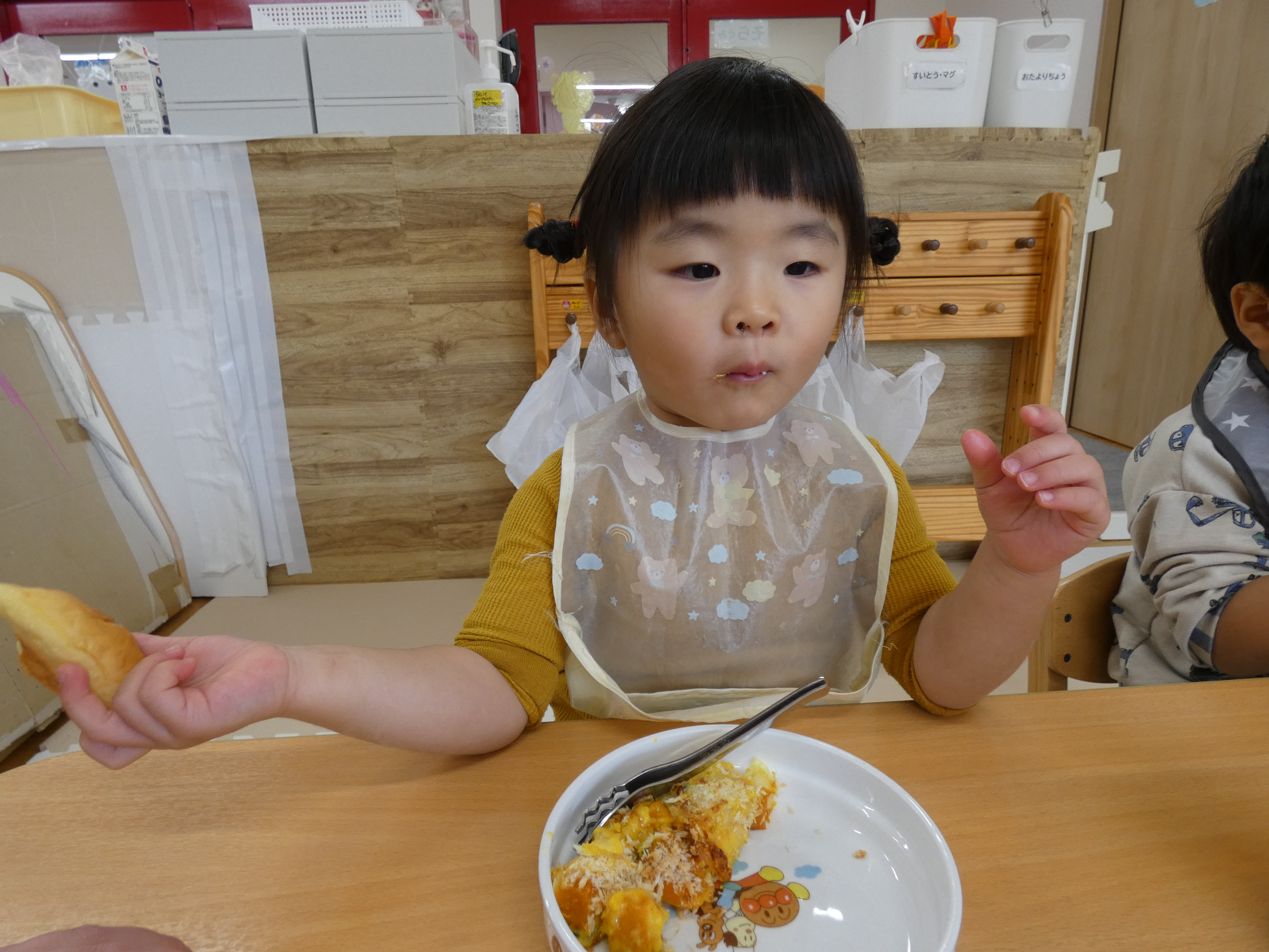 ひも通しの活動をしたあと、おいしい給食を食べました。水曜日はパンの日。美木多幼稚園特注の美味しいパンをいただきました。