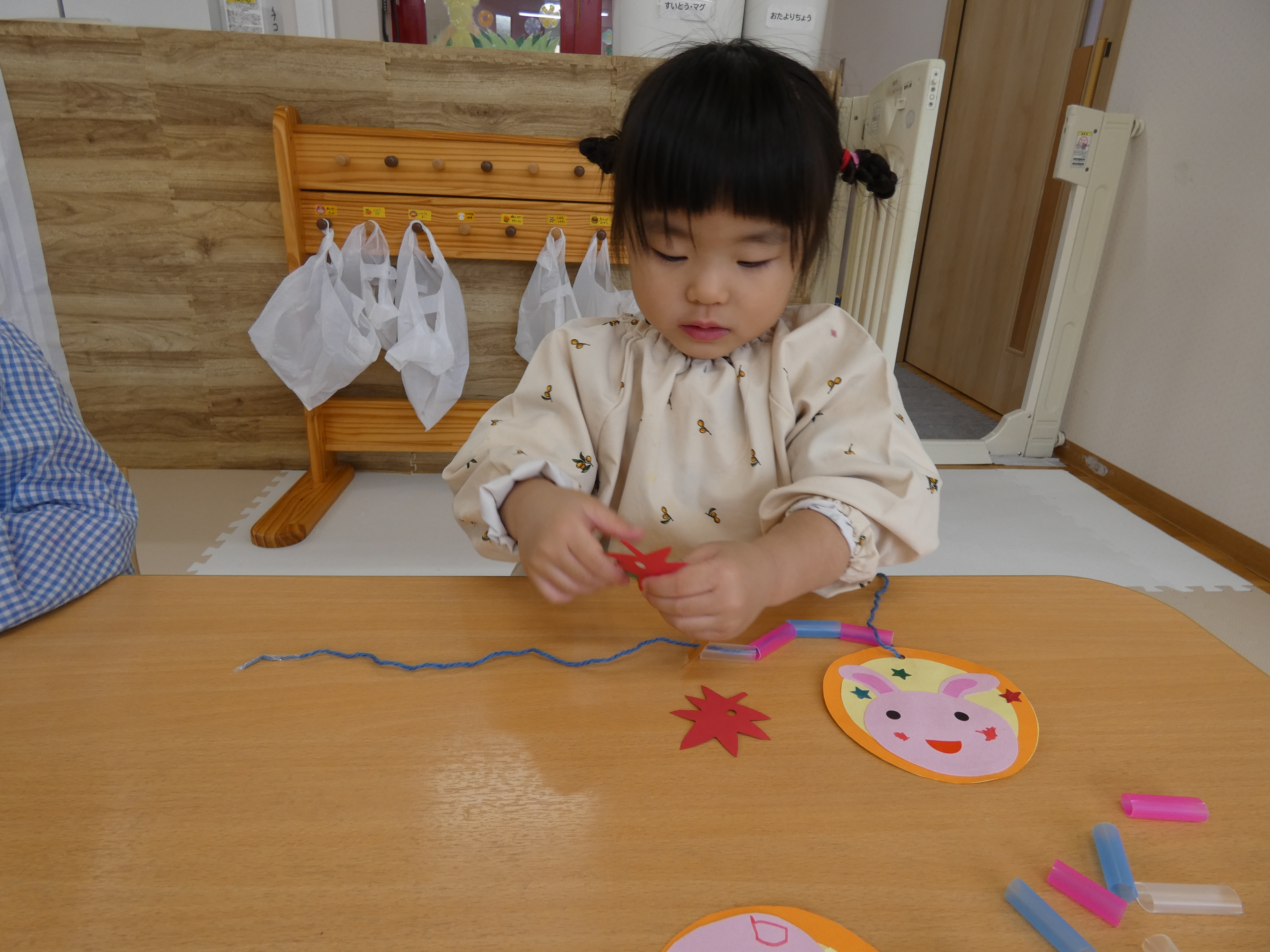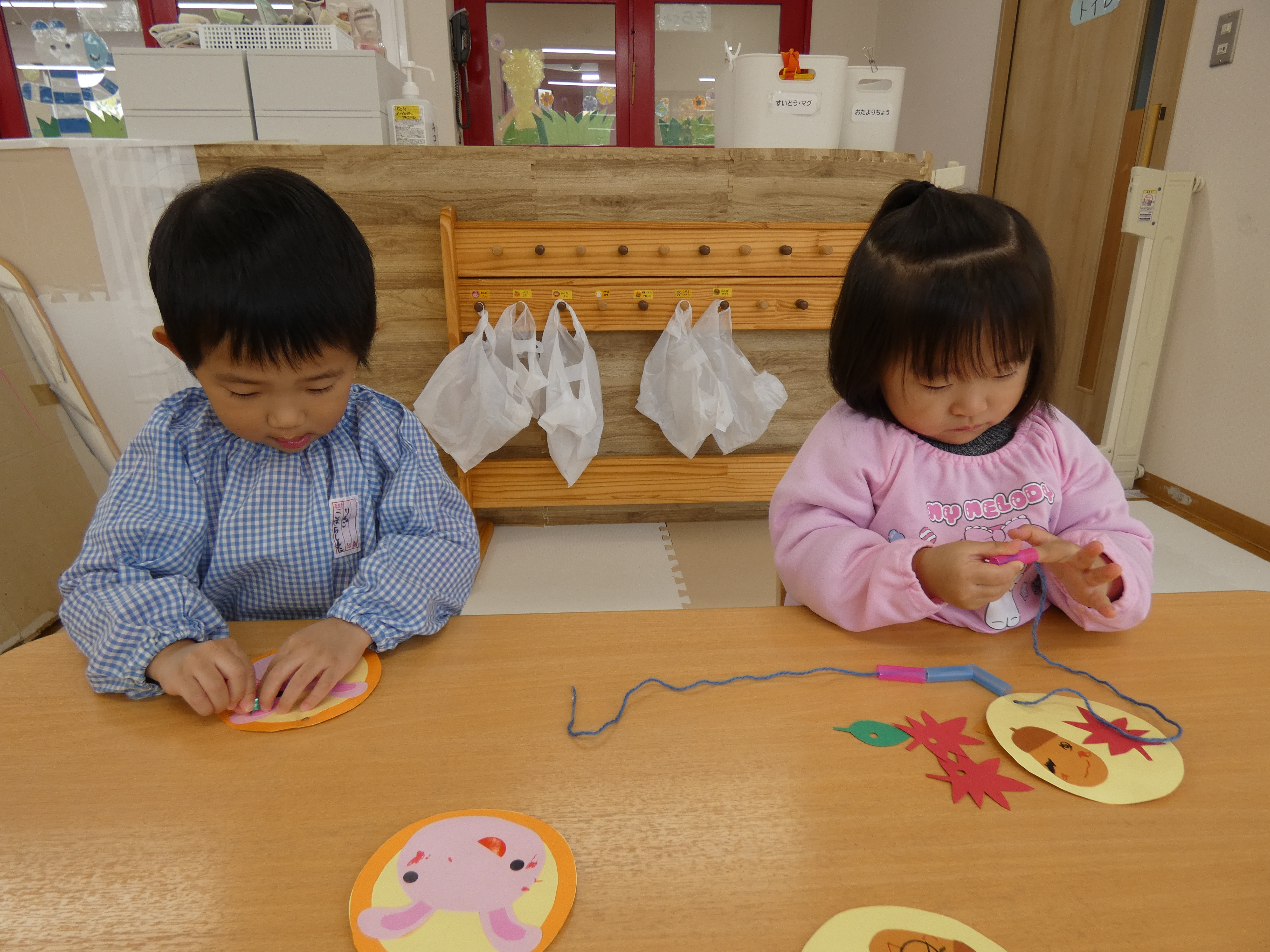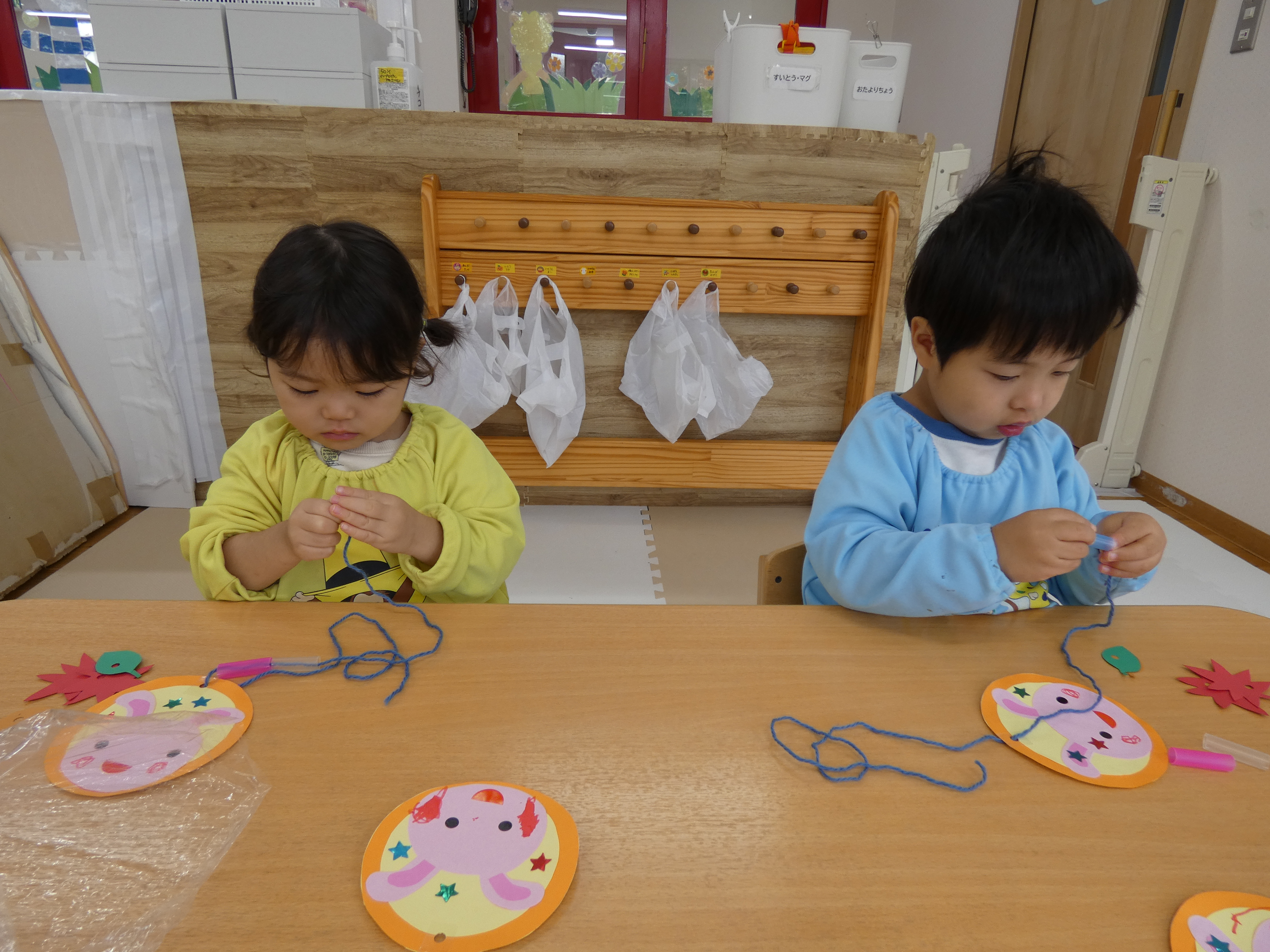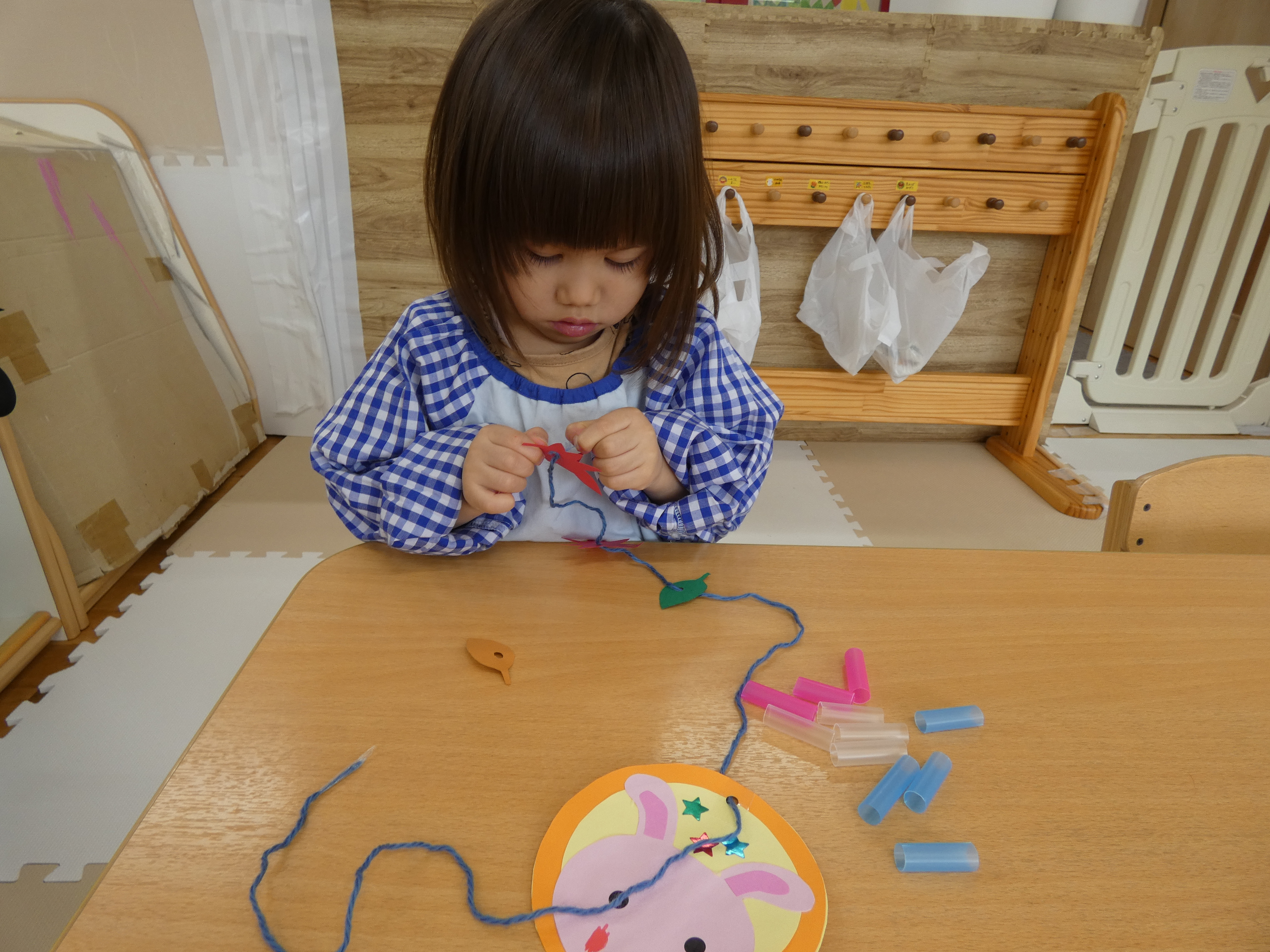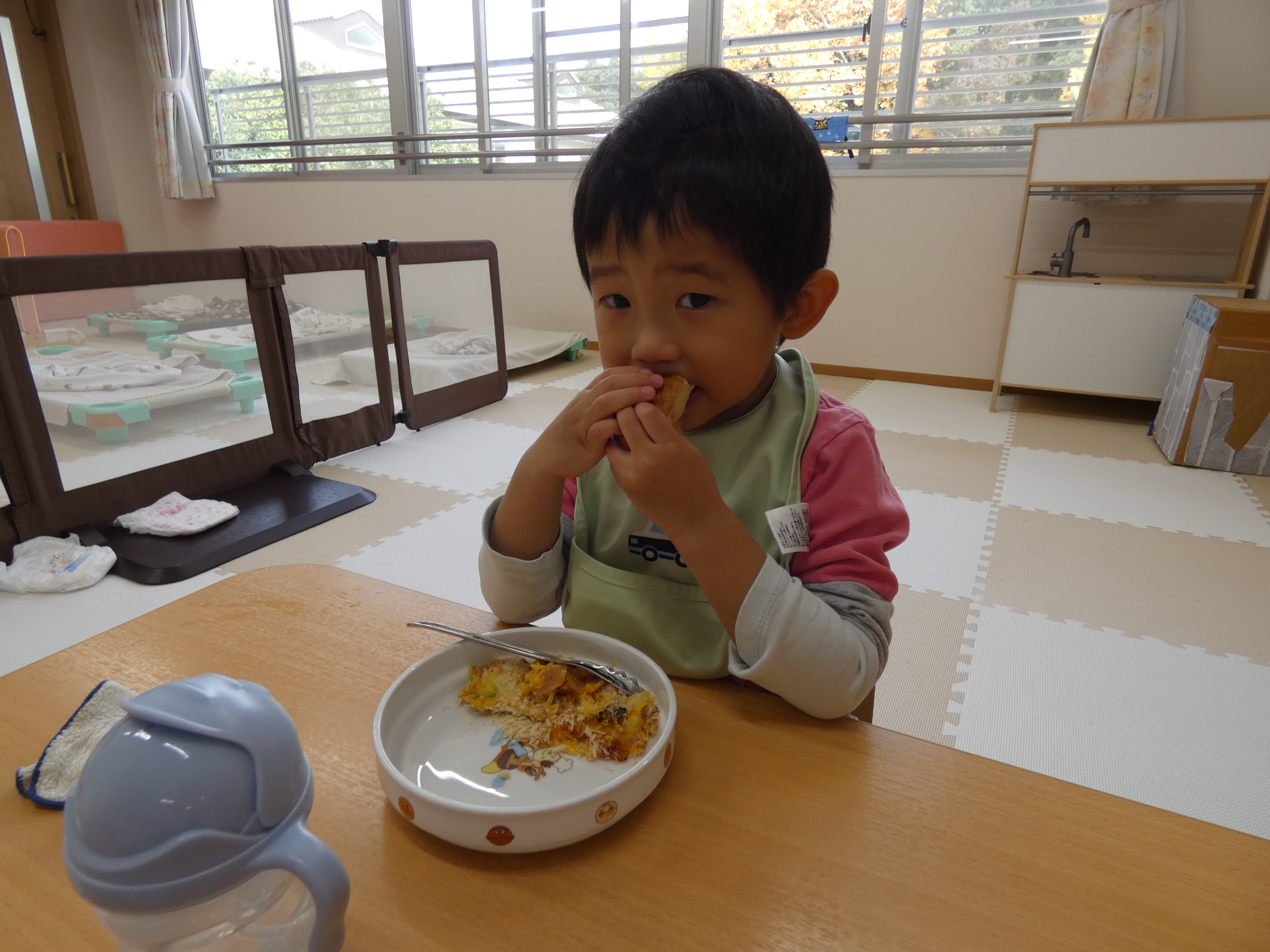 ひも通しの活動をしたあと、おいしい給食を食べました。水曜日はパンの日。美木多幼稚園特注の美味しいパンをいただきました。