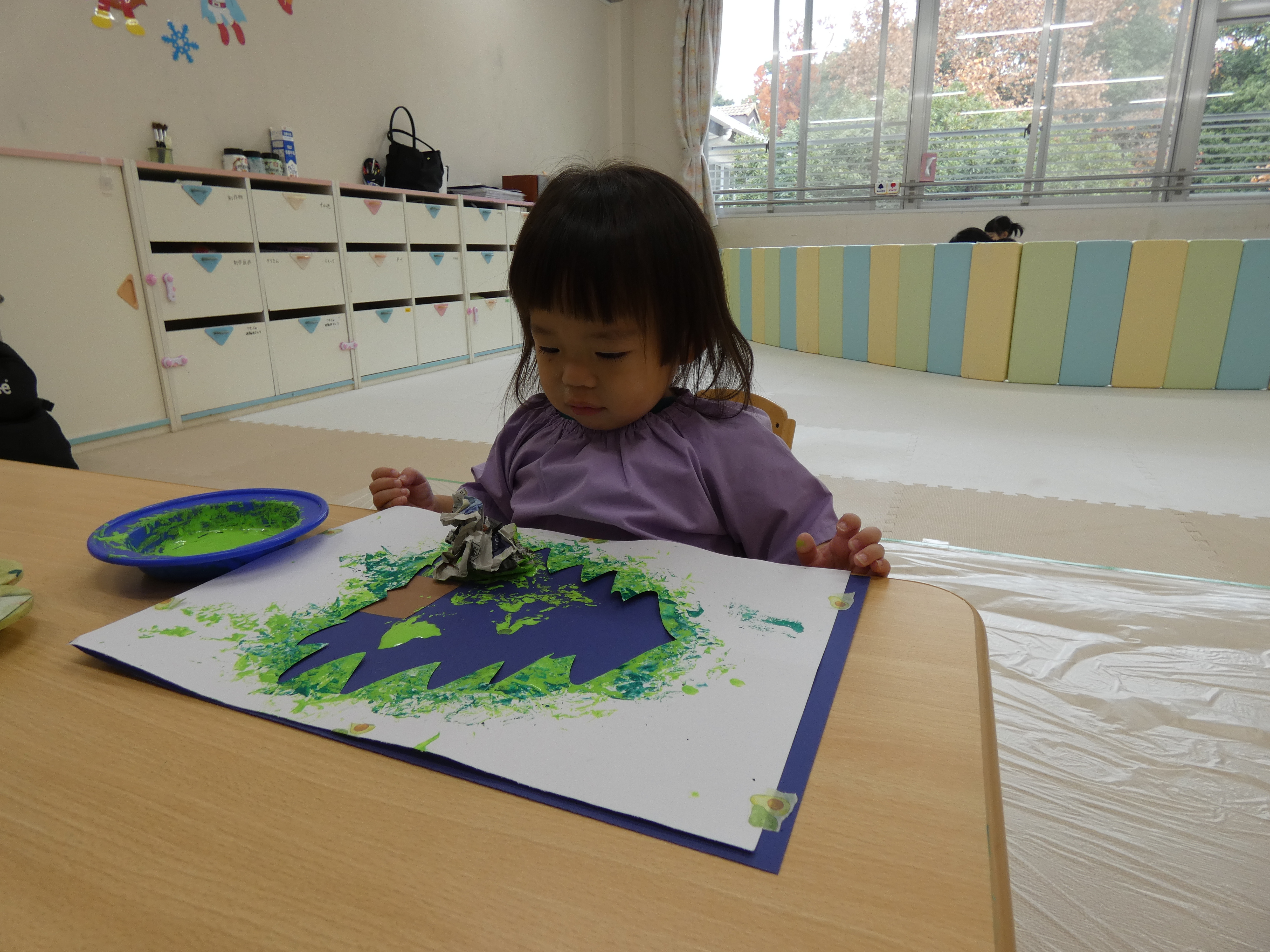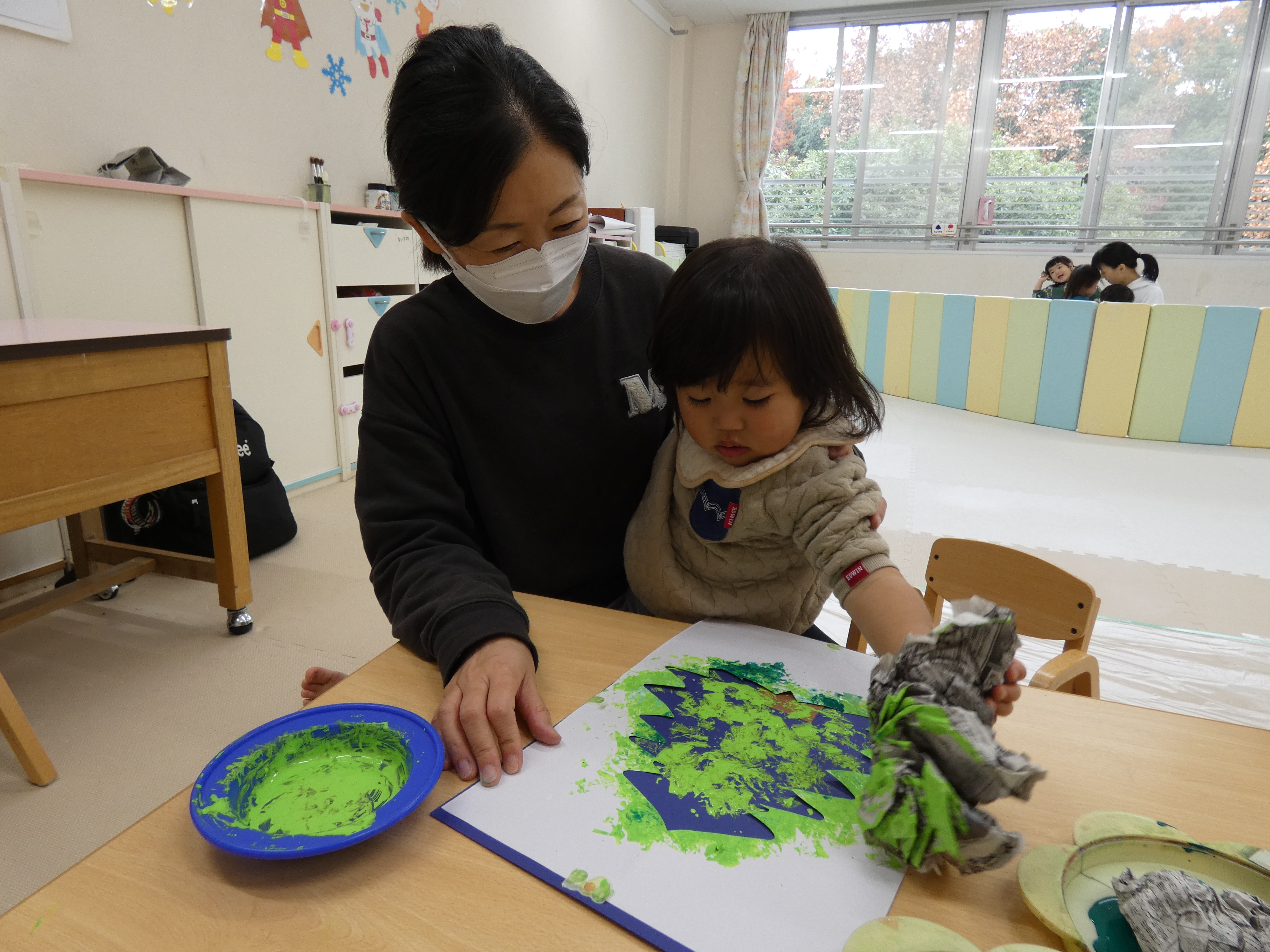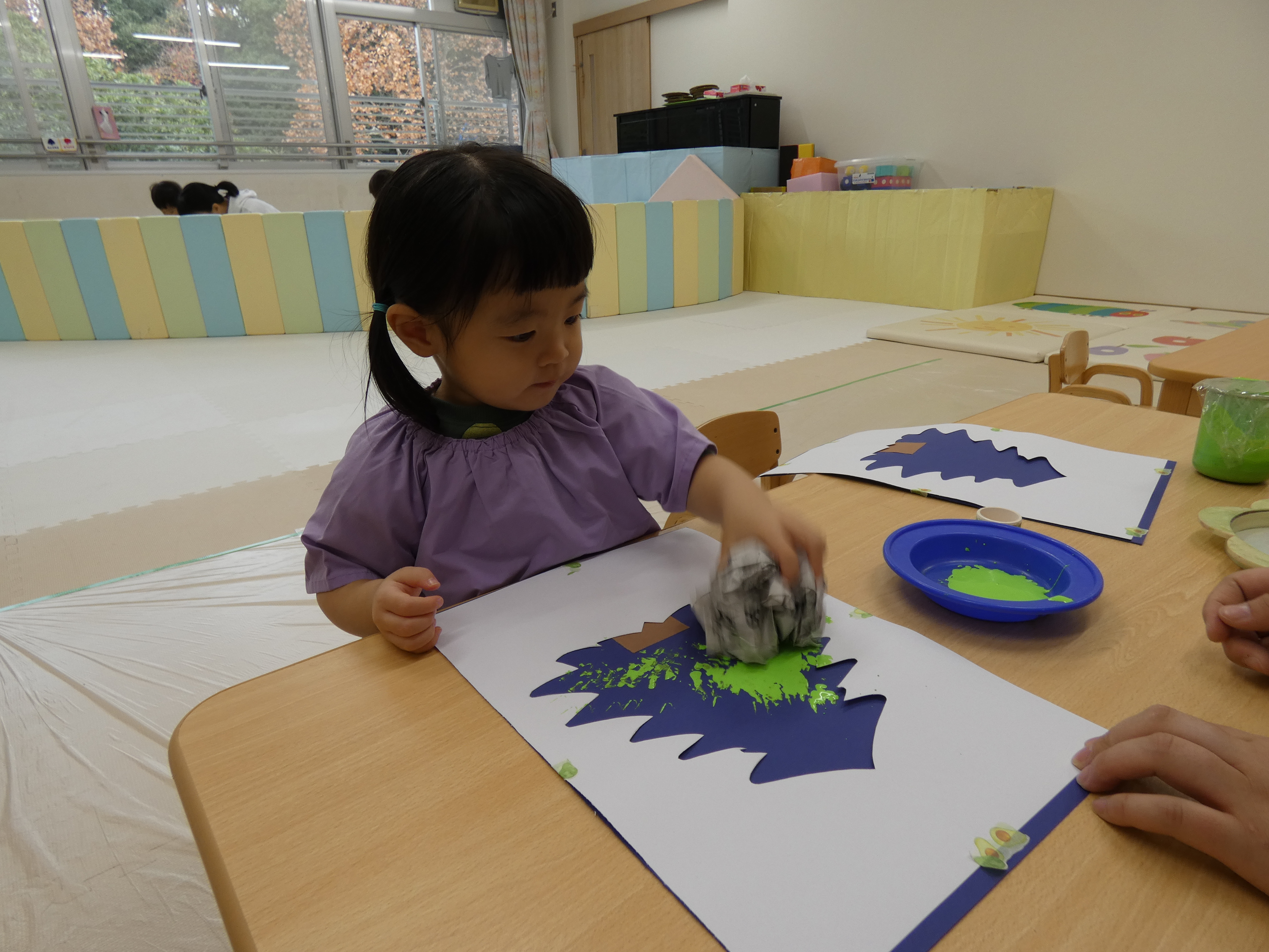 クリスマス制作を頑張った今日のつき組さんです。ステンシル風にツリーを作りました。
