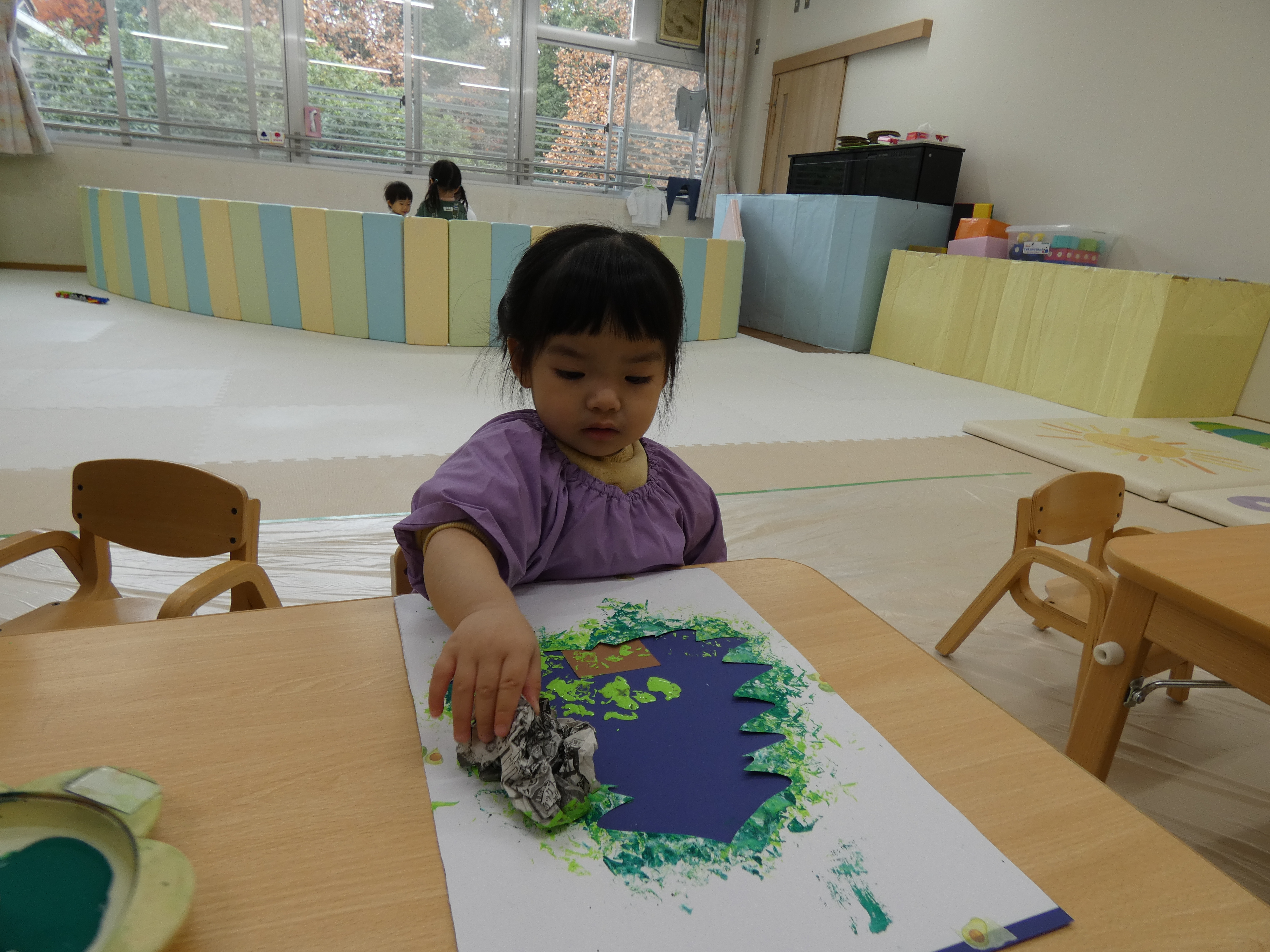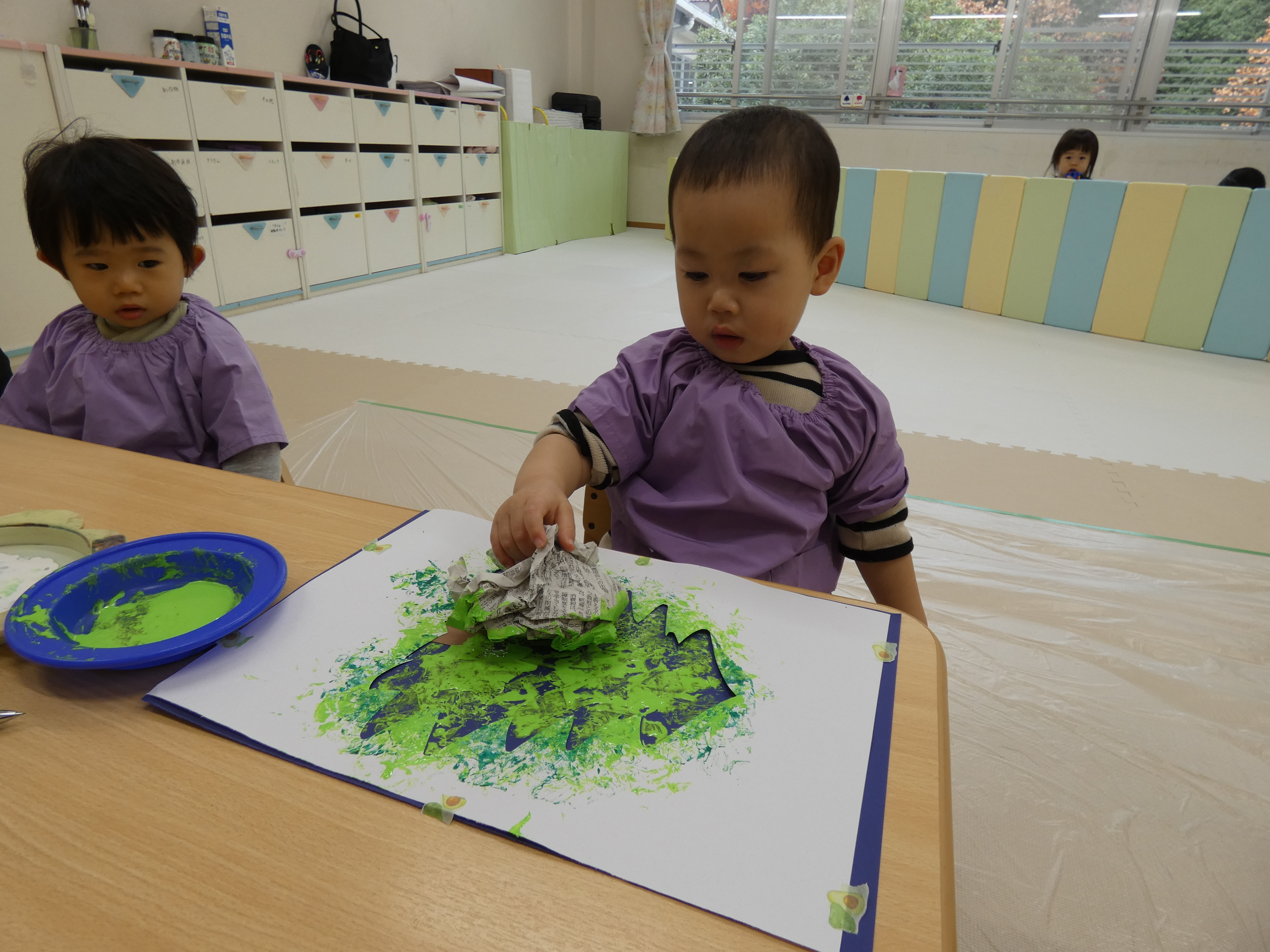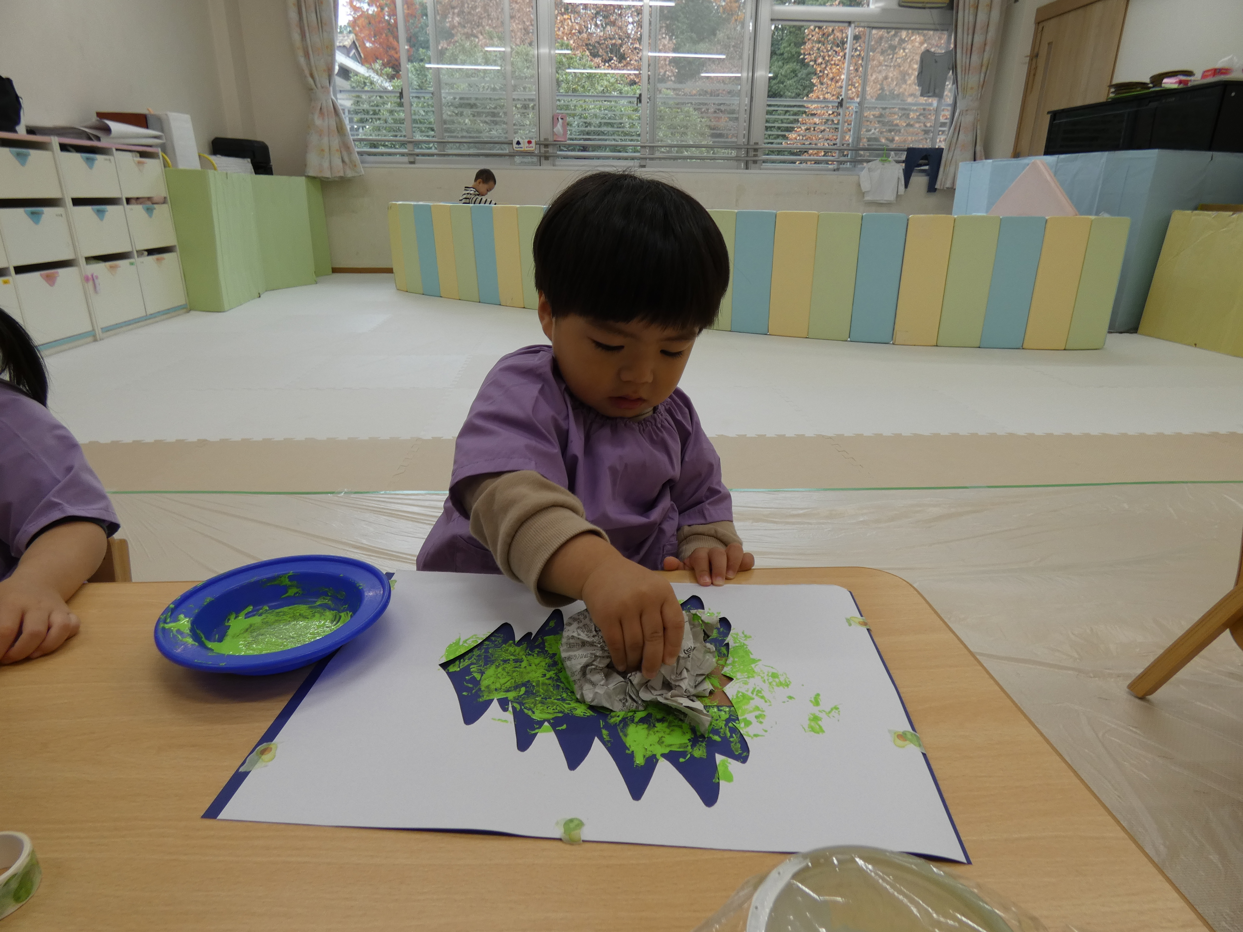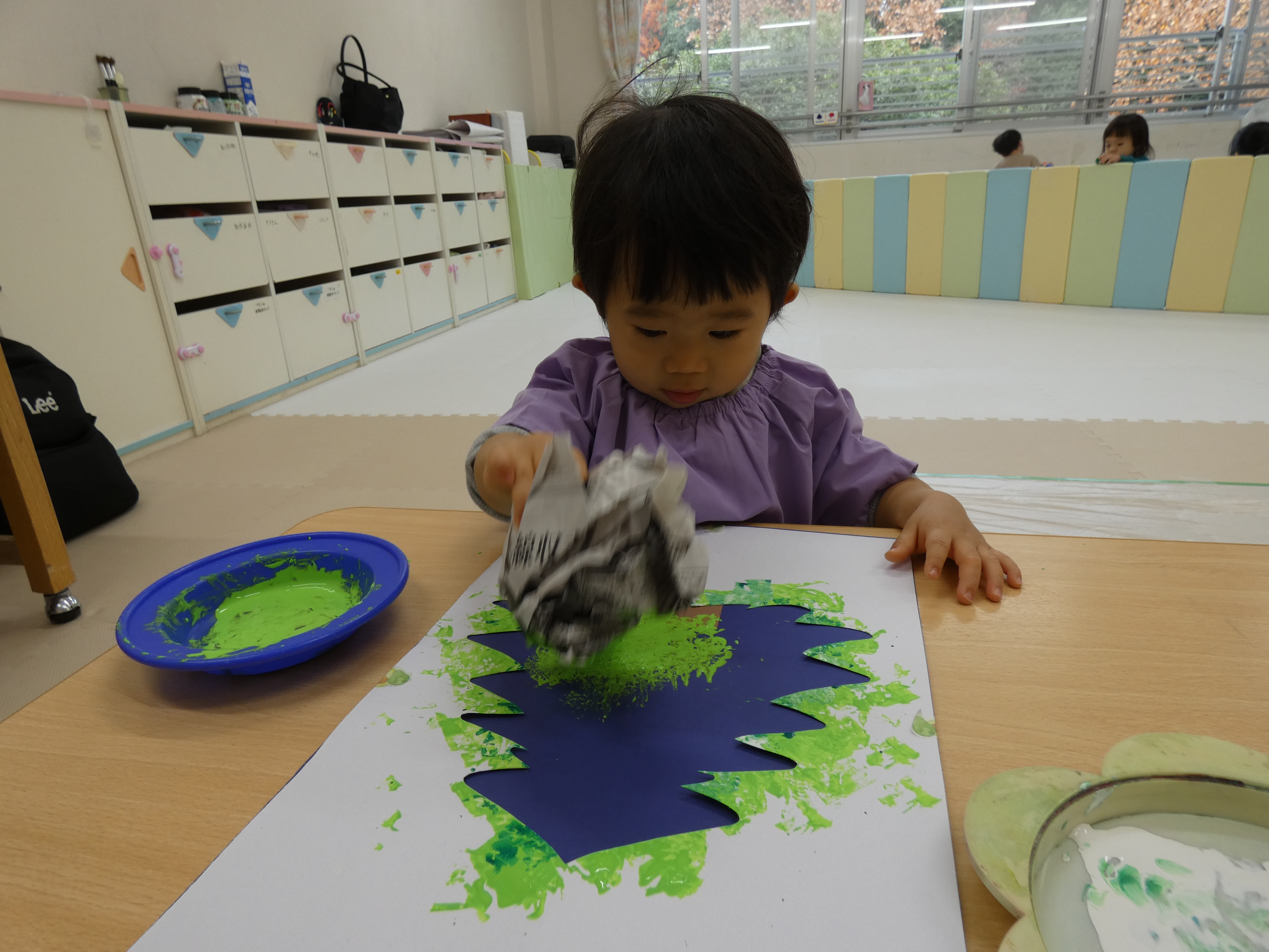 クリスマス制作を頑張った今日のつき組さんです。ステンシル風にツリーを作りました。