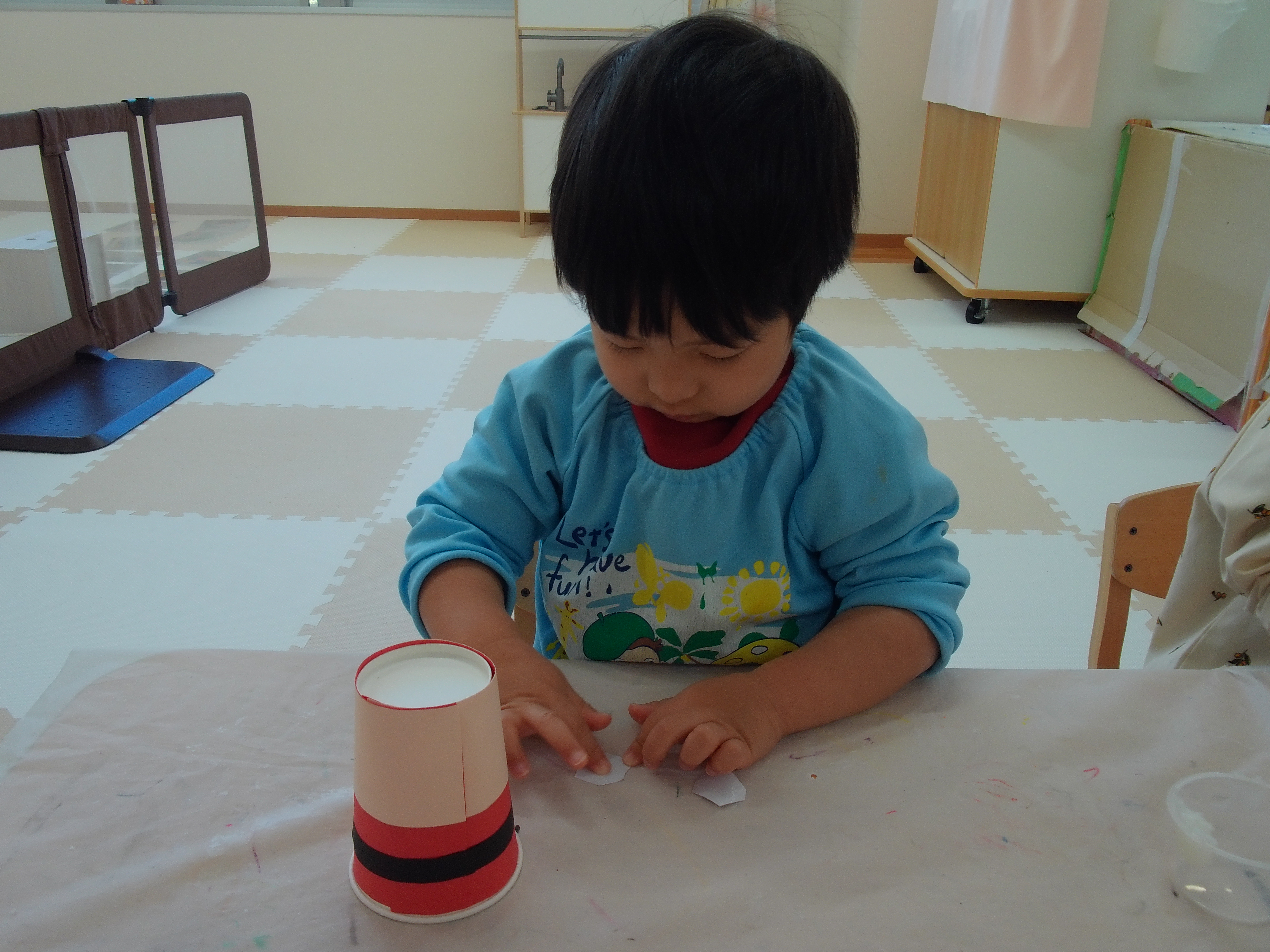 そらぐみはサンタさんを作っています。はさみ、のりを使ってサンタさんや飾りつけをしました。
