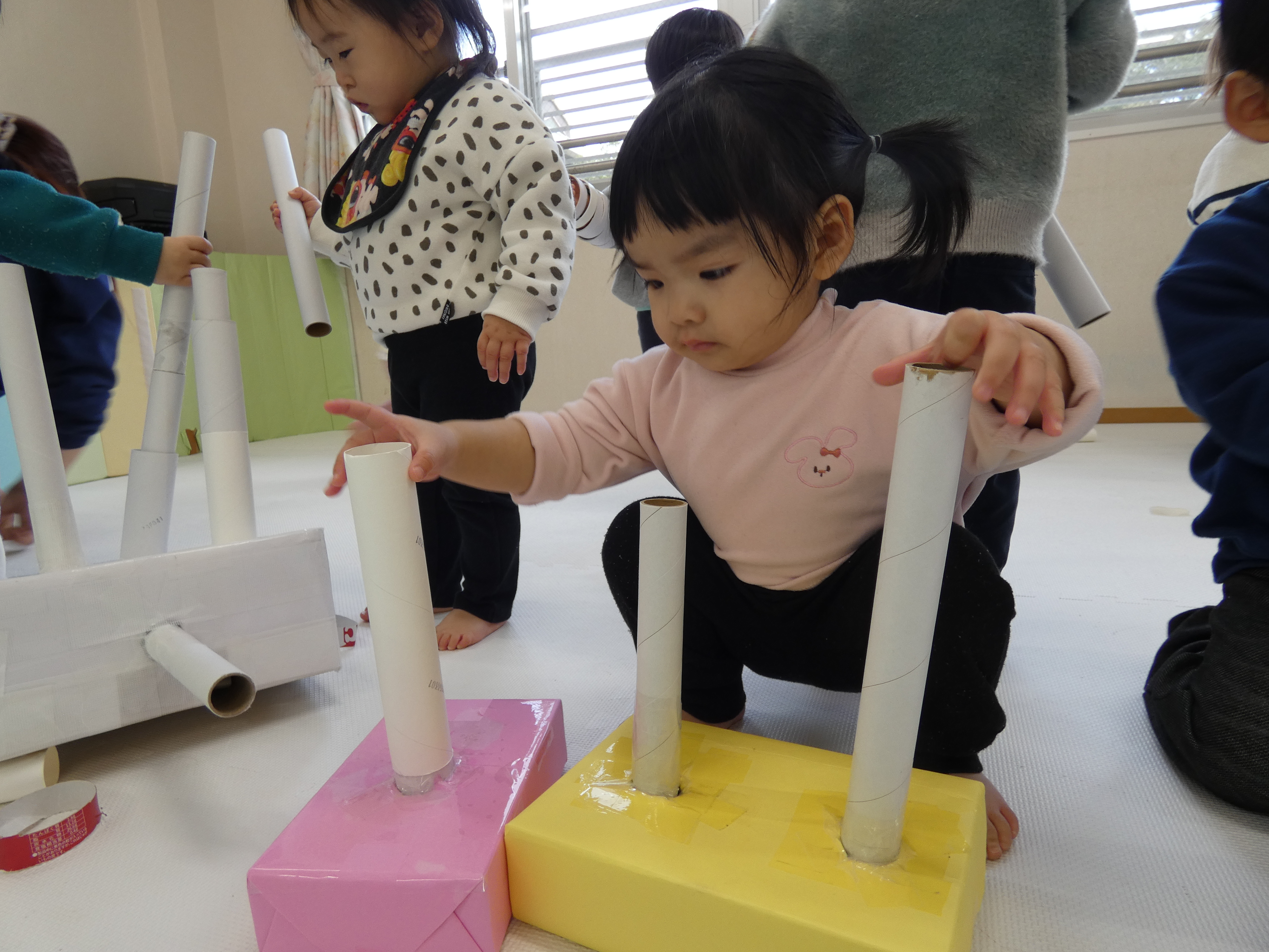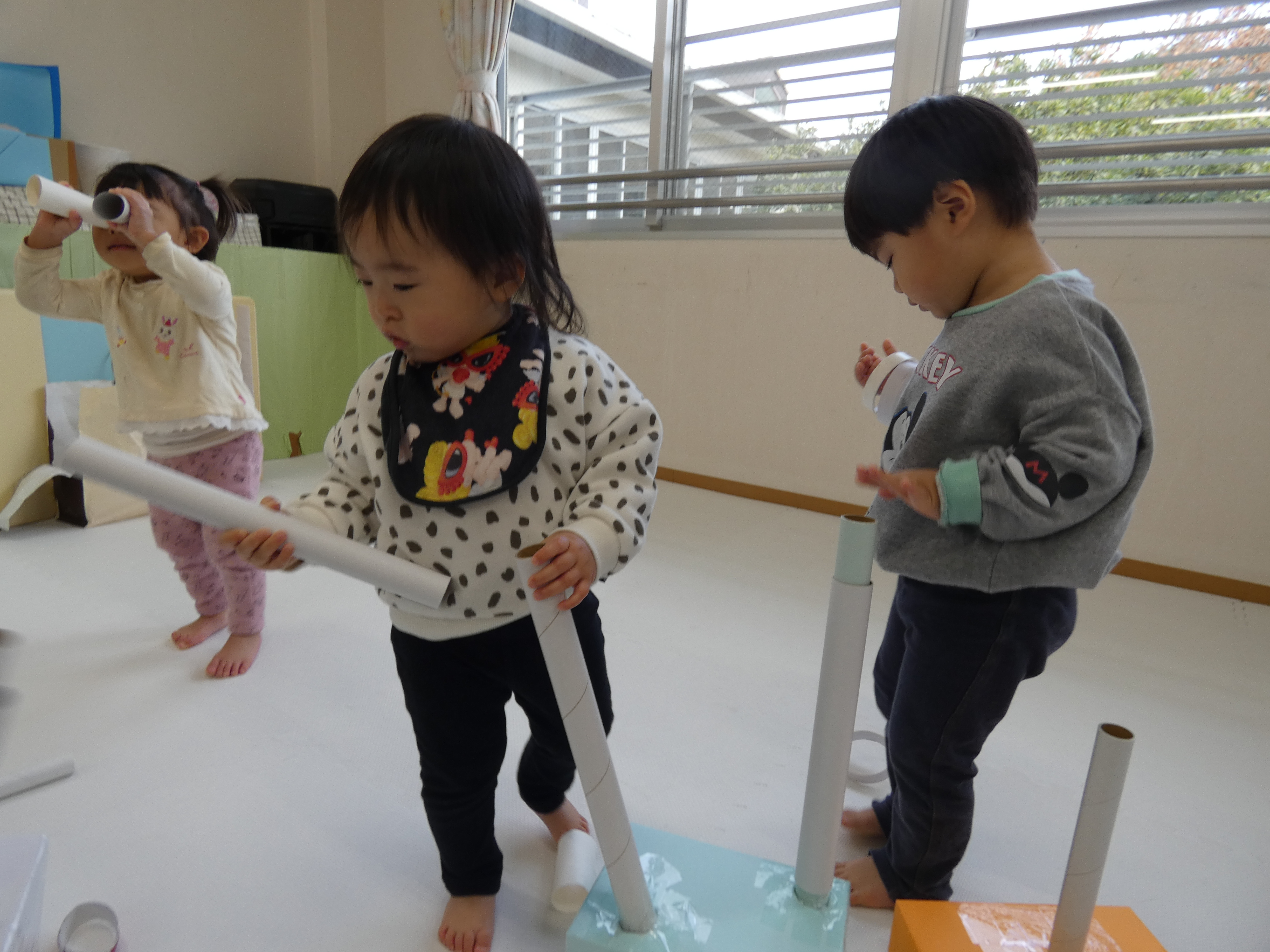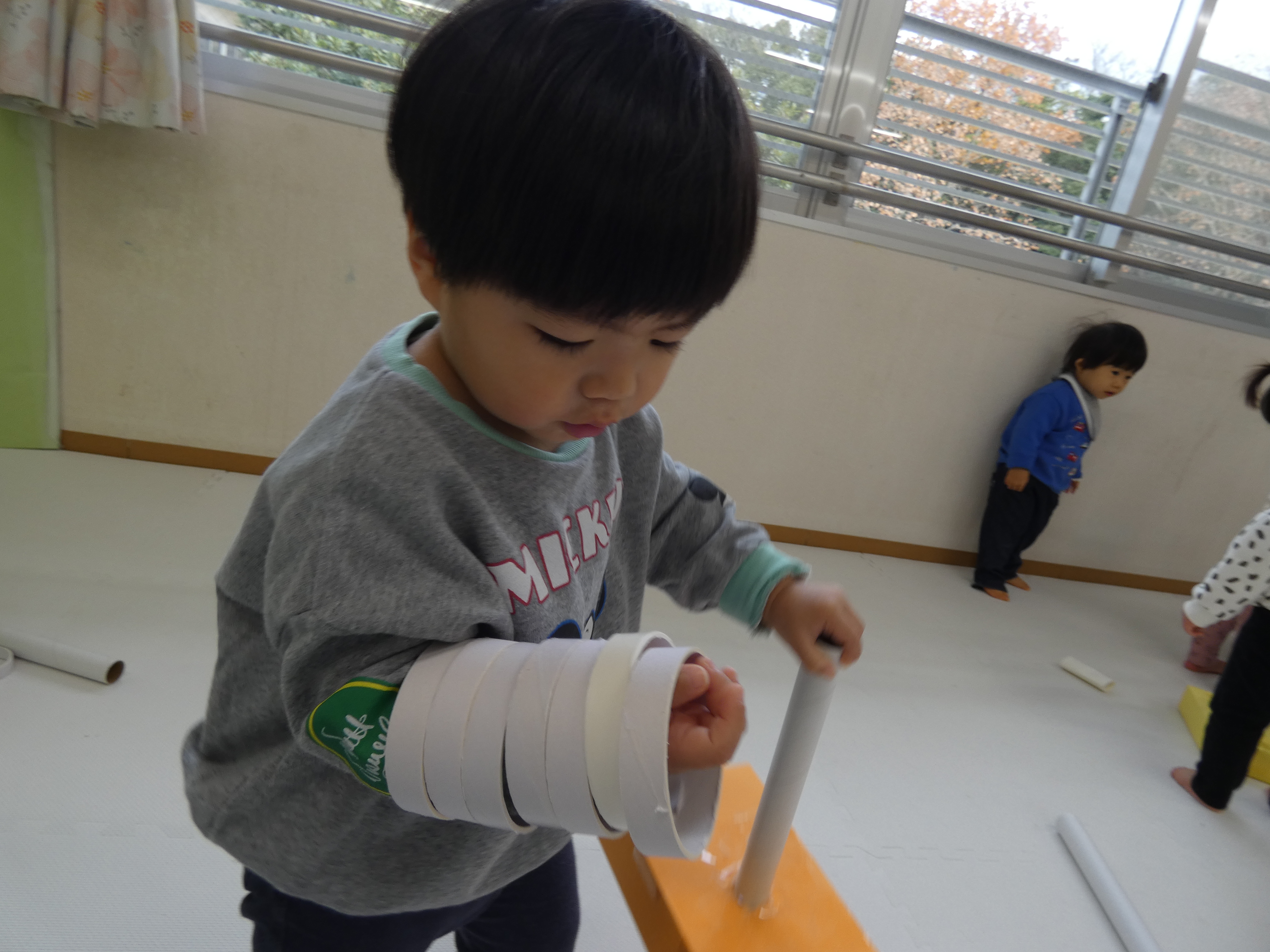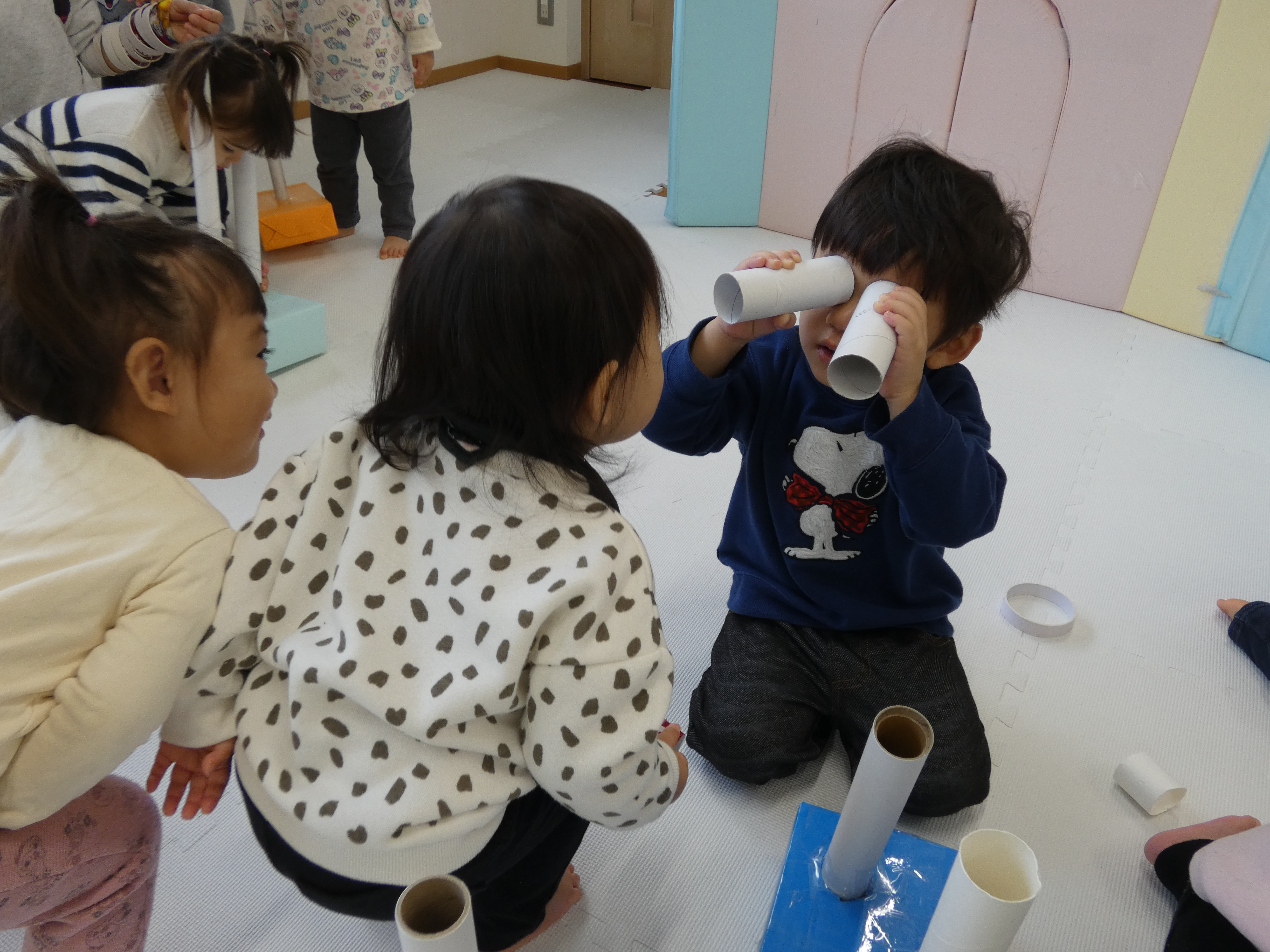 15 12月 2025 美木多 幼稚園 美木多チコスブログ 2025年12月15日 美木多 幼稚園 芯材遊び(つき組) いろいろな長さのラップそ芯で遊びました。つなげたり、さしたり、覗いたり、五感をフルに使って遊びました。