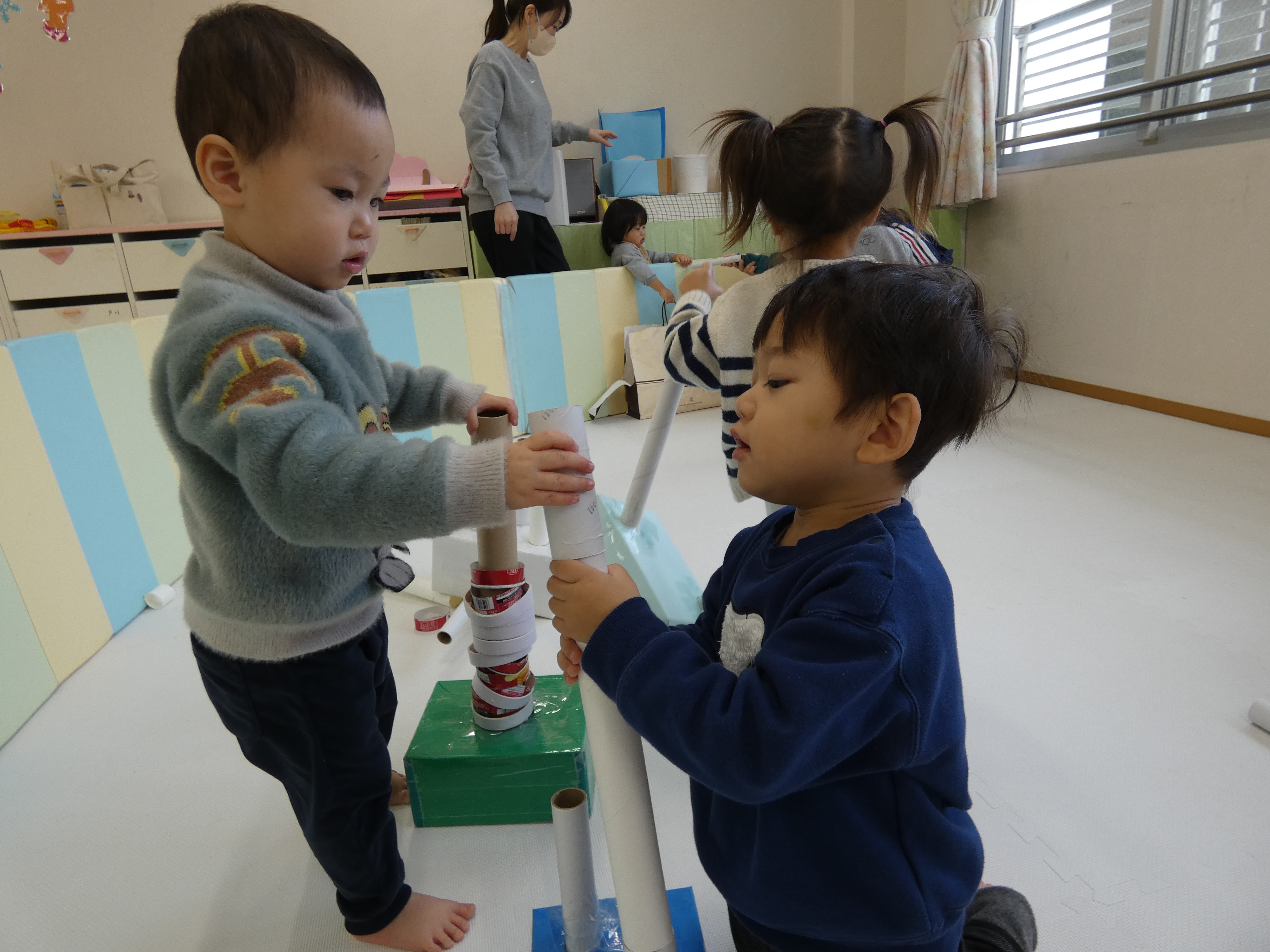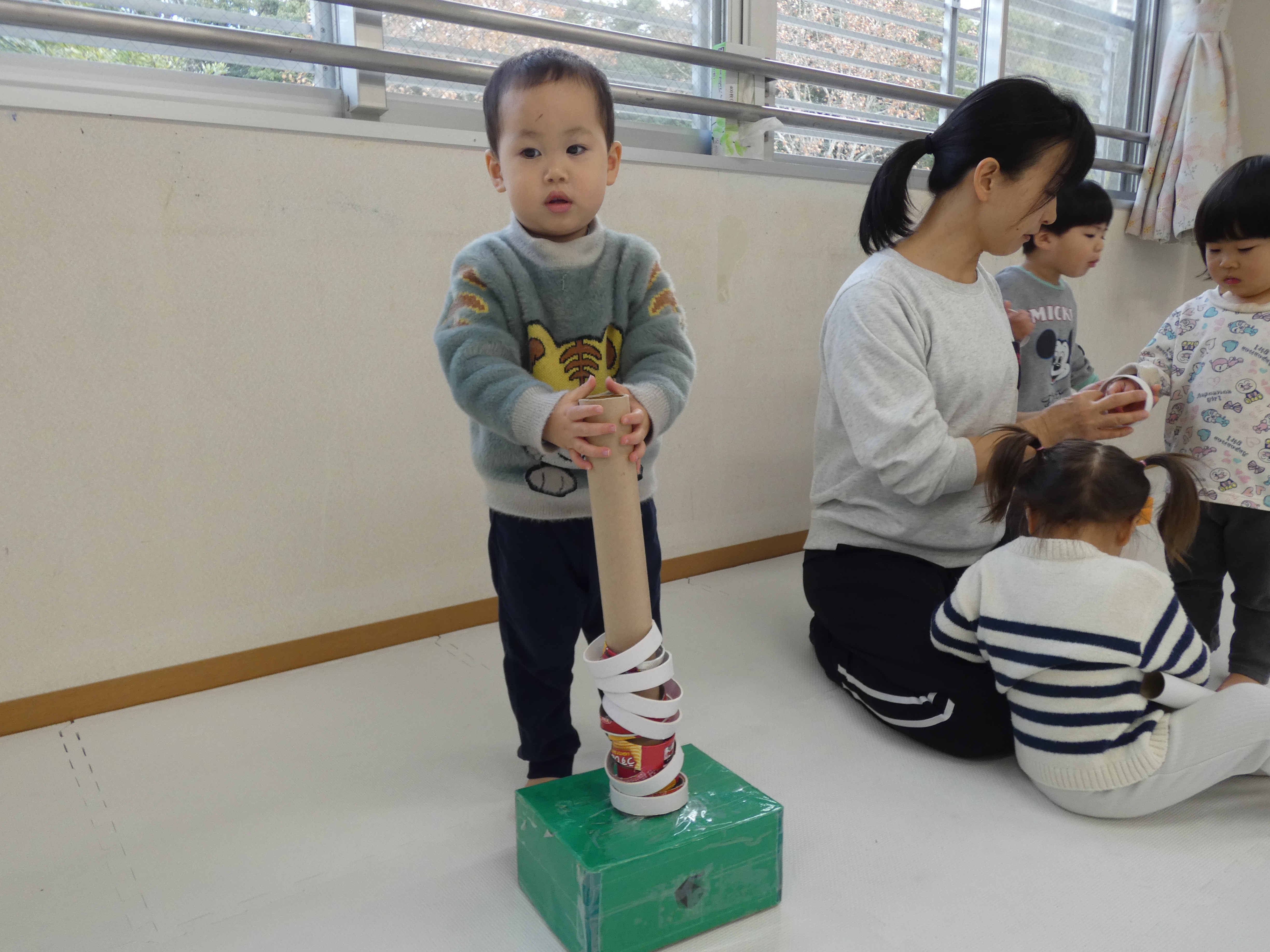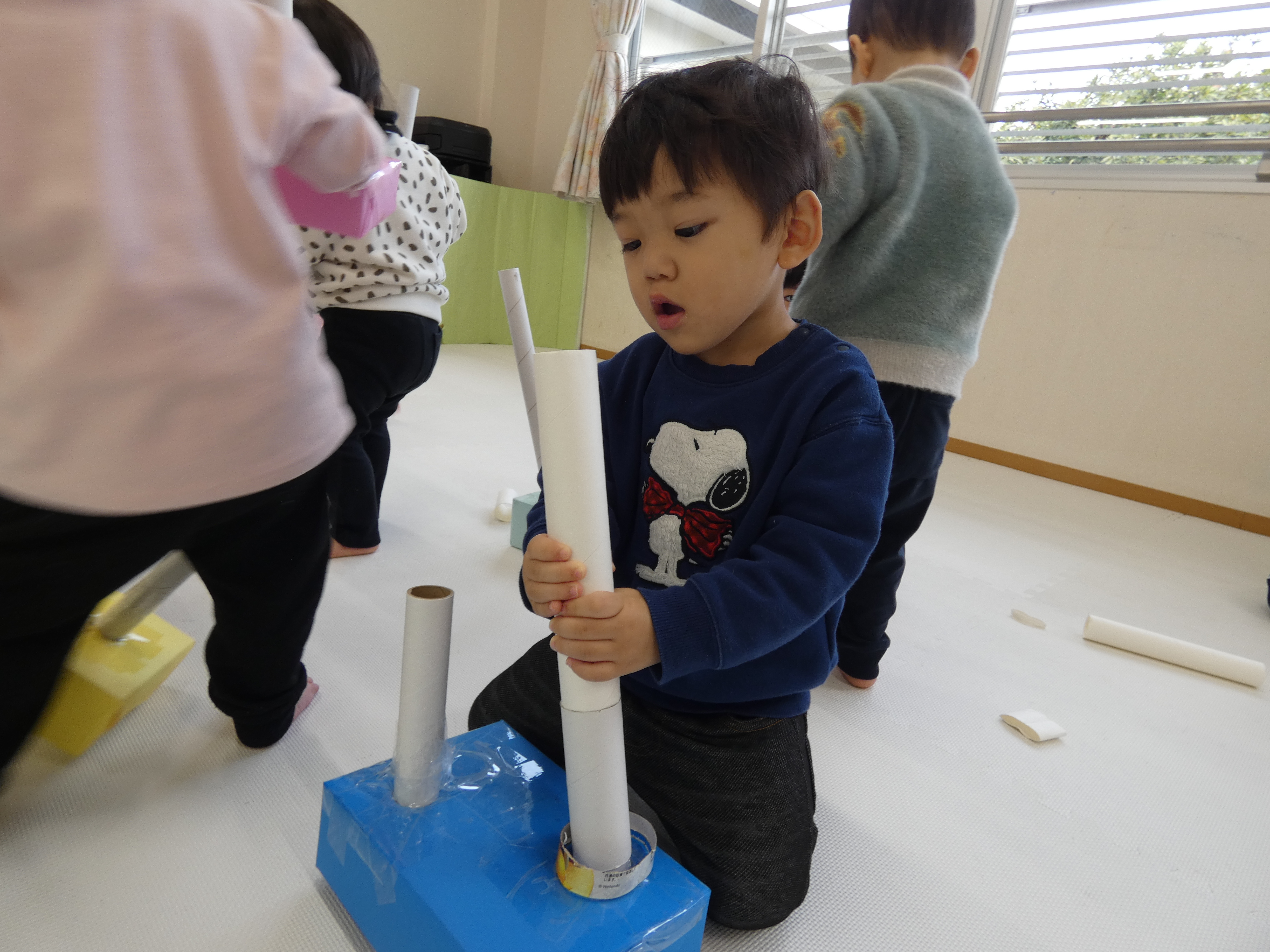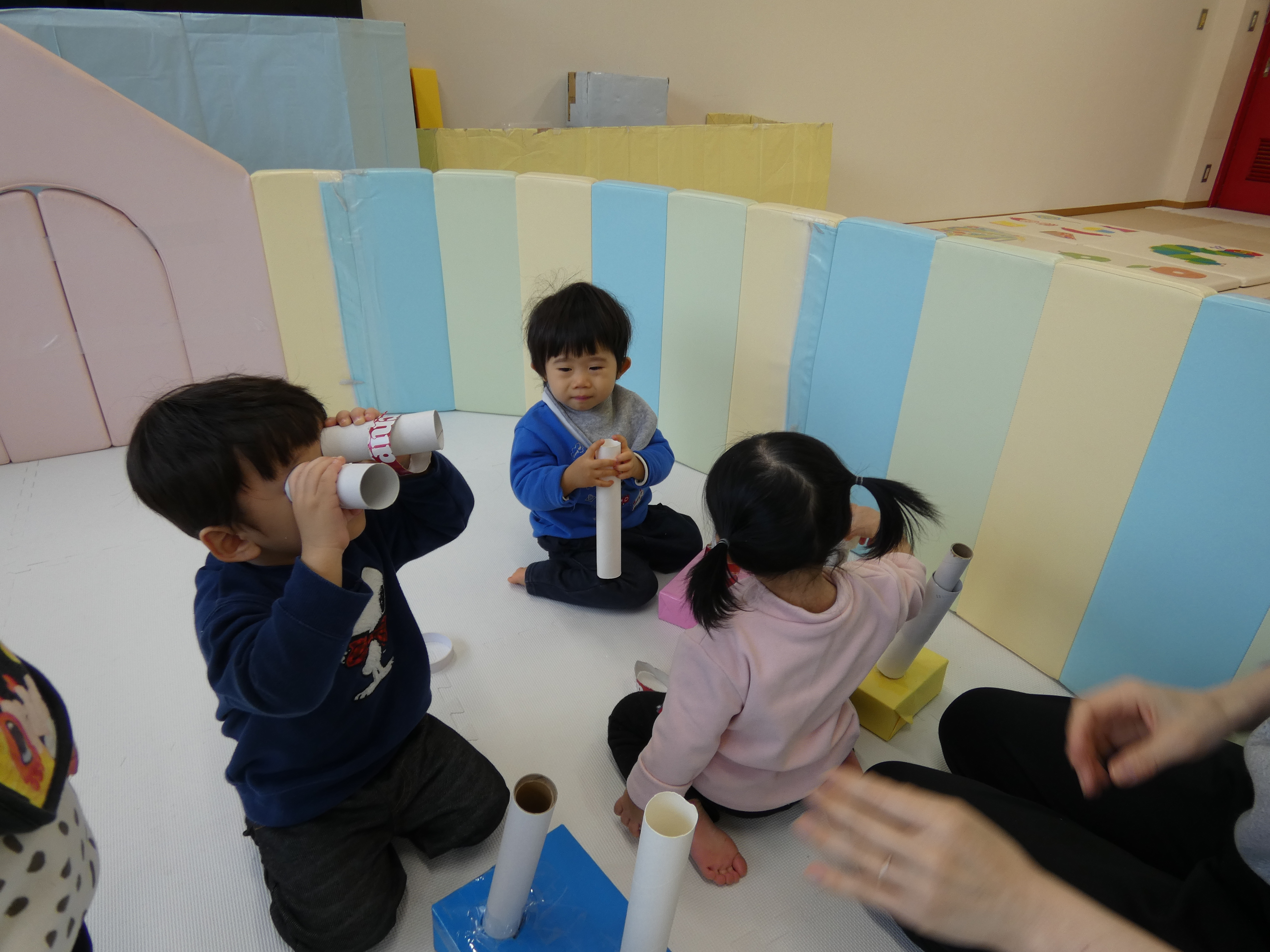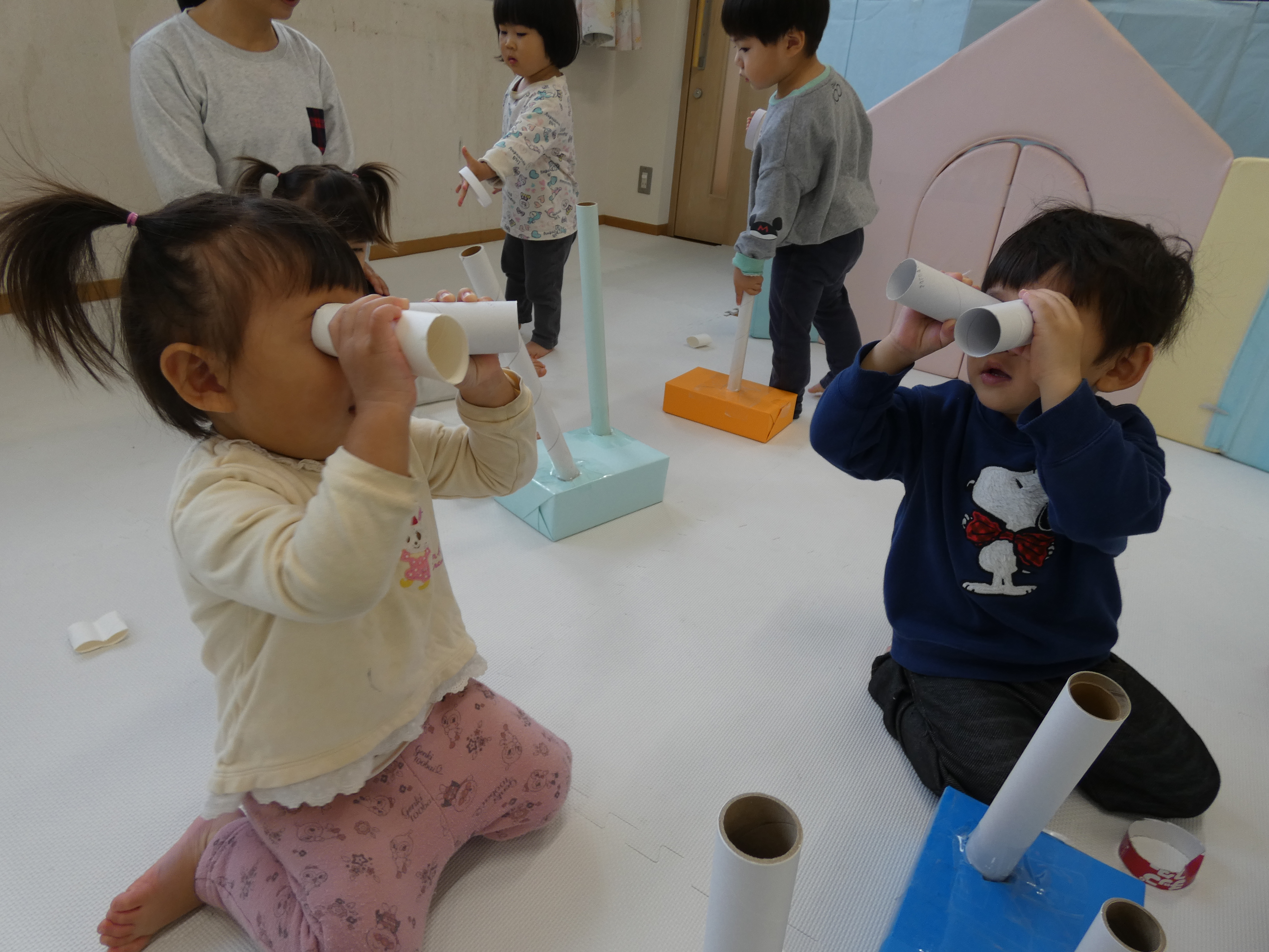15 12月 2025 美木多 幼稚園 美木多チコスブログ 2025年12月15日 美木多 幼稚園 芯材遊び(つき組) いろいろな長さのラップそ芯で遊びました。つなげたり、さしたり、覗いたり、五感をフルに使って遊びました。