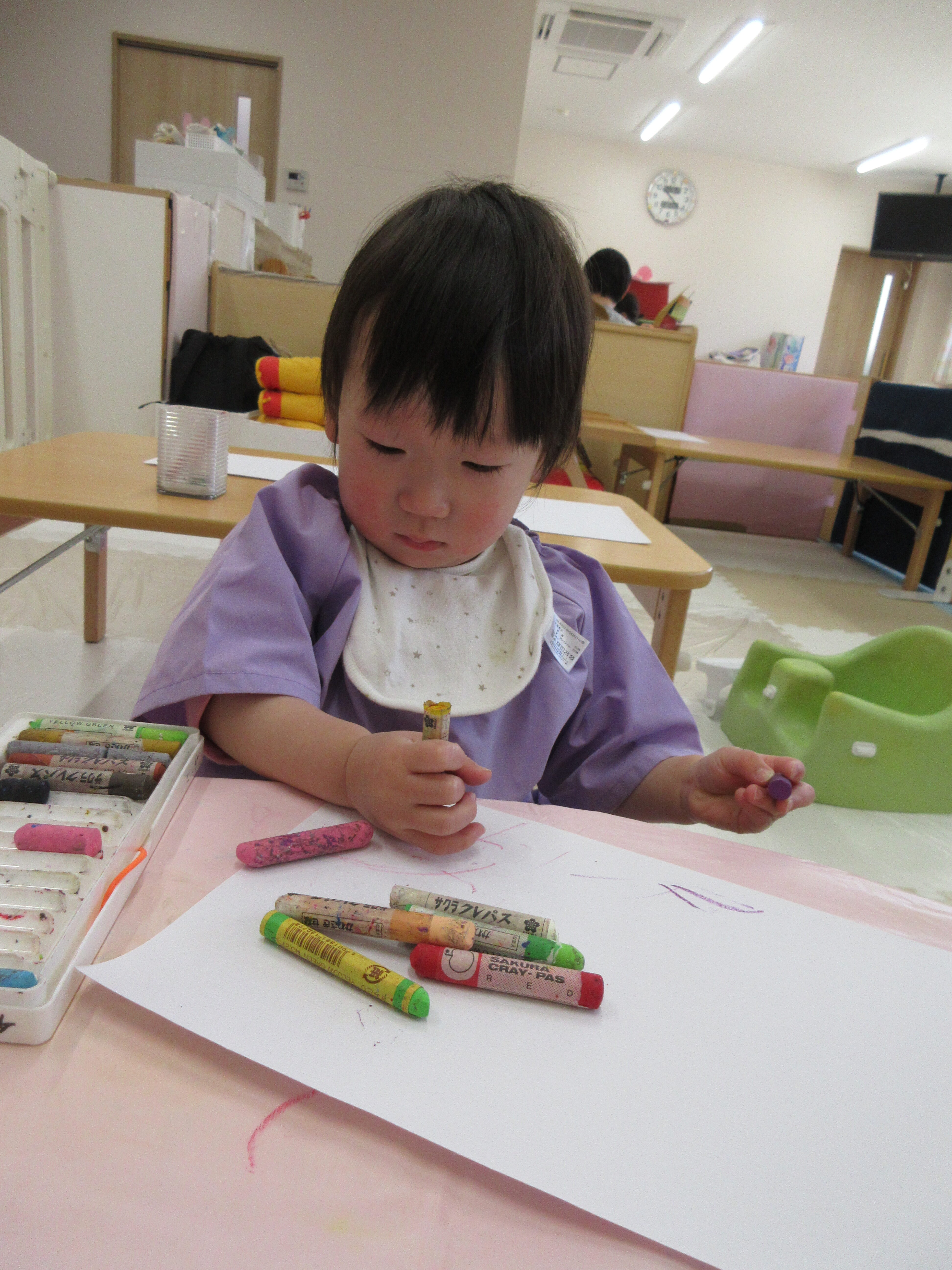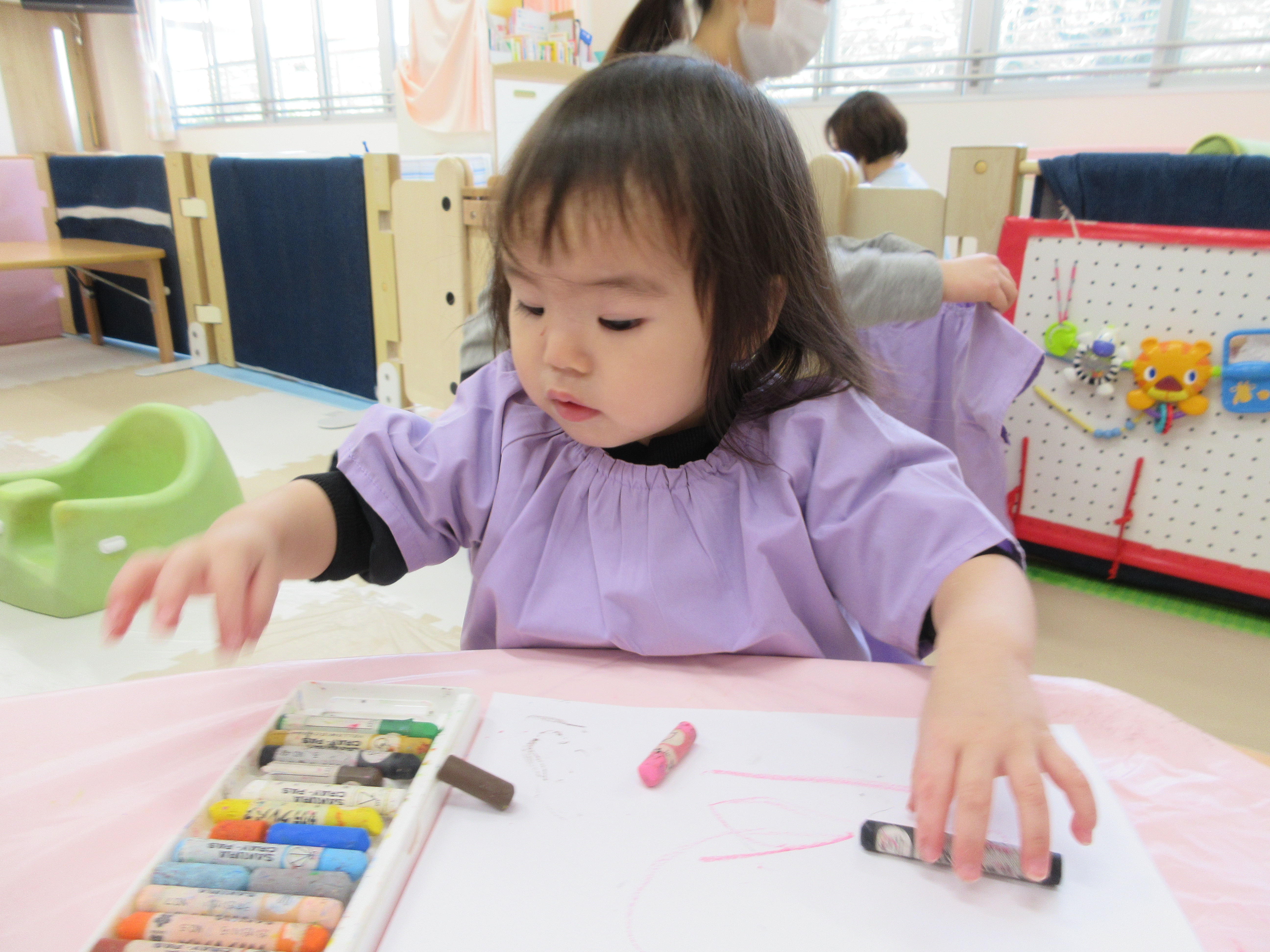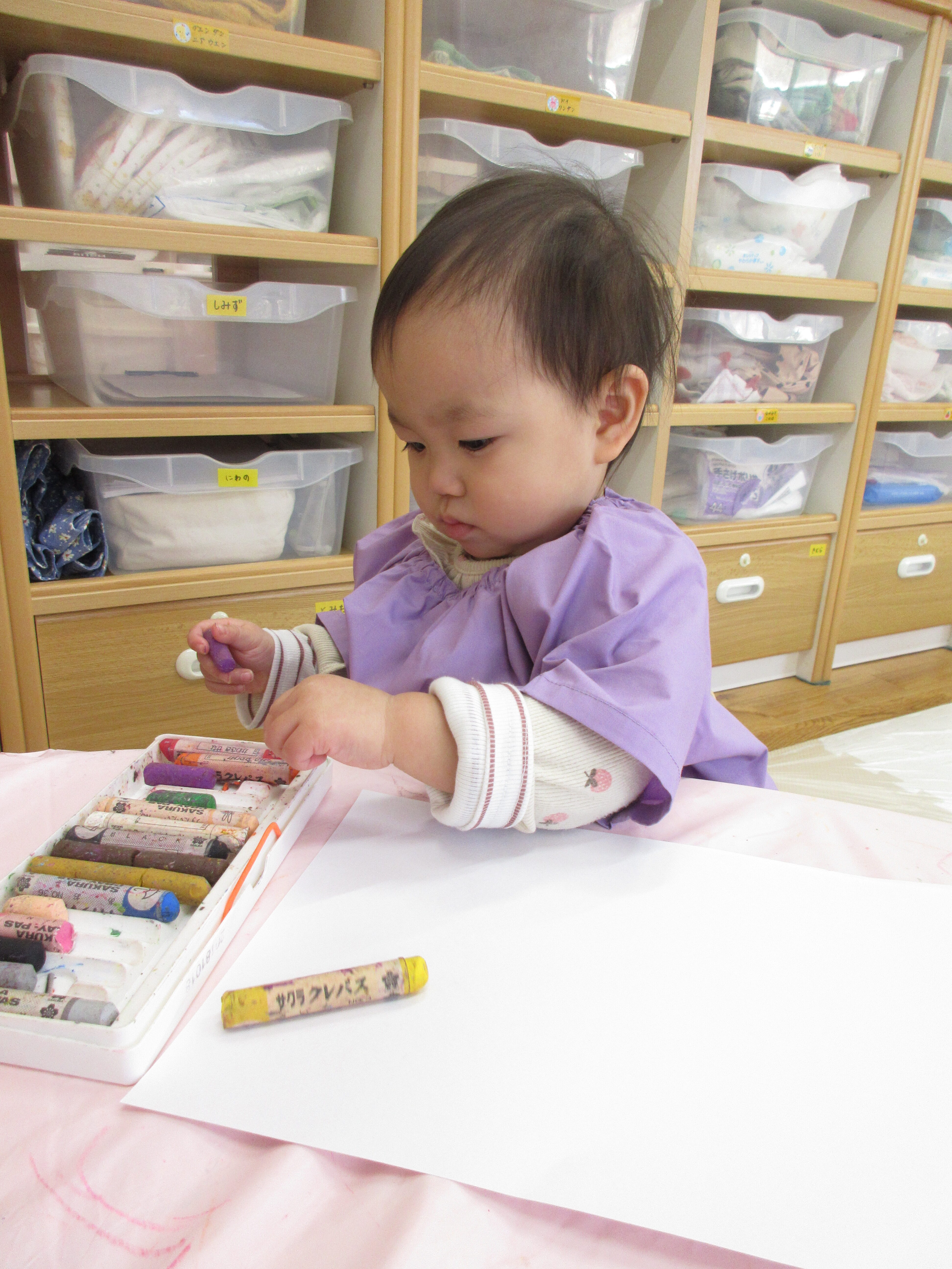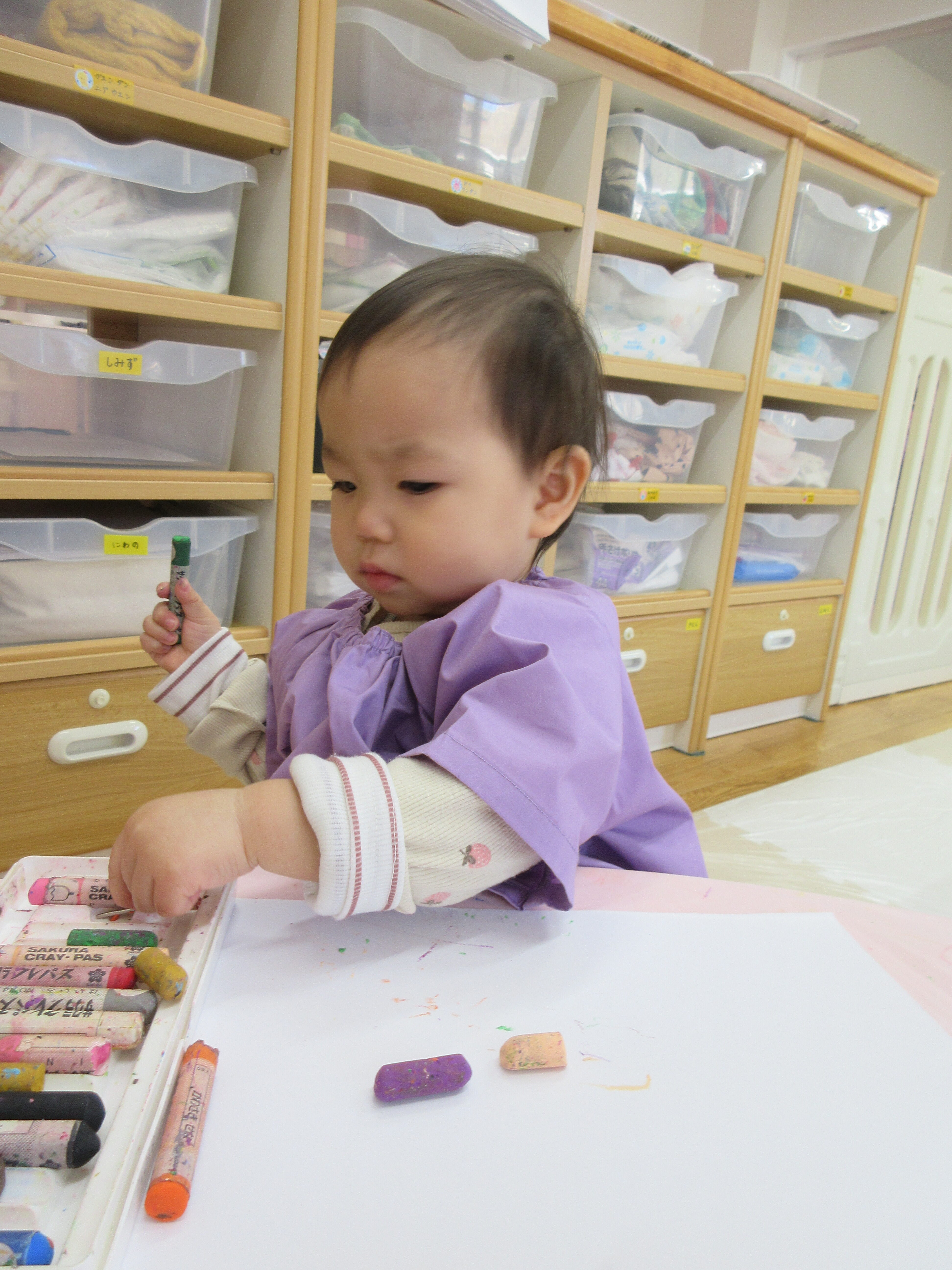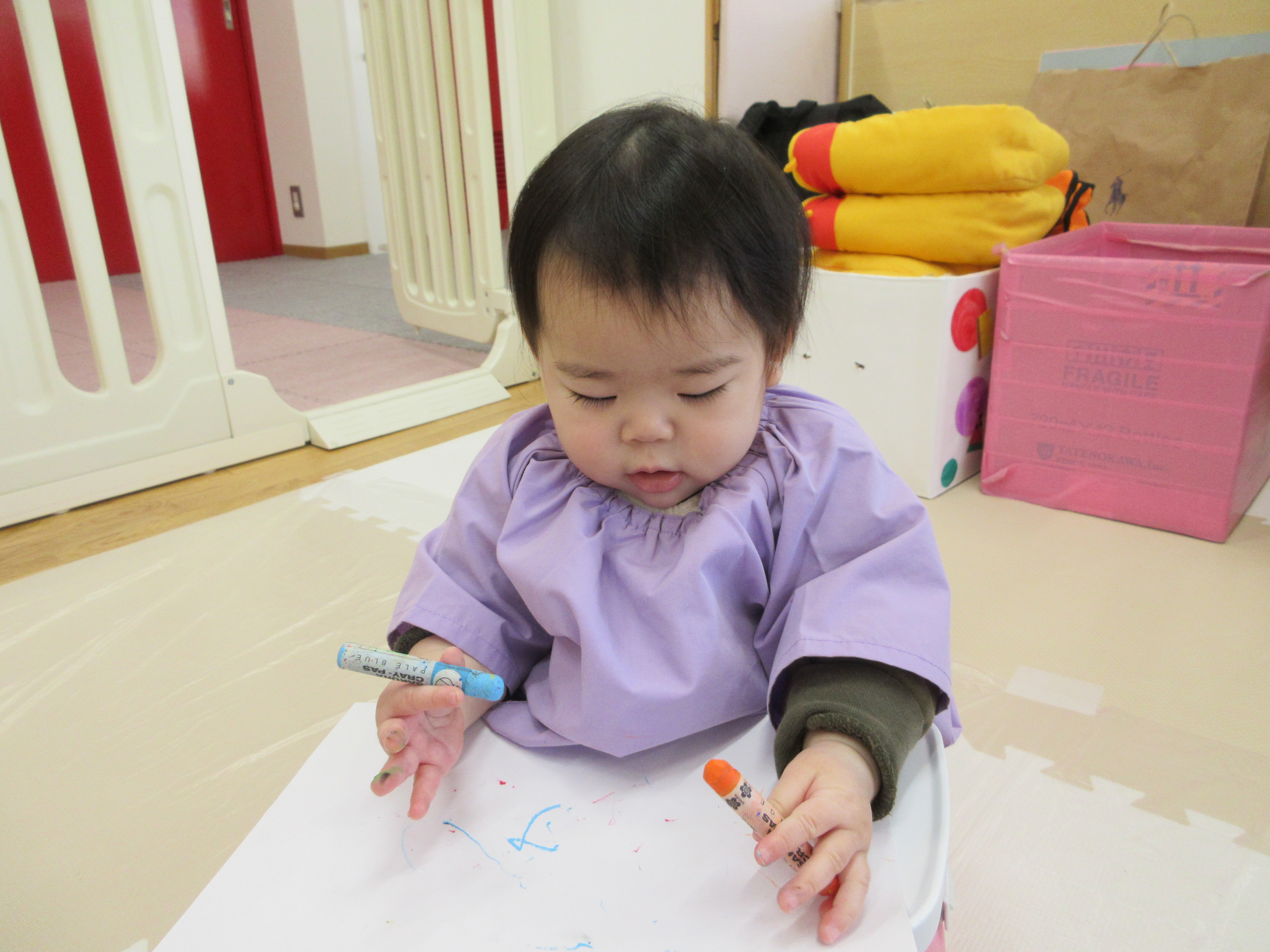 クレパスでお絵描きをしたほし組さん。色々な色に興味があるようです。