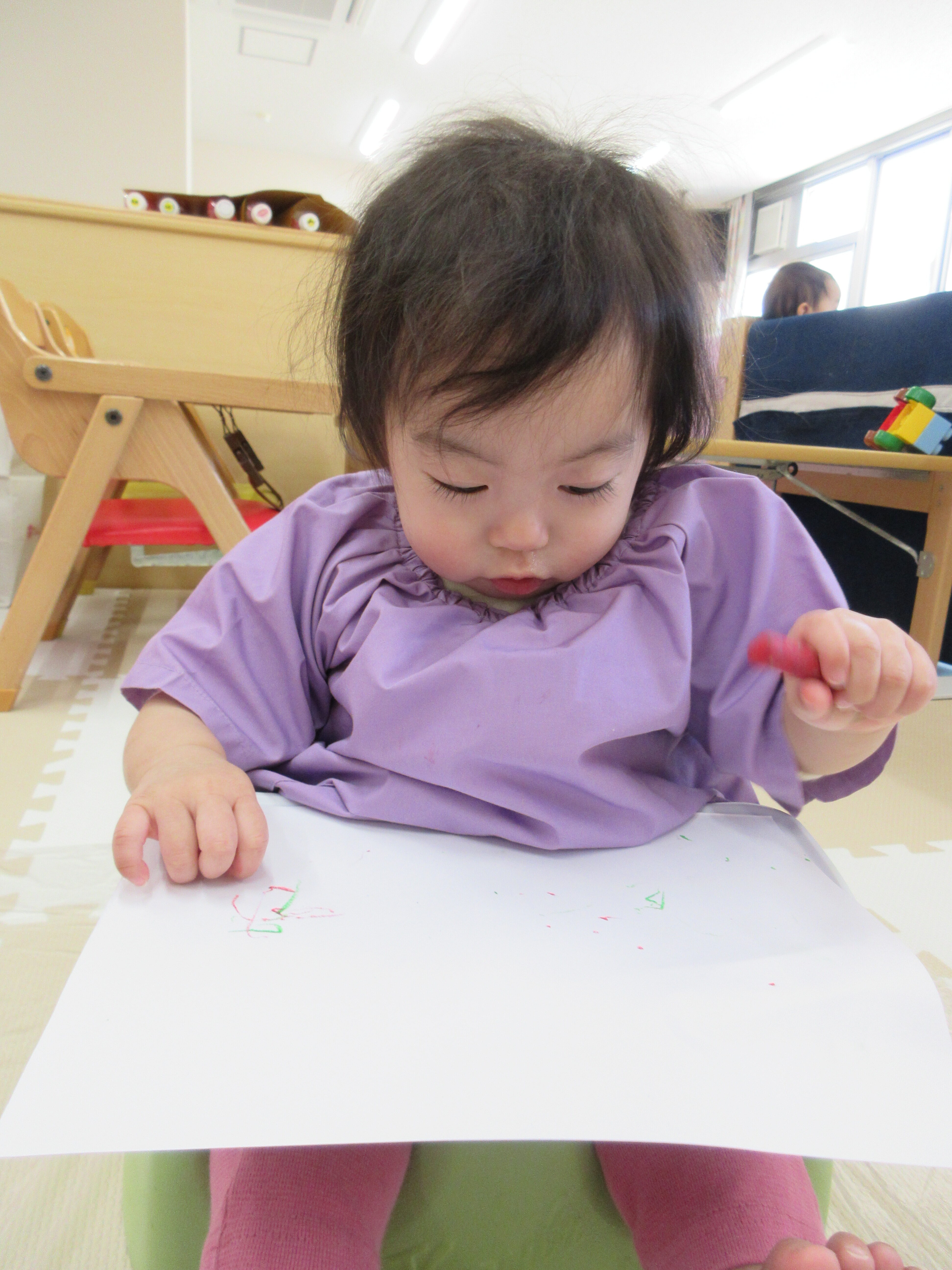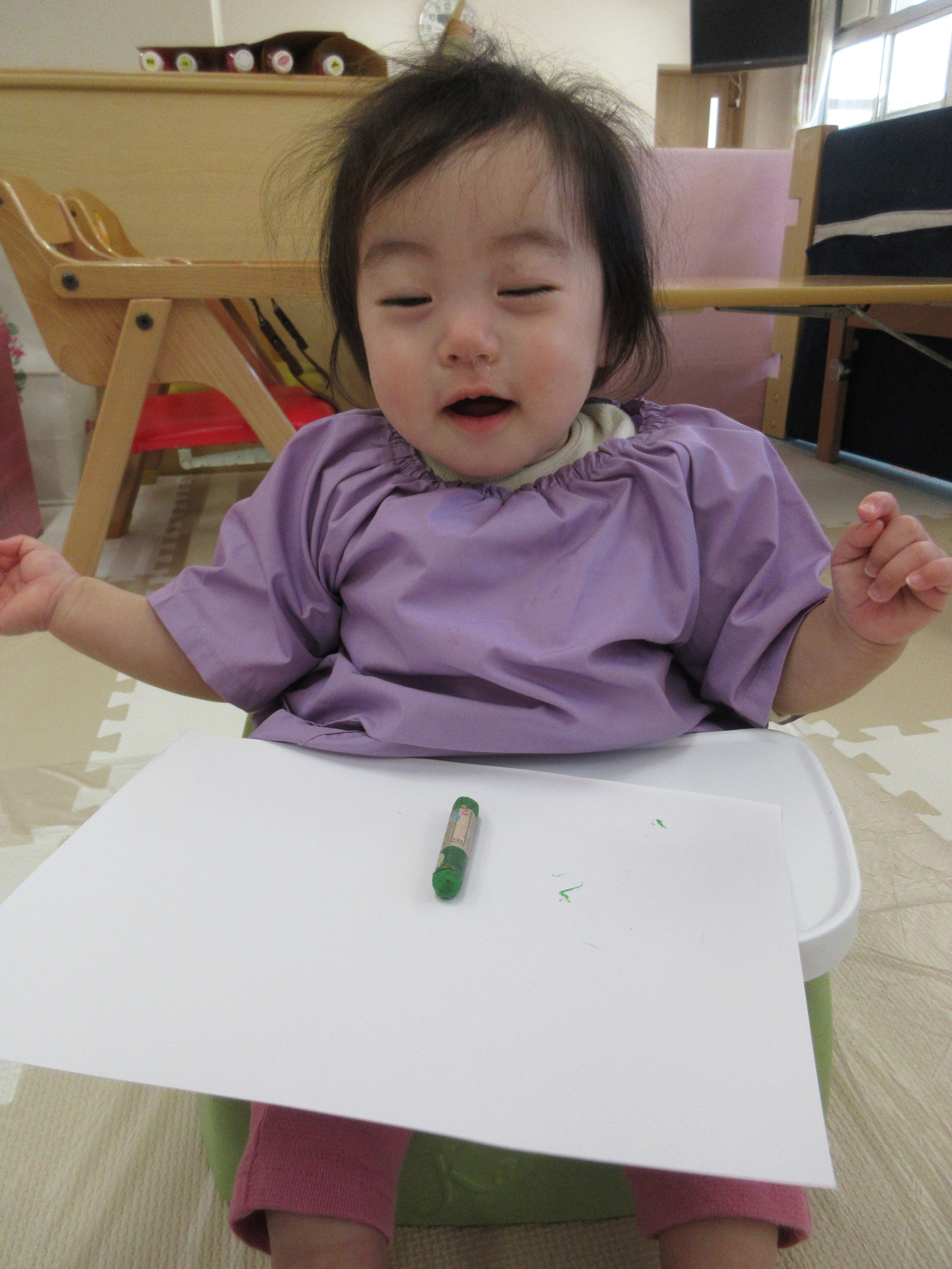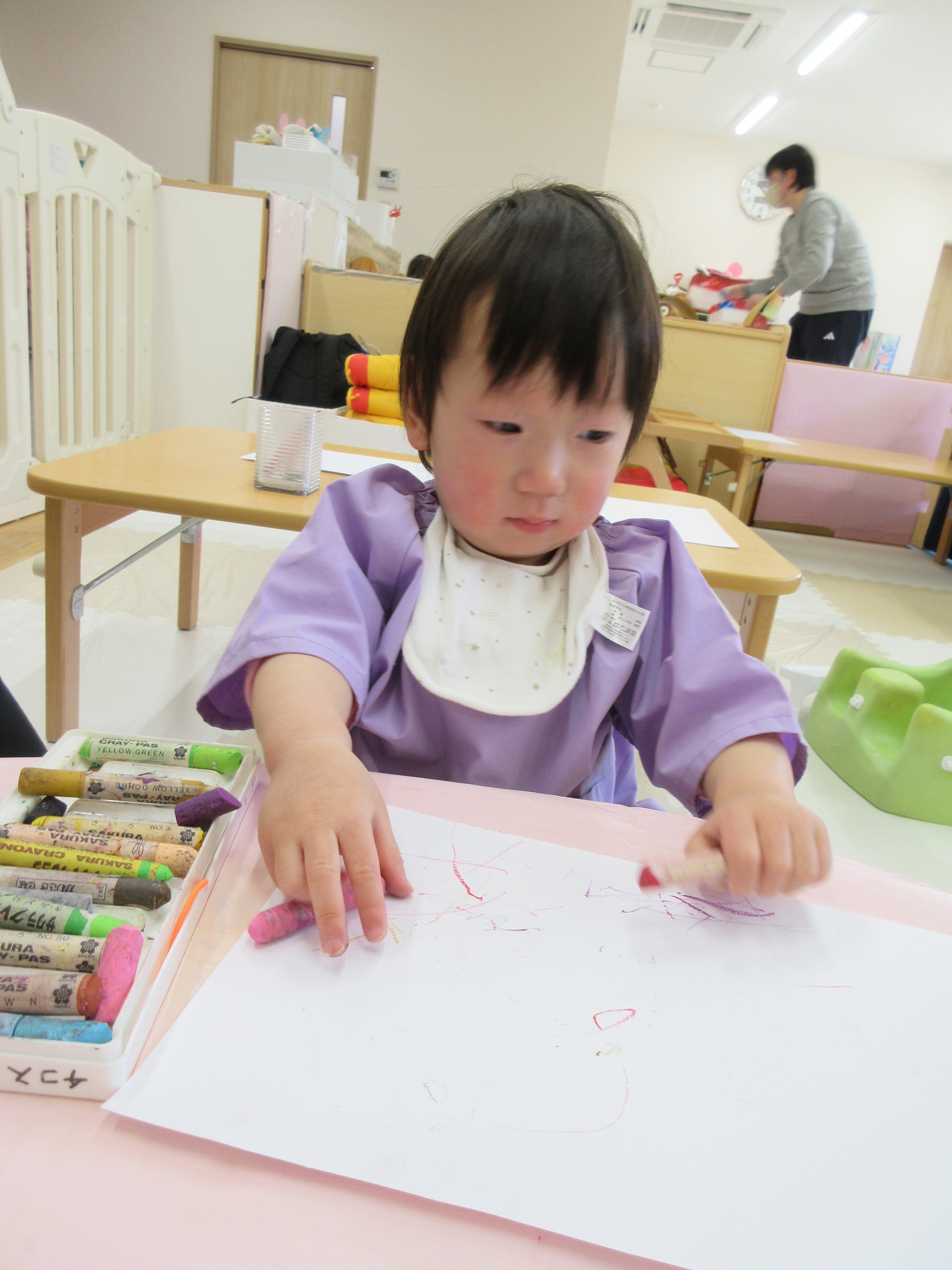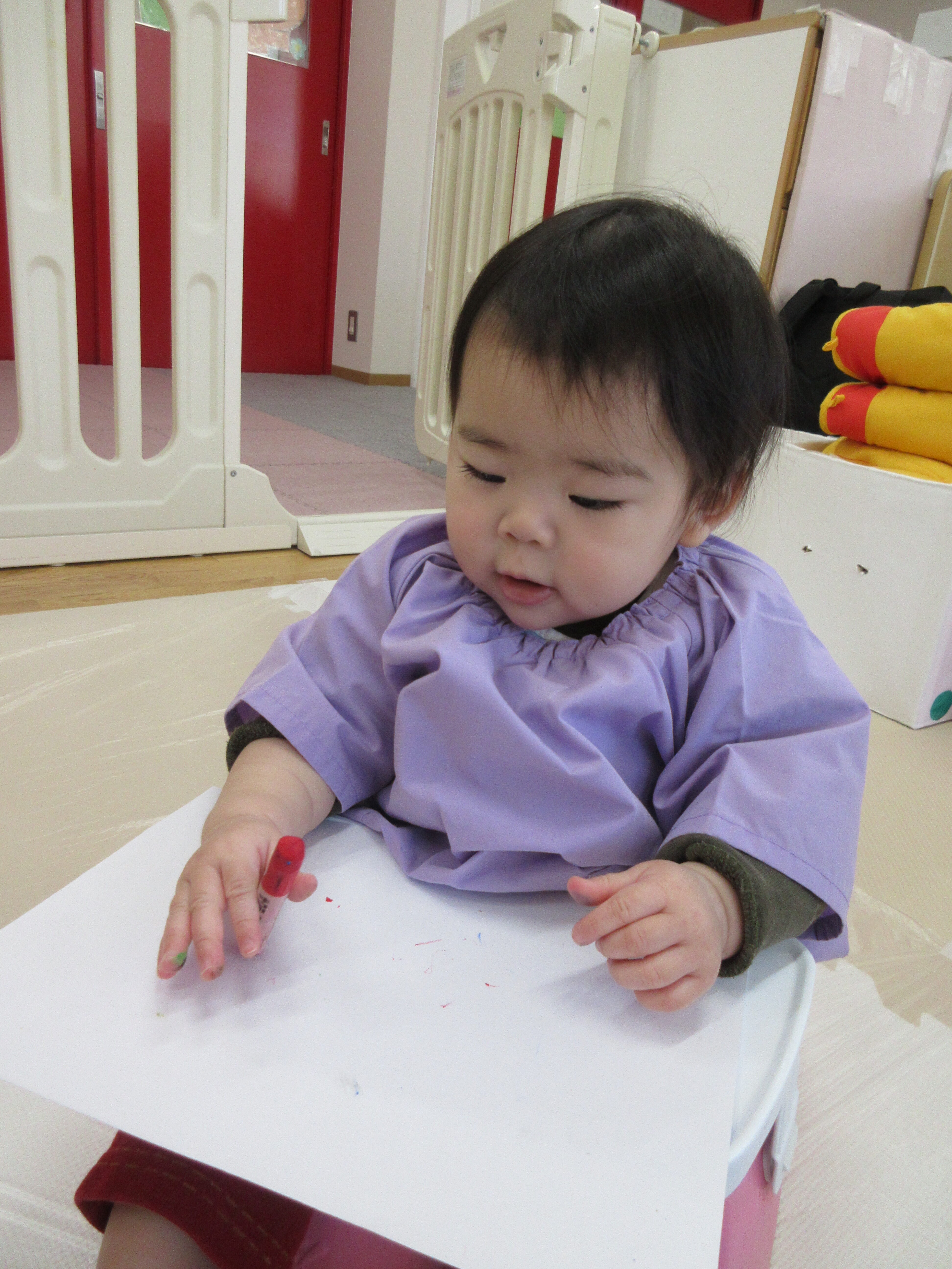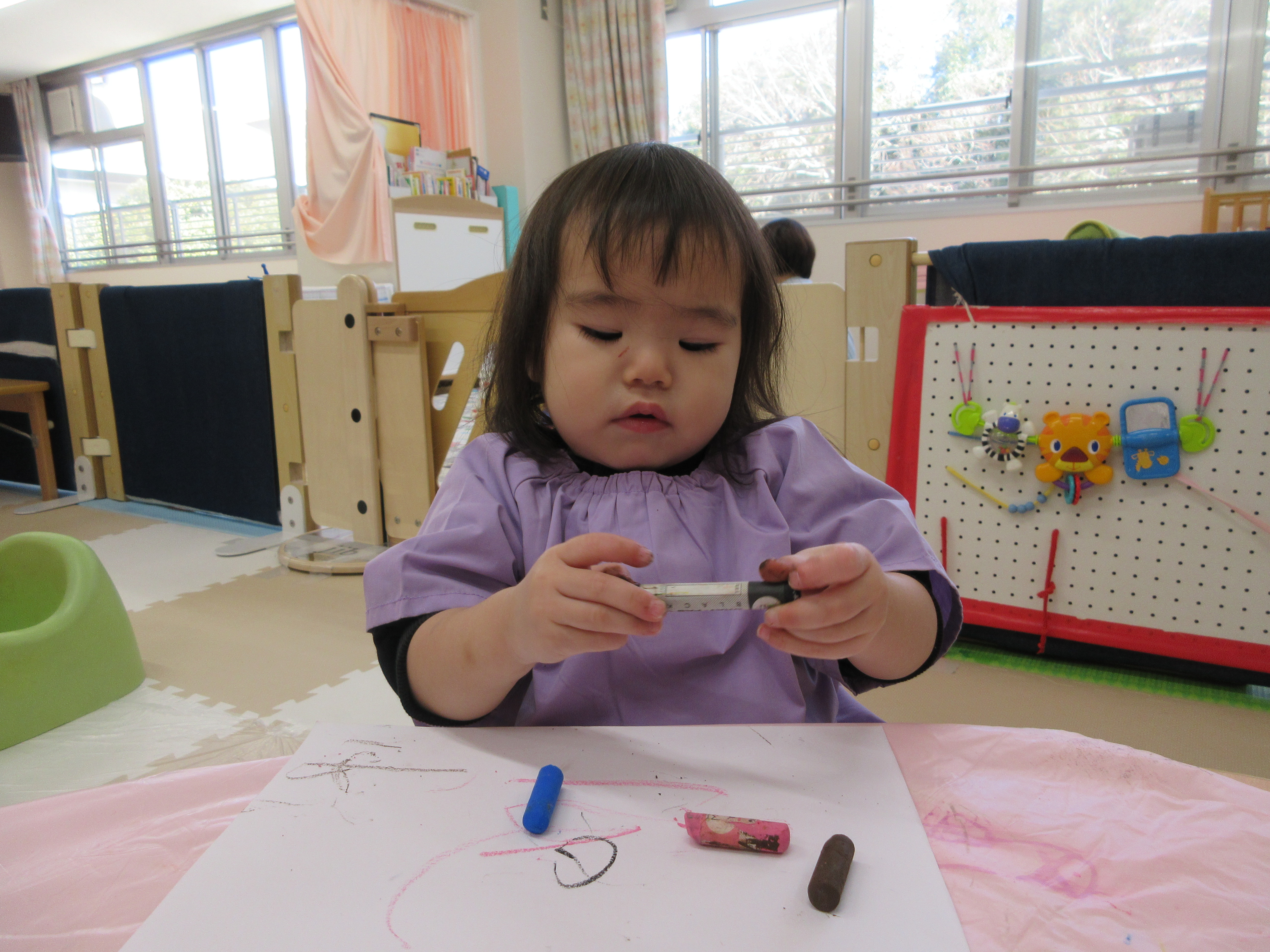 クレパスでお絵描きをしたほし組さん。色々な色に興味があるようです。