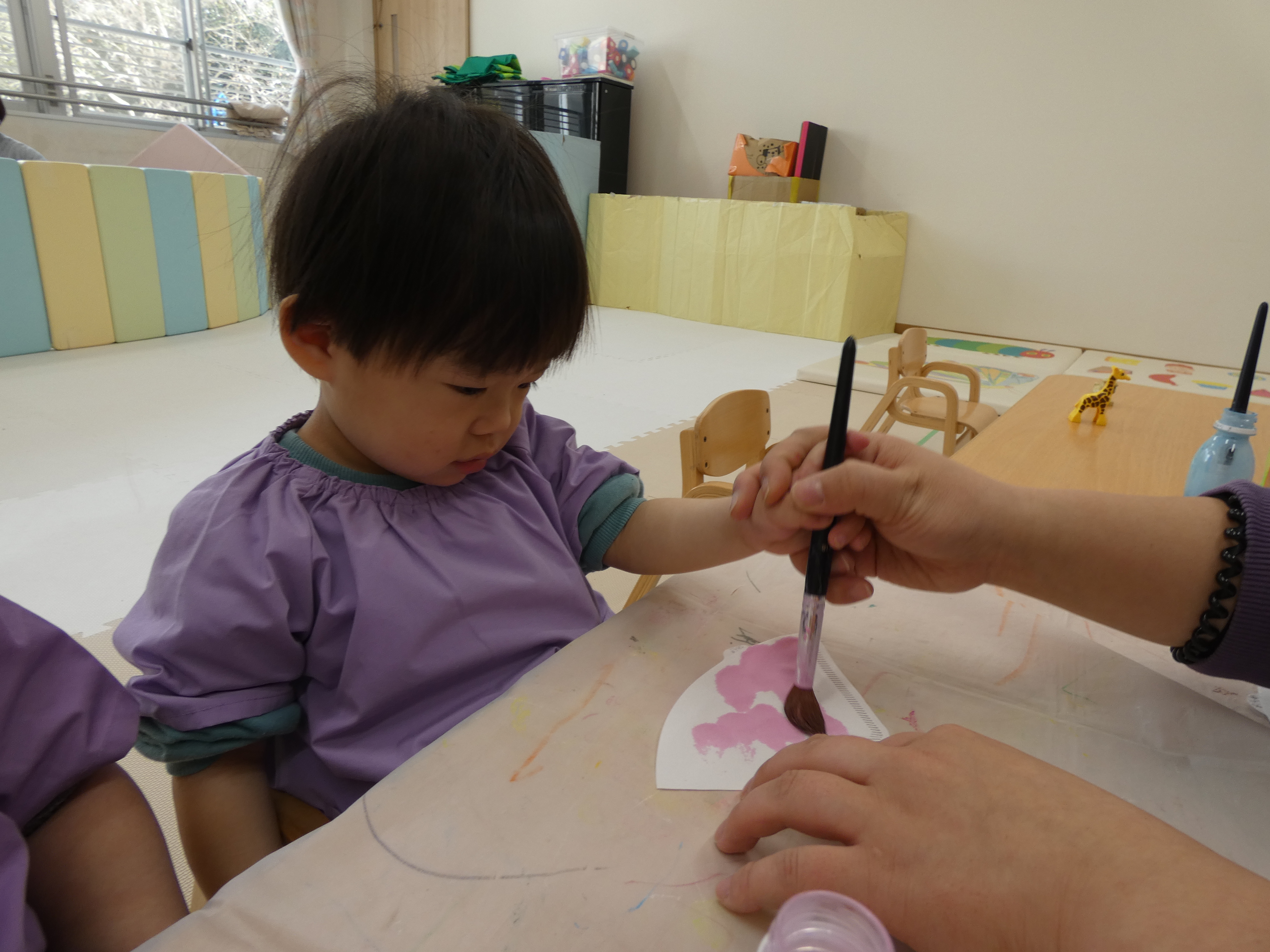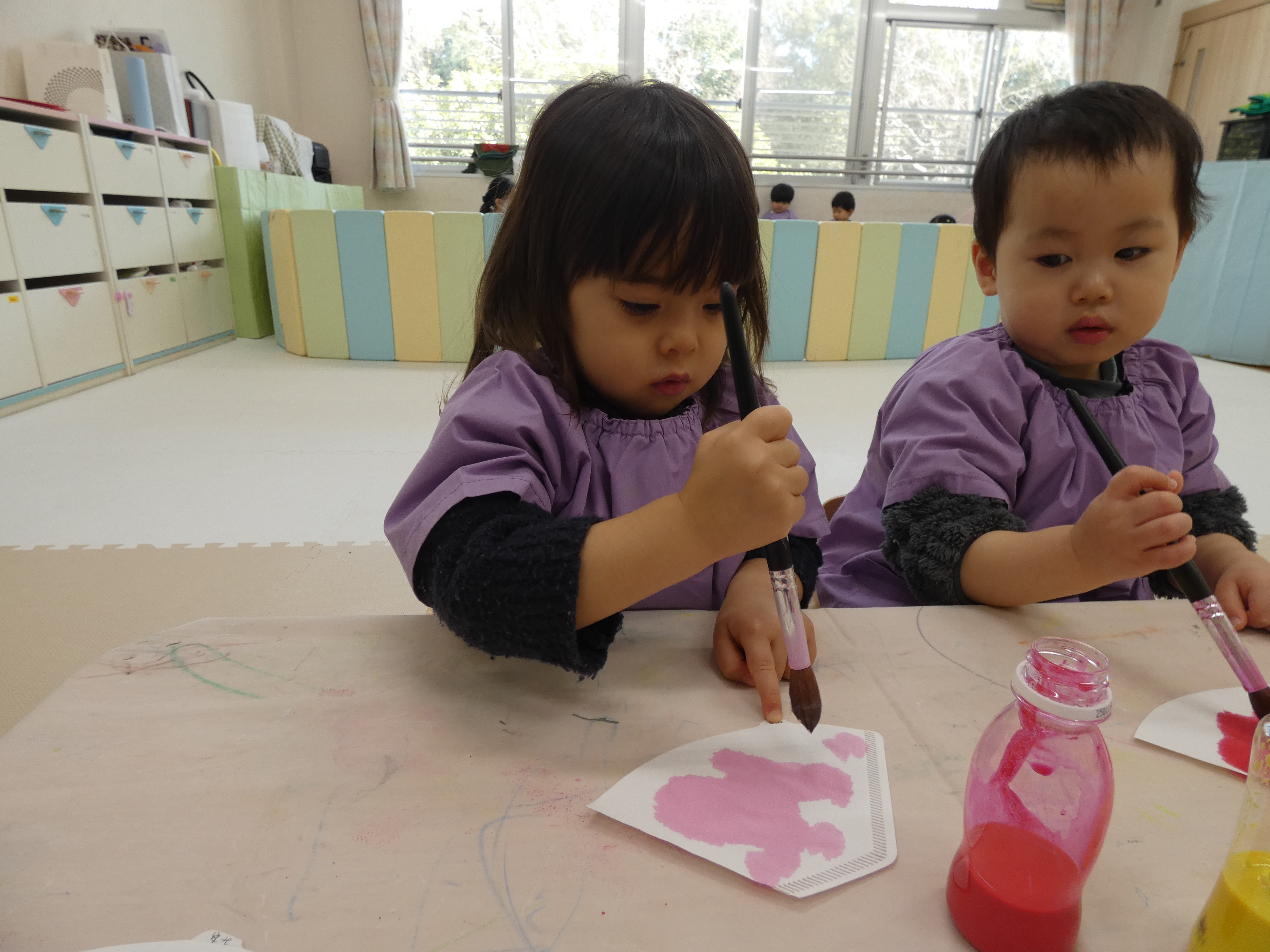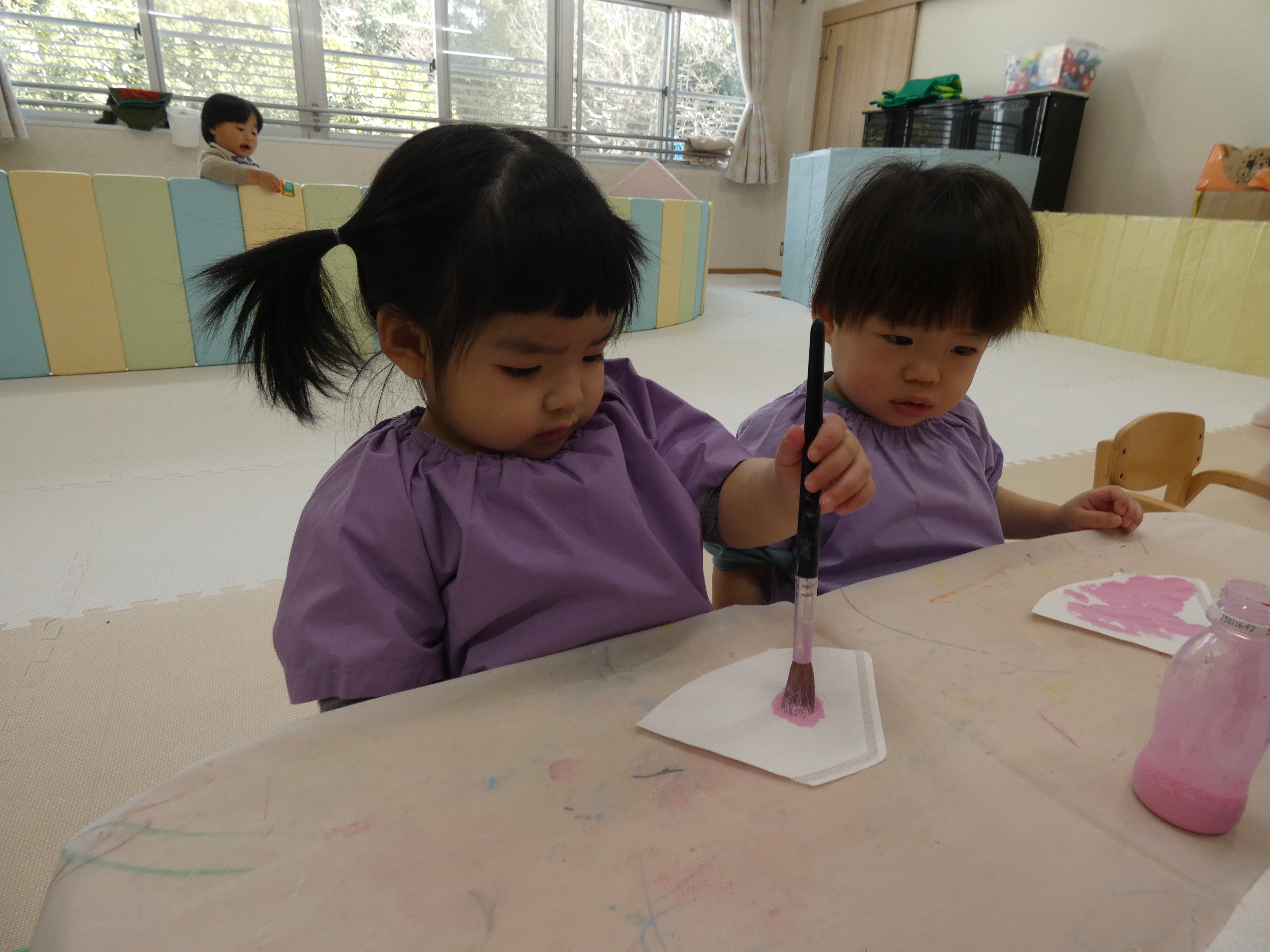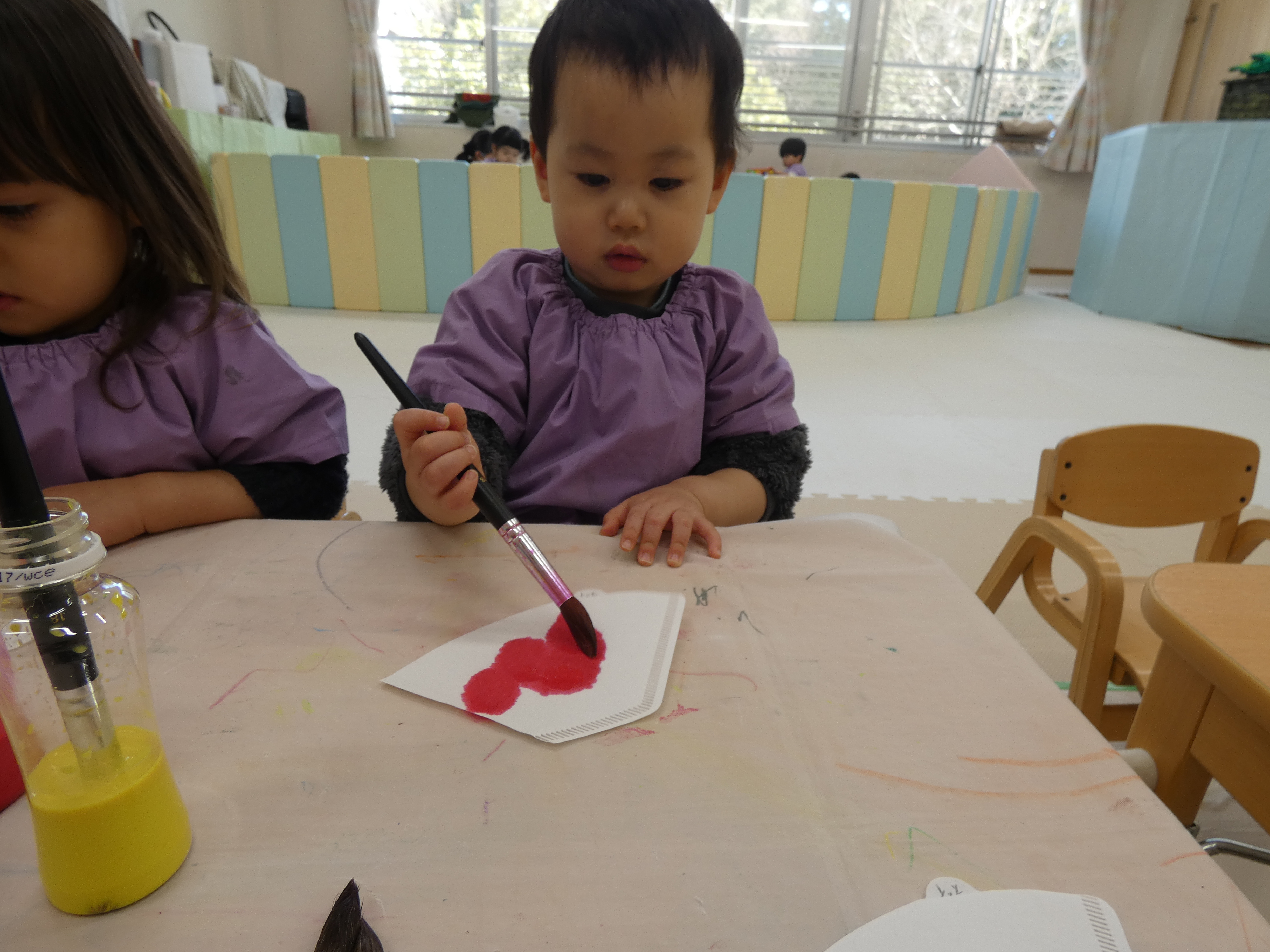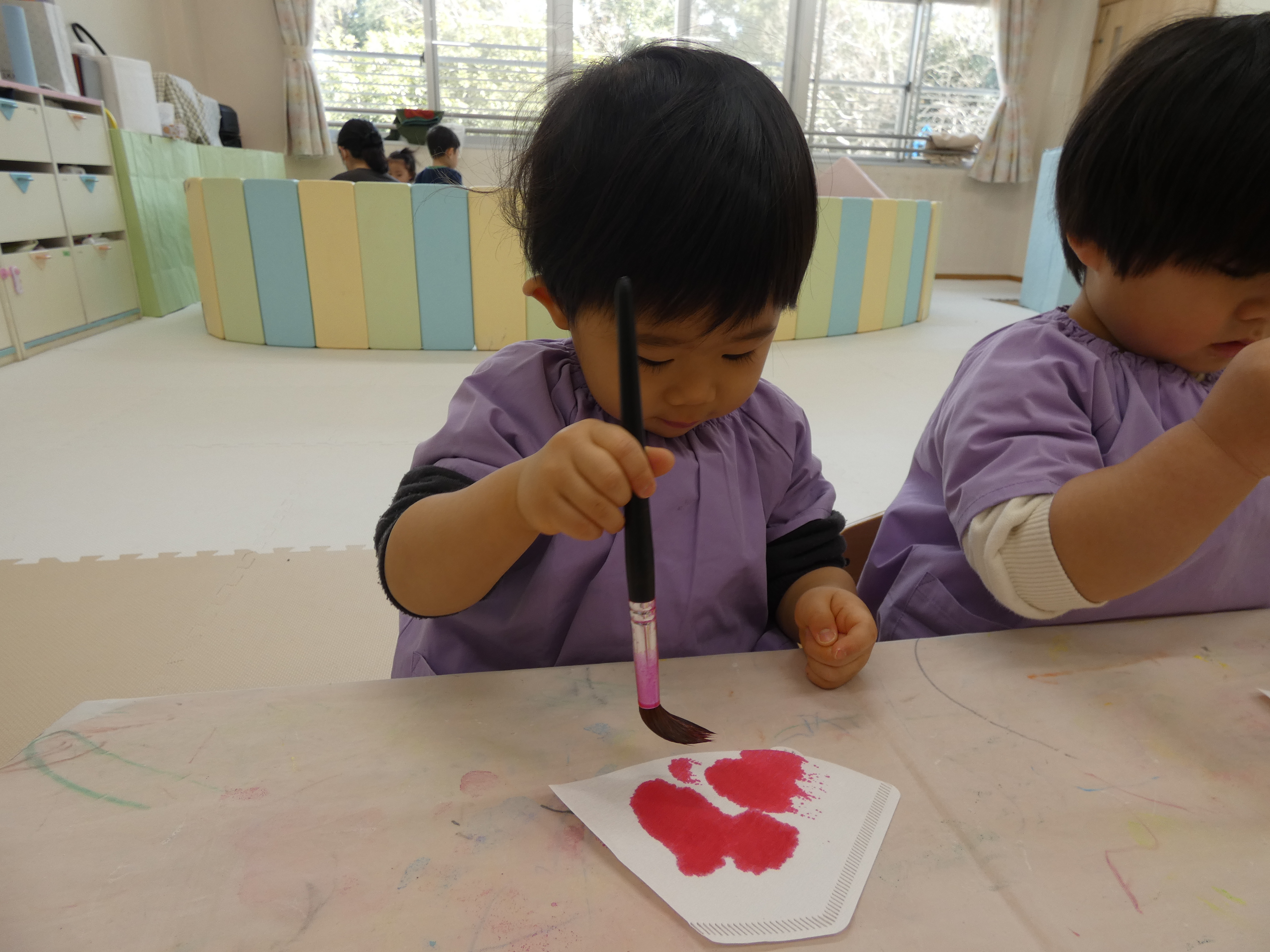 ひな祭り制作をがんばったつき組さんで。絵筆はまだまだ大きく感じますね。