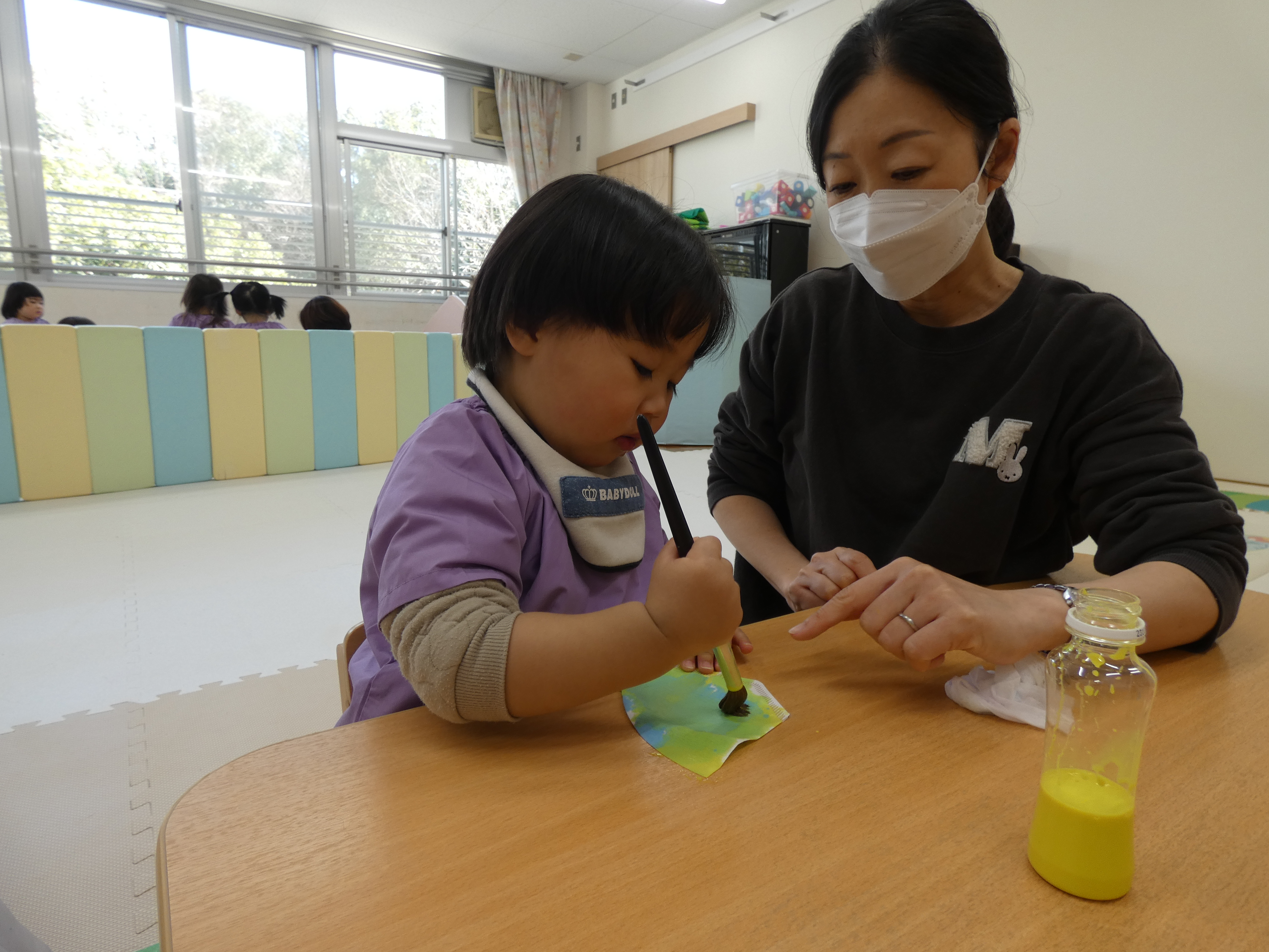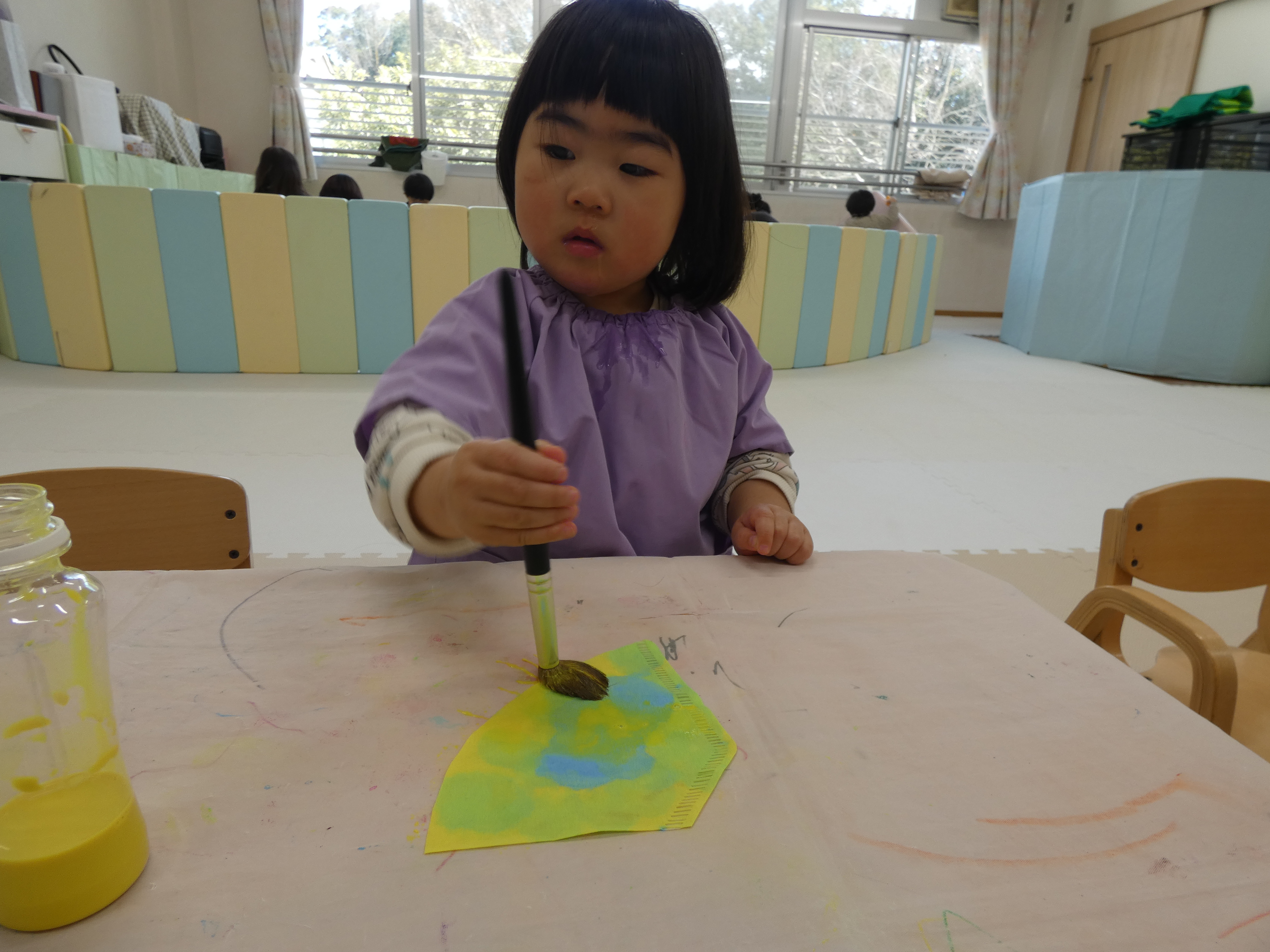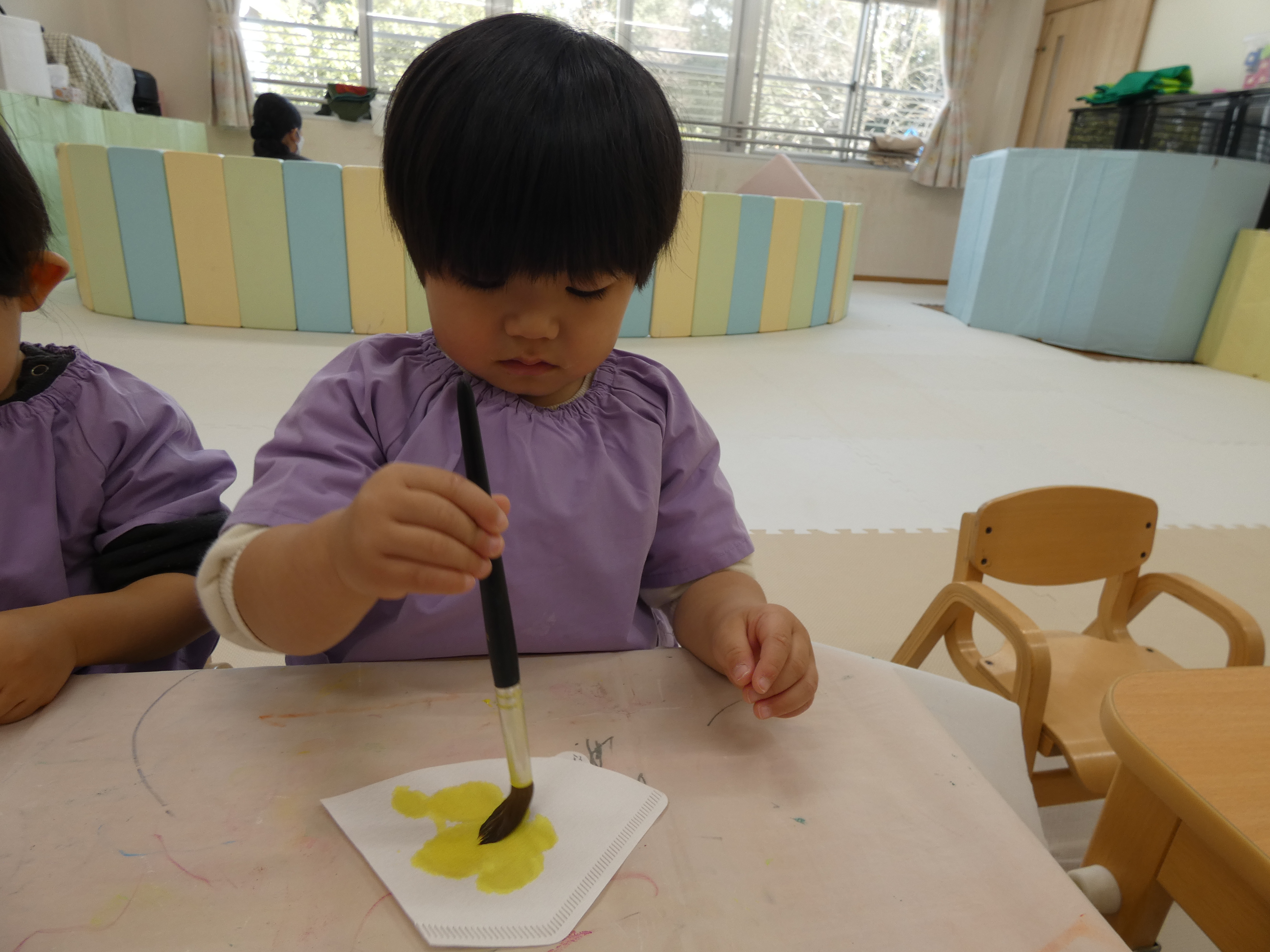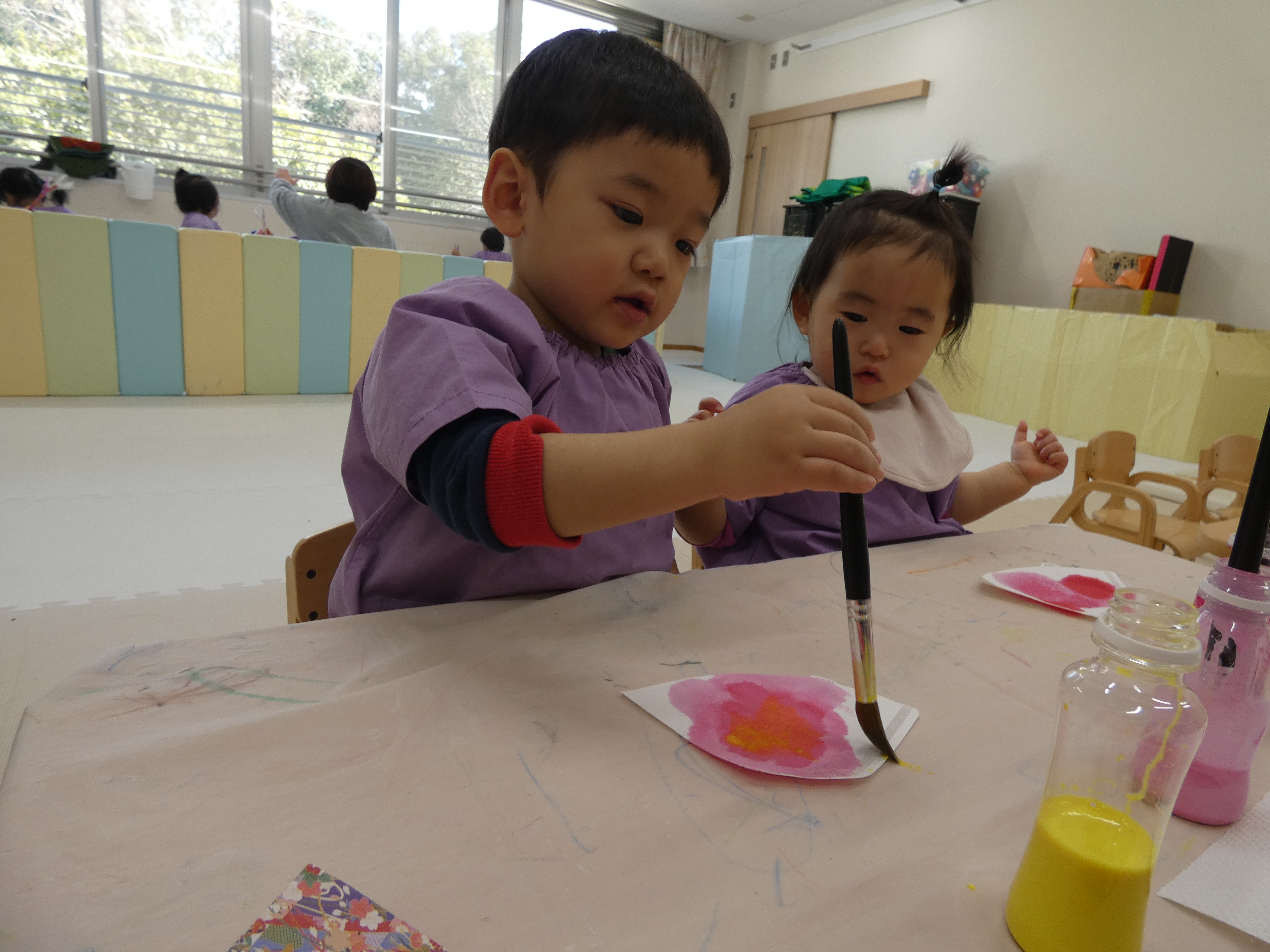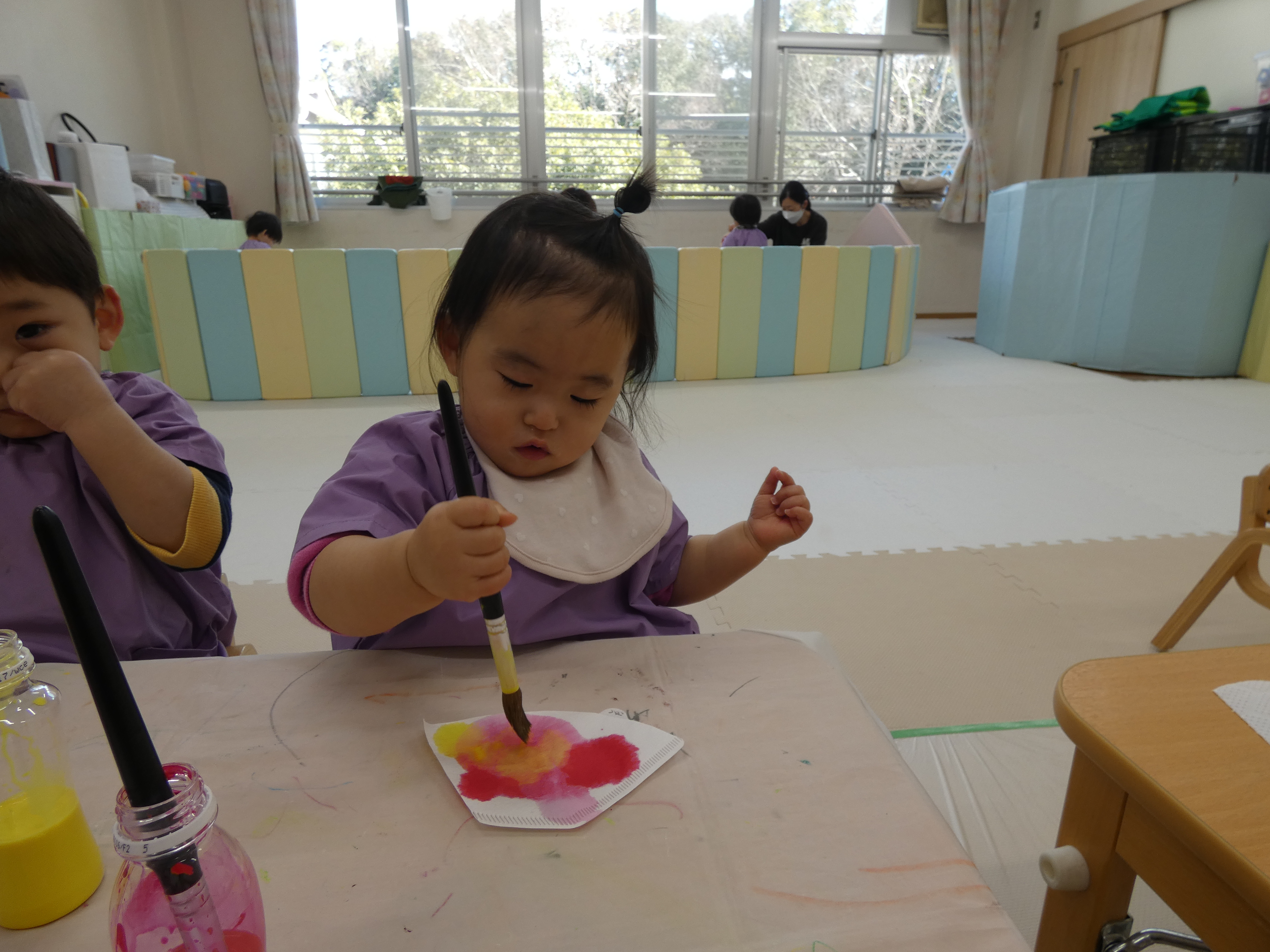 ひな祭り制作をがんばったつき組さんで。絵筆はまだまだ大きく感じますね。