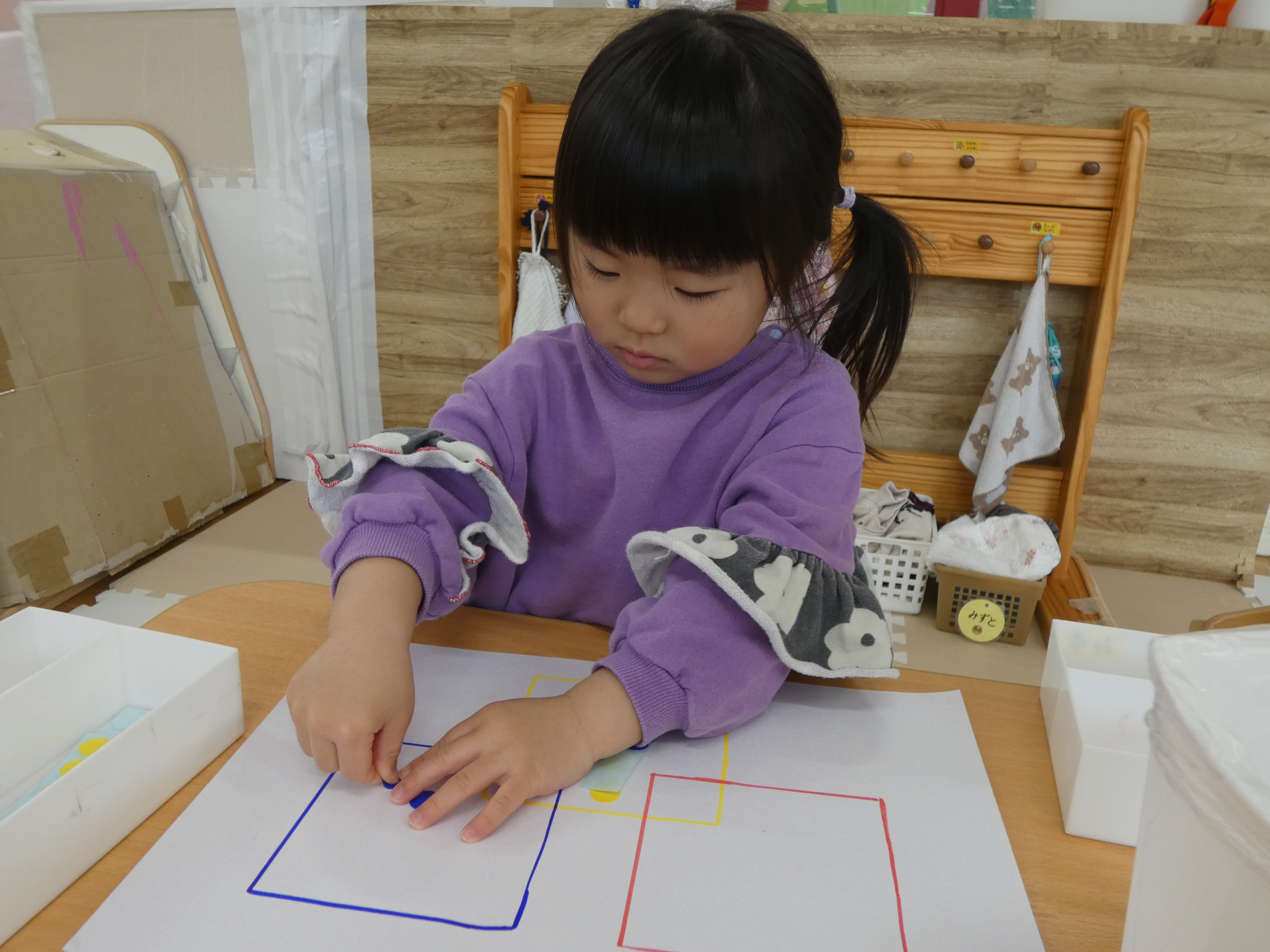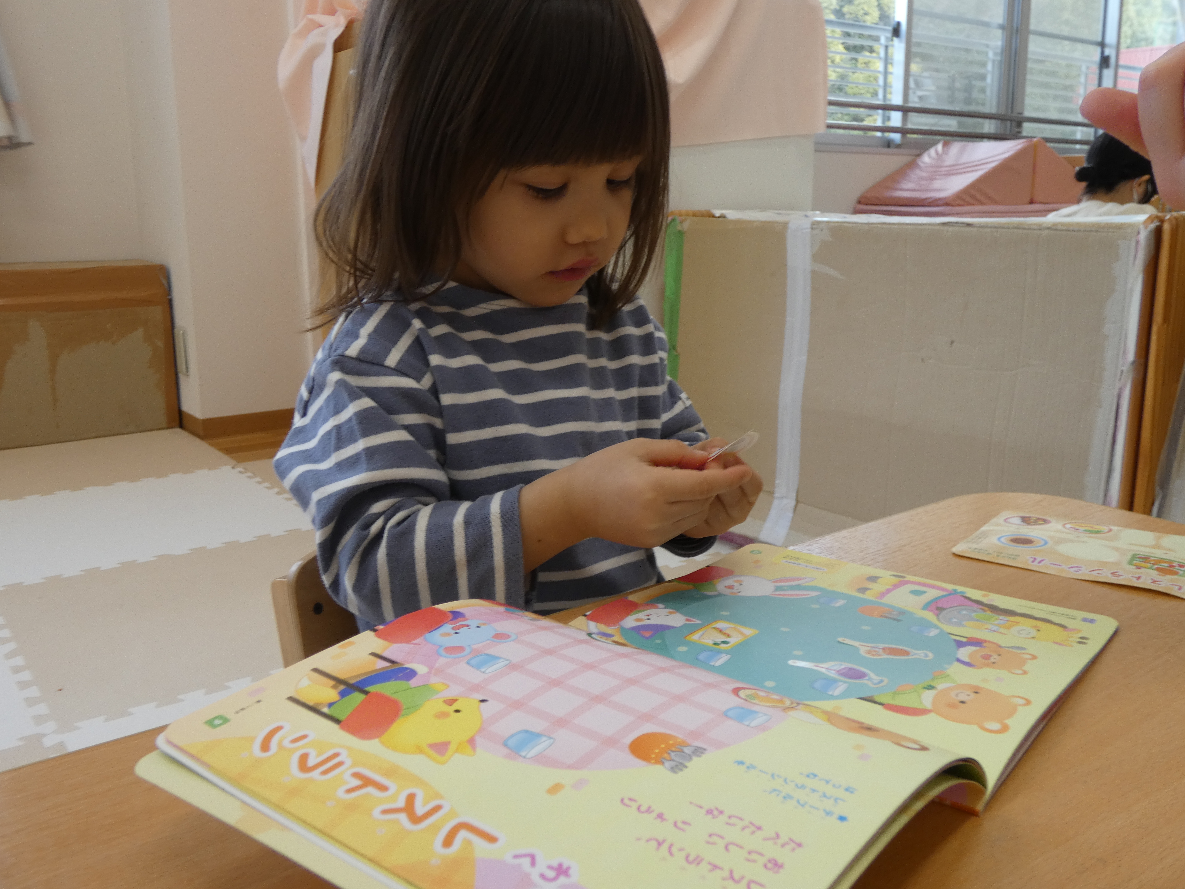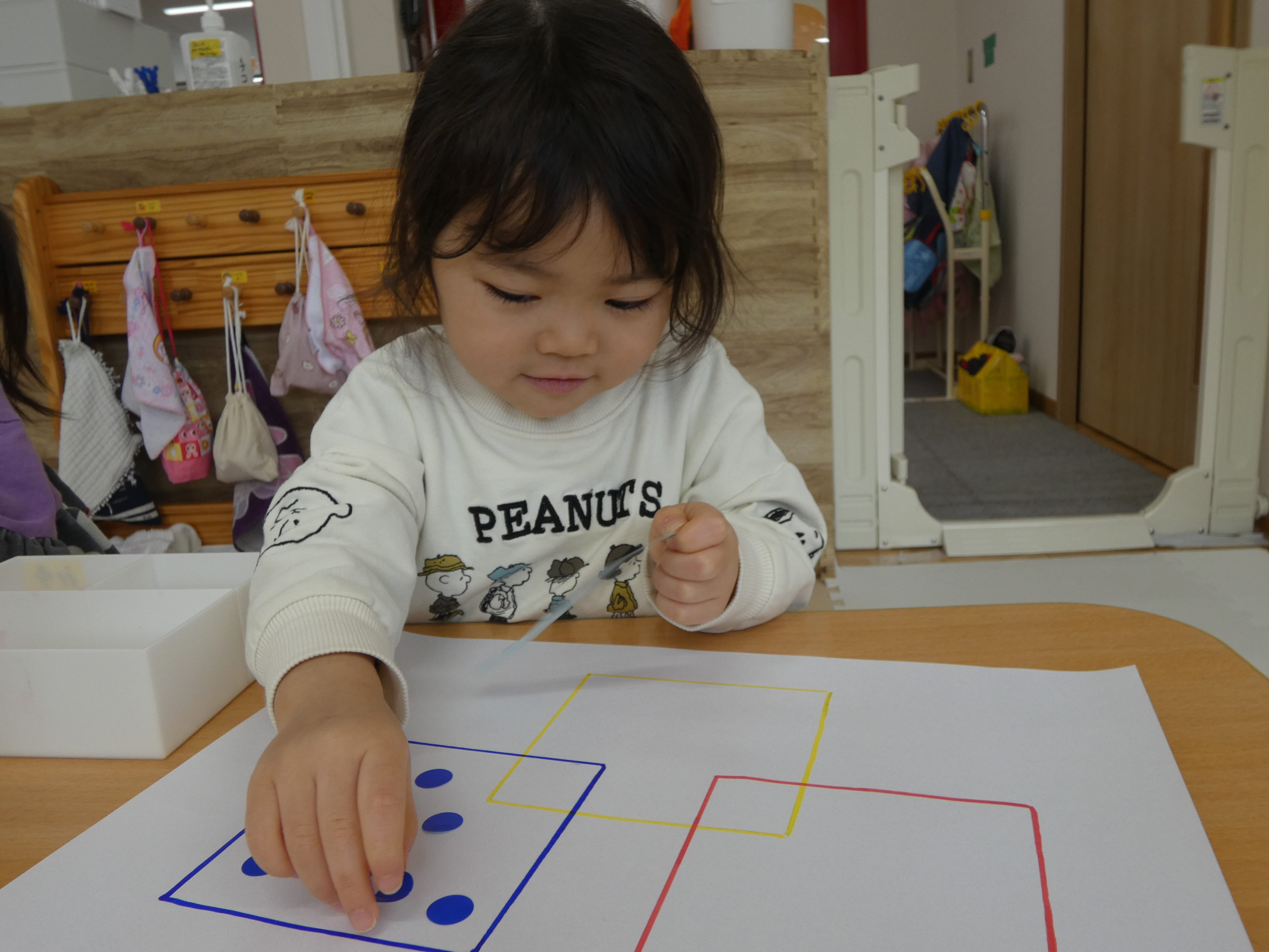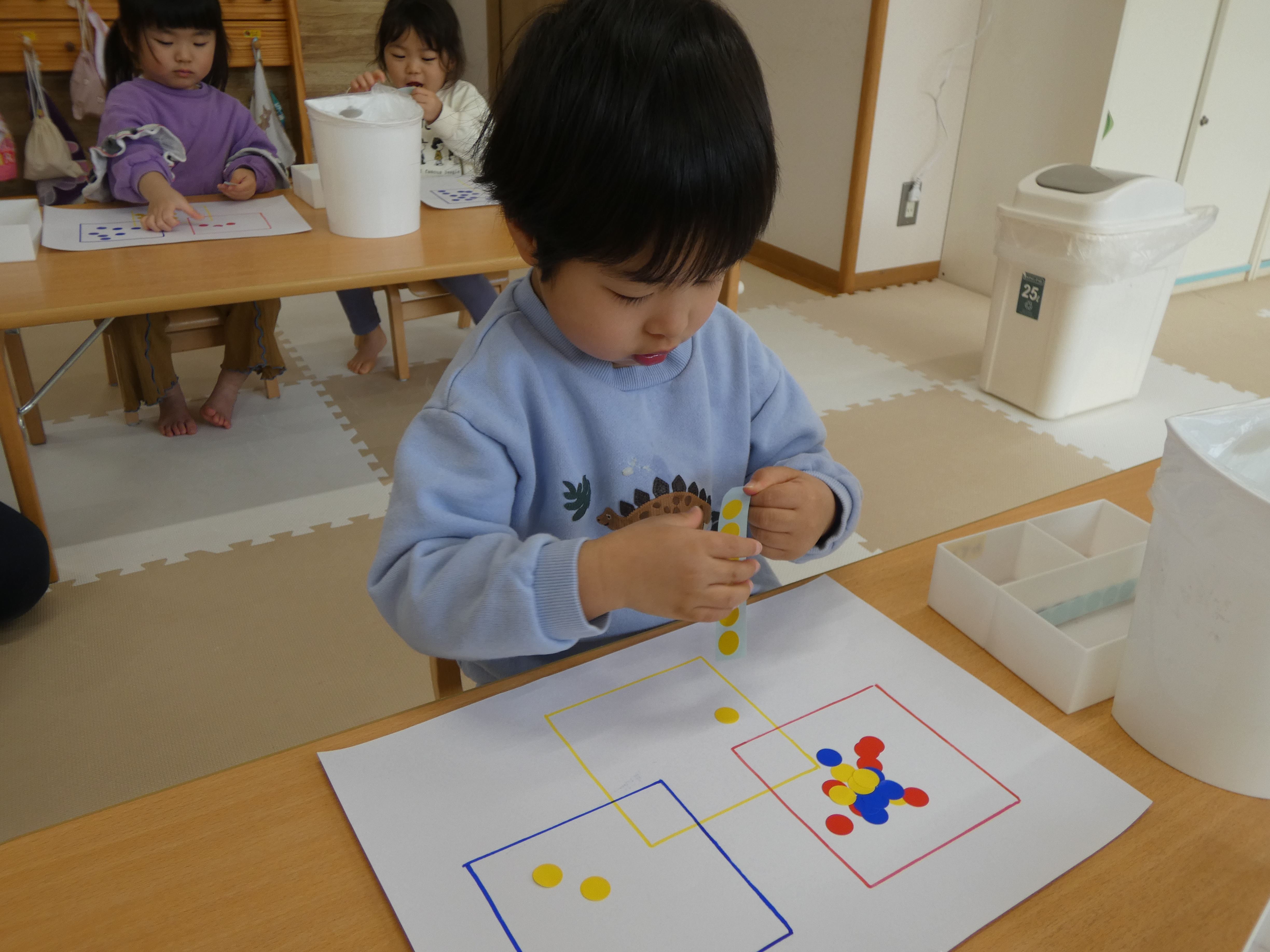 3月の絵本を見た後は、みんなで、シール貼り活動をしました。複雑な図形の上に貼っています。