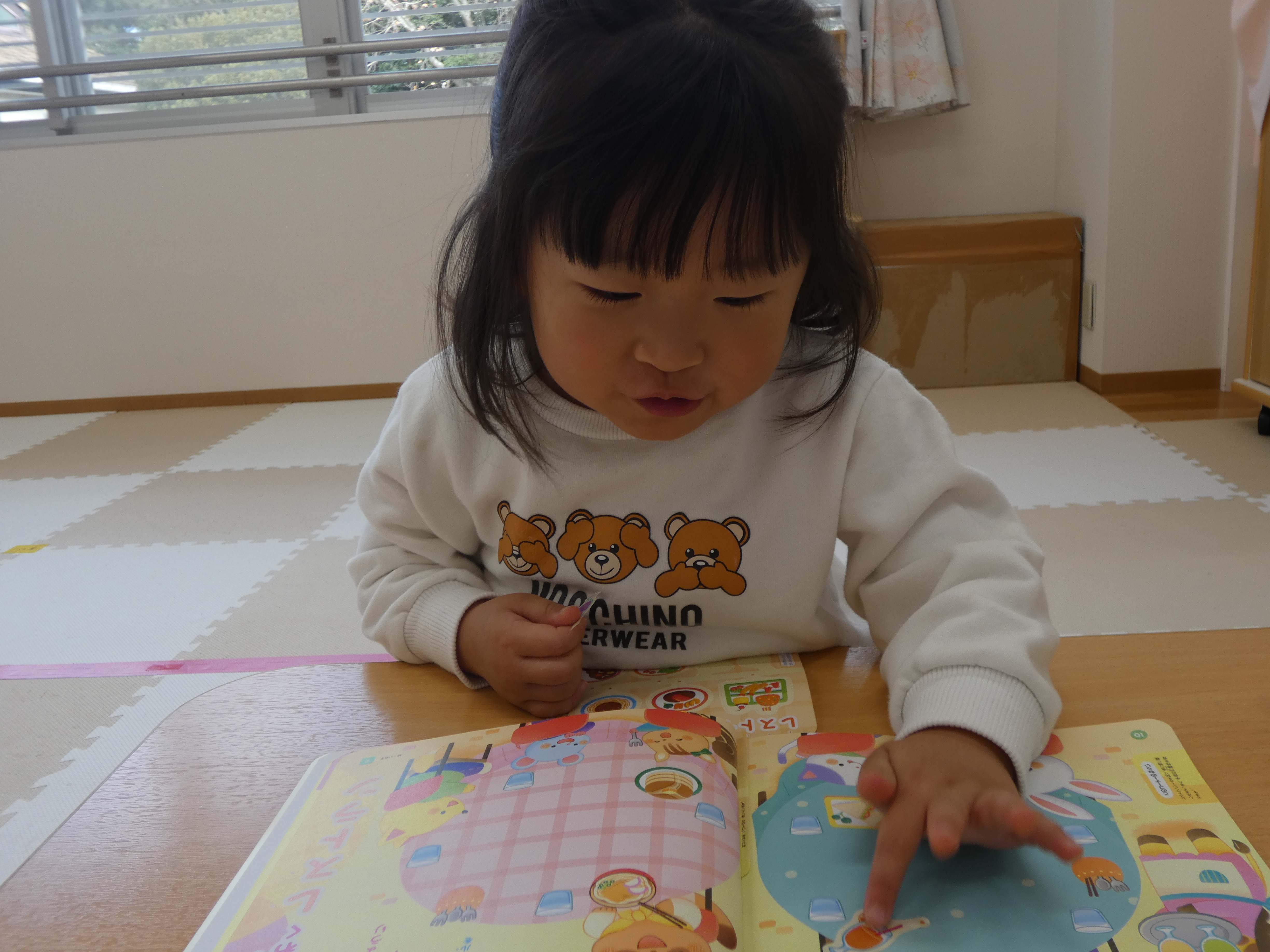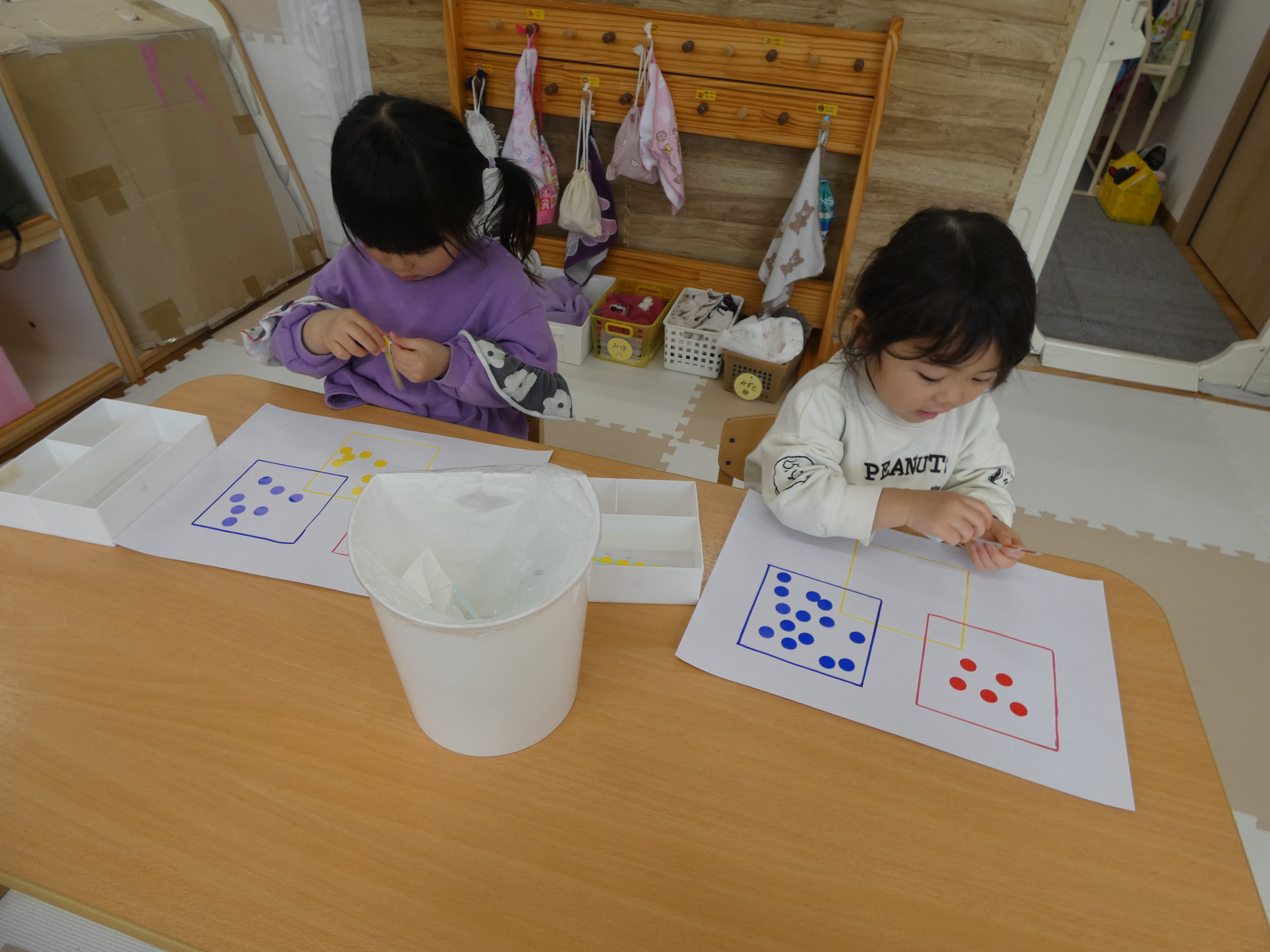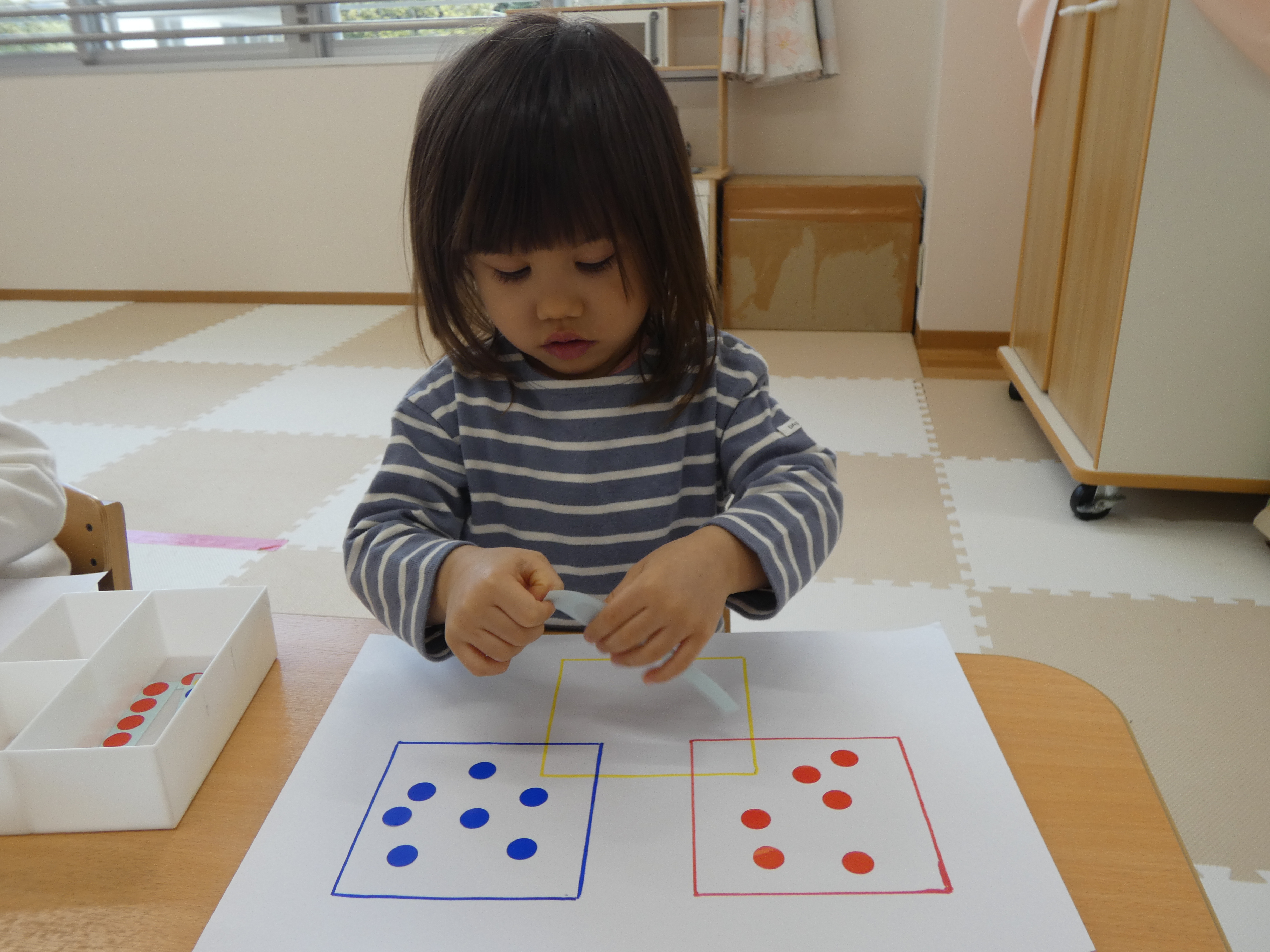 3月の絵本を見た後は、みんなで、シール貼り活動をしました。複雑な図形の上に貼っています。