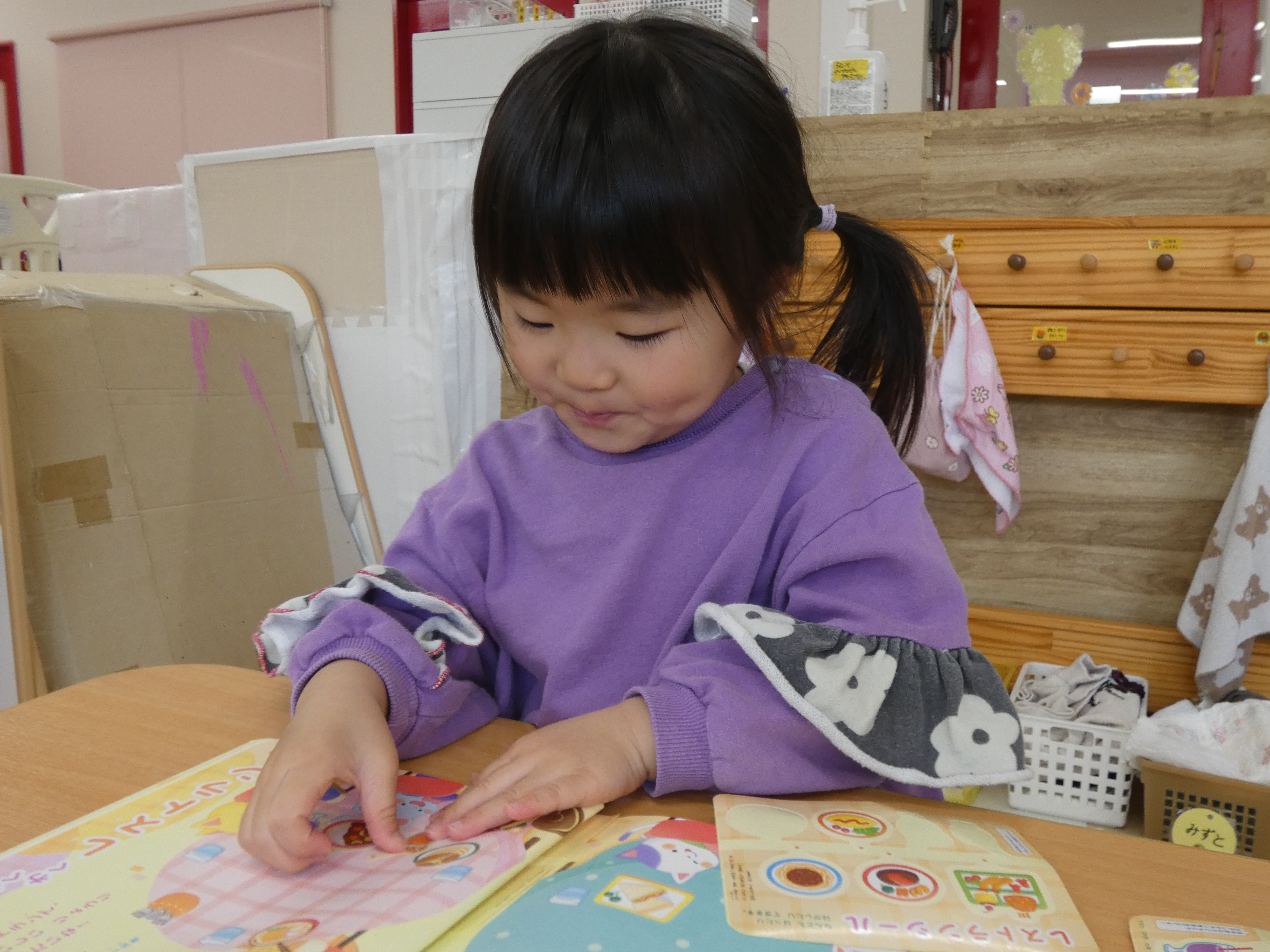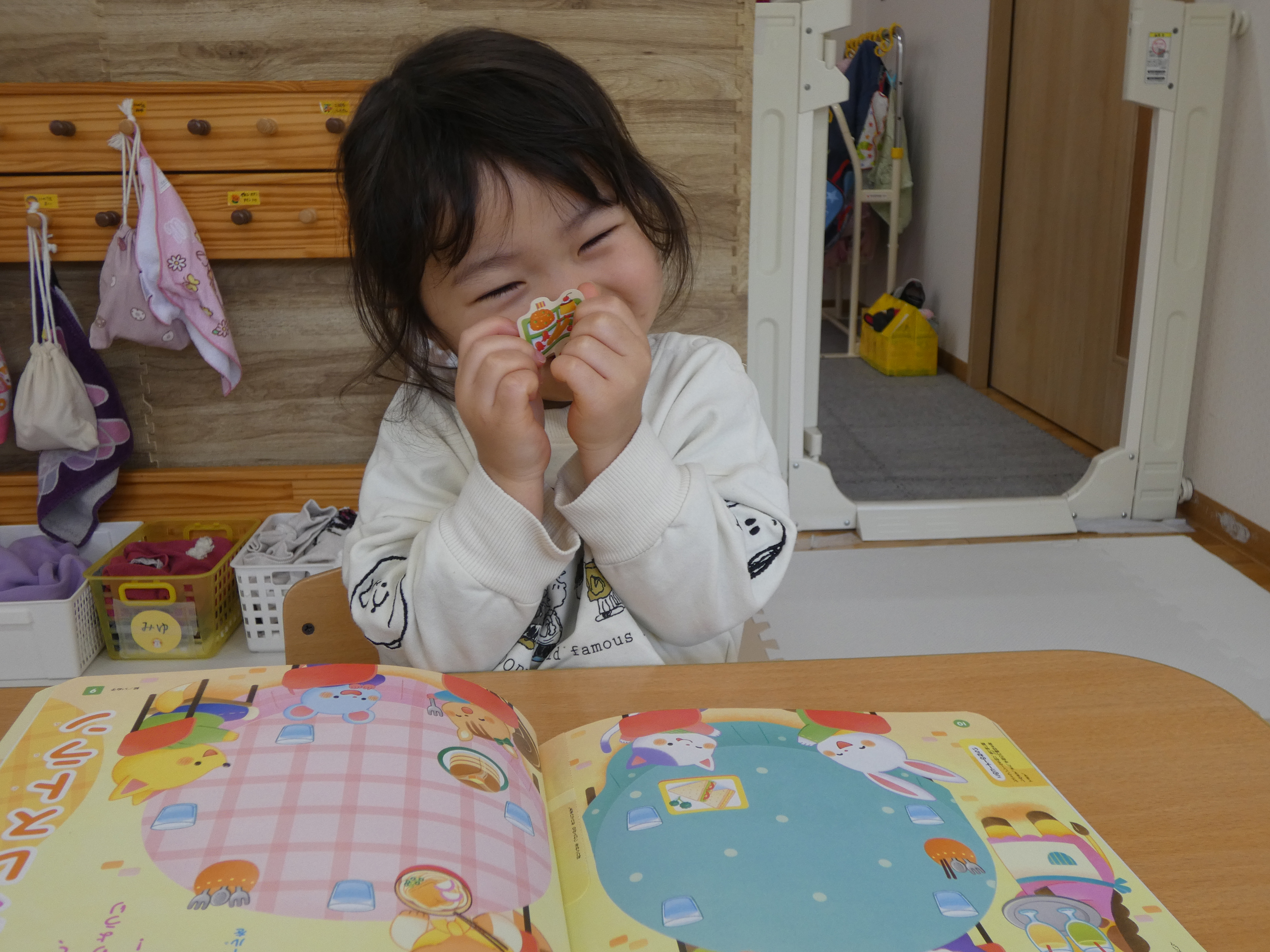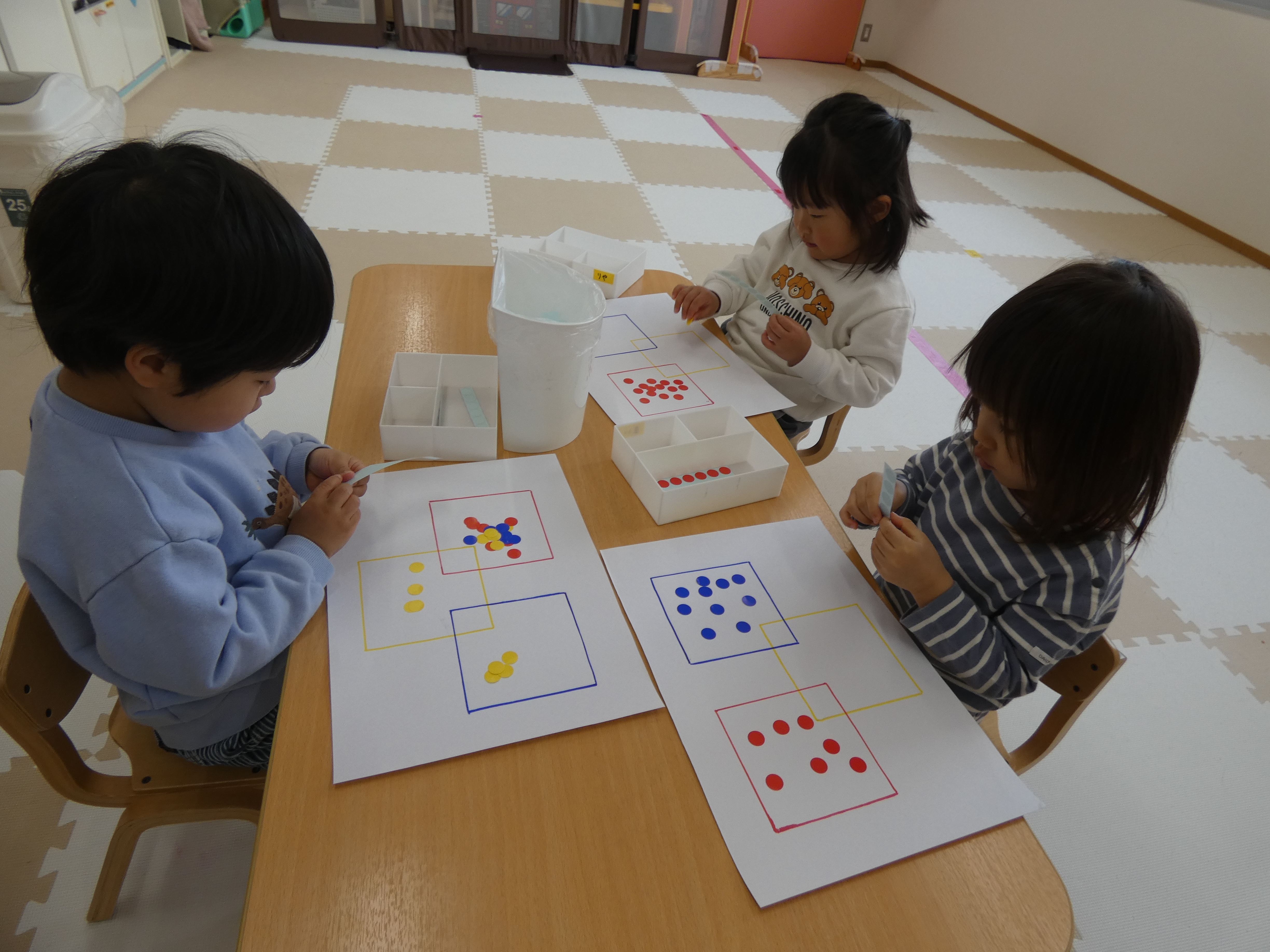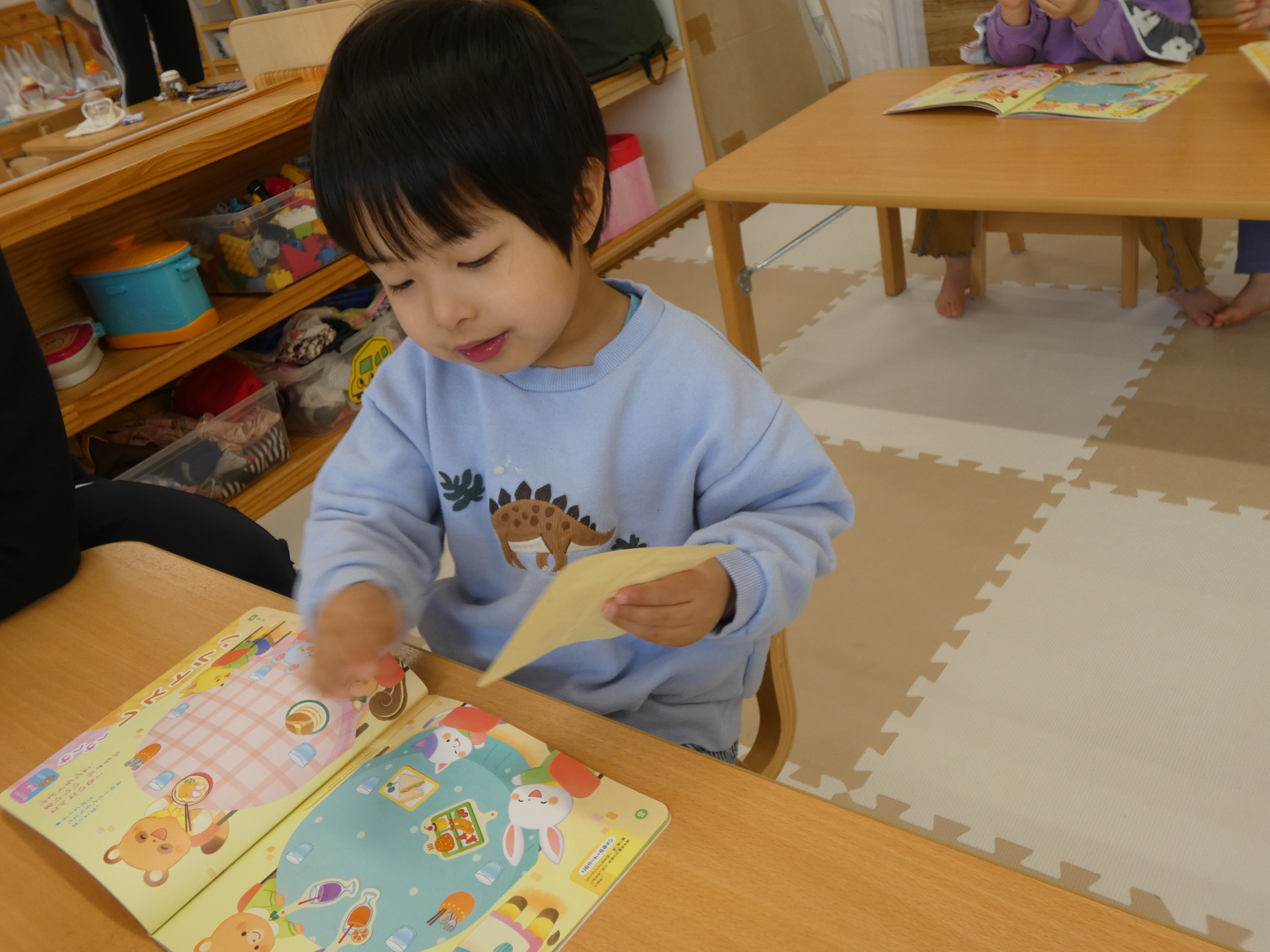 3月の絵本を見た後は、みんなで、シール貼り活動をしました。複雑な図形の上に貼っています。