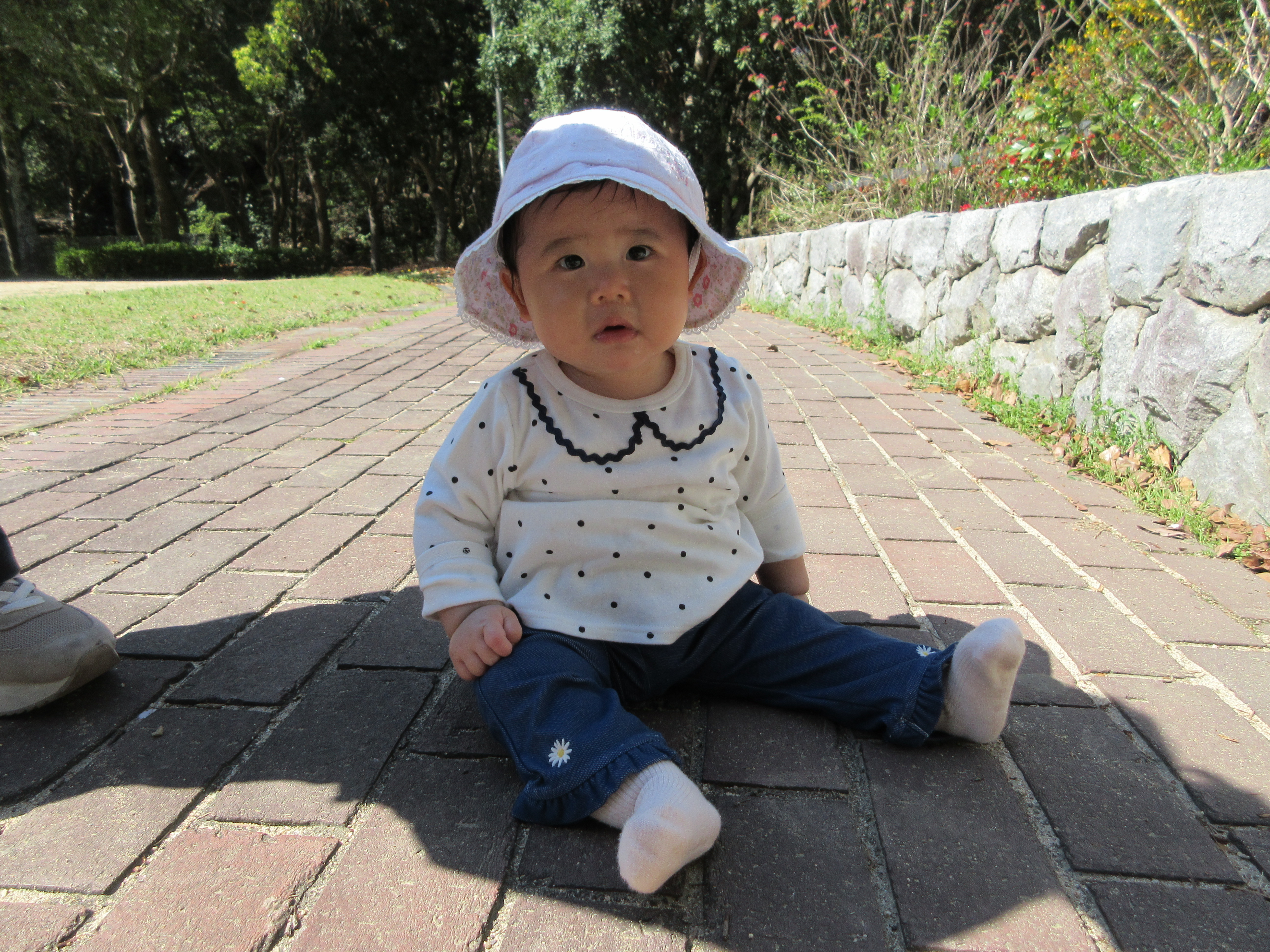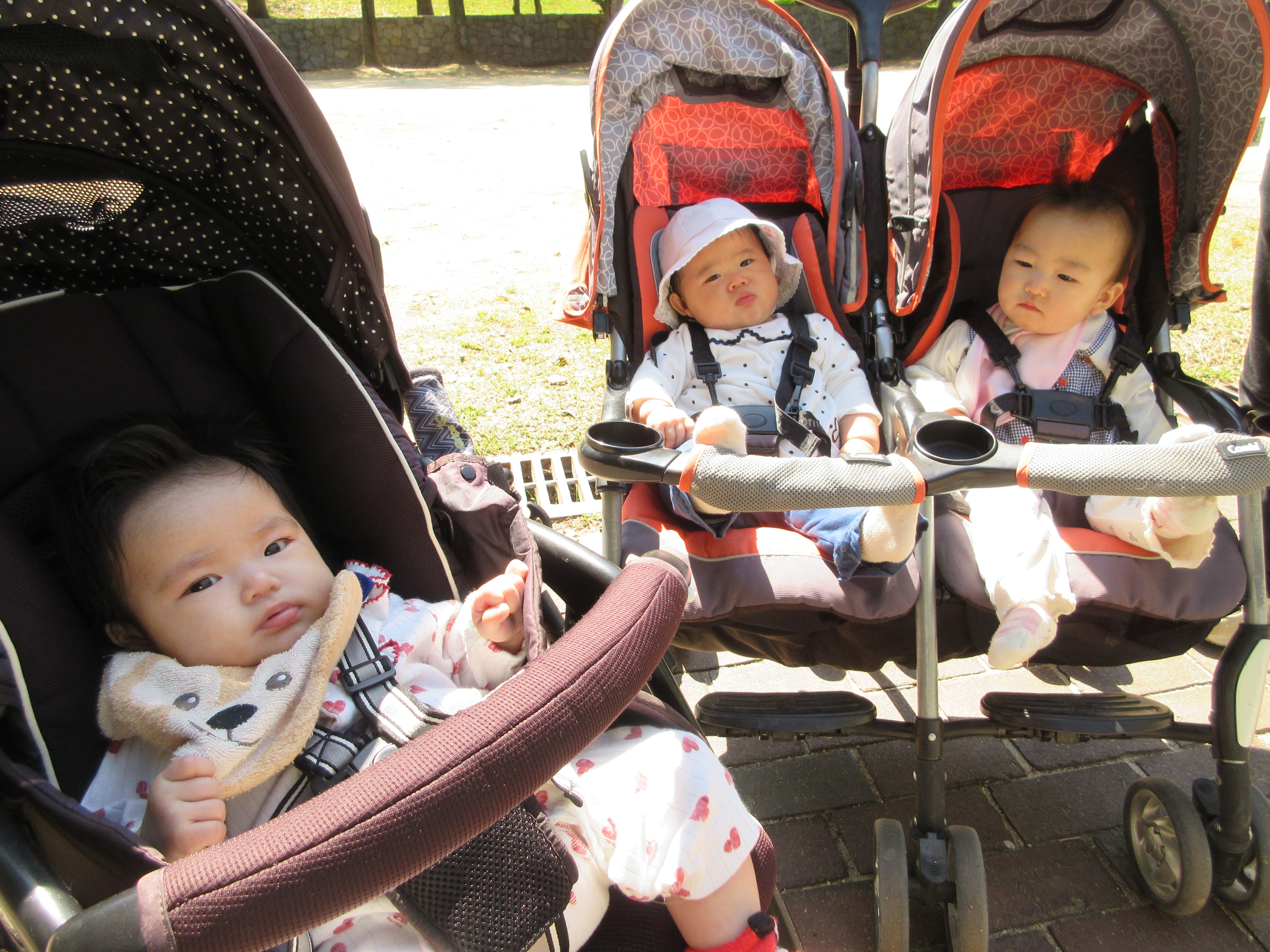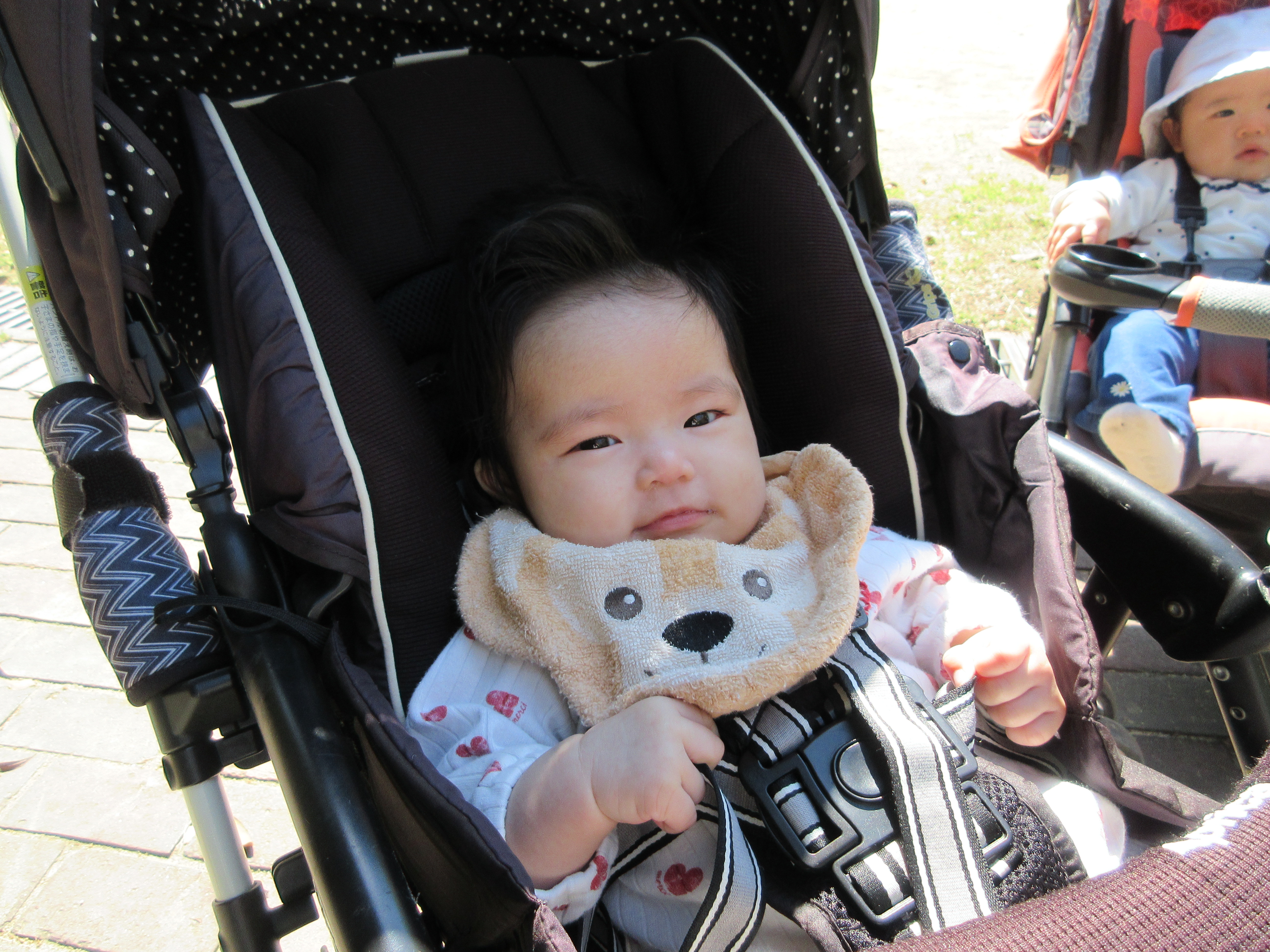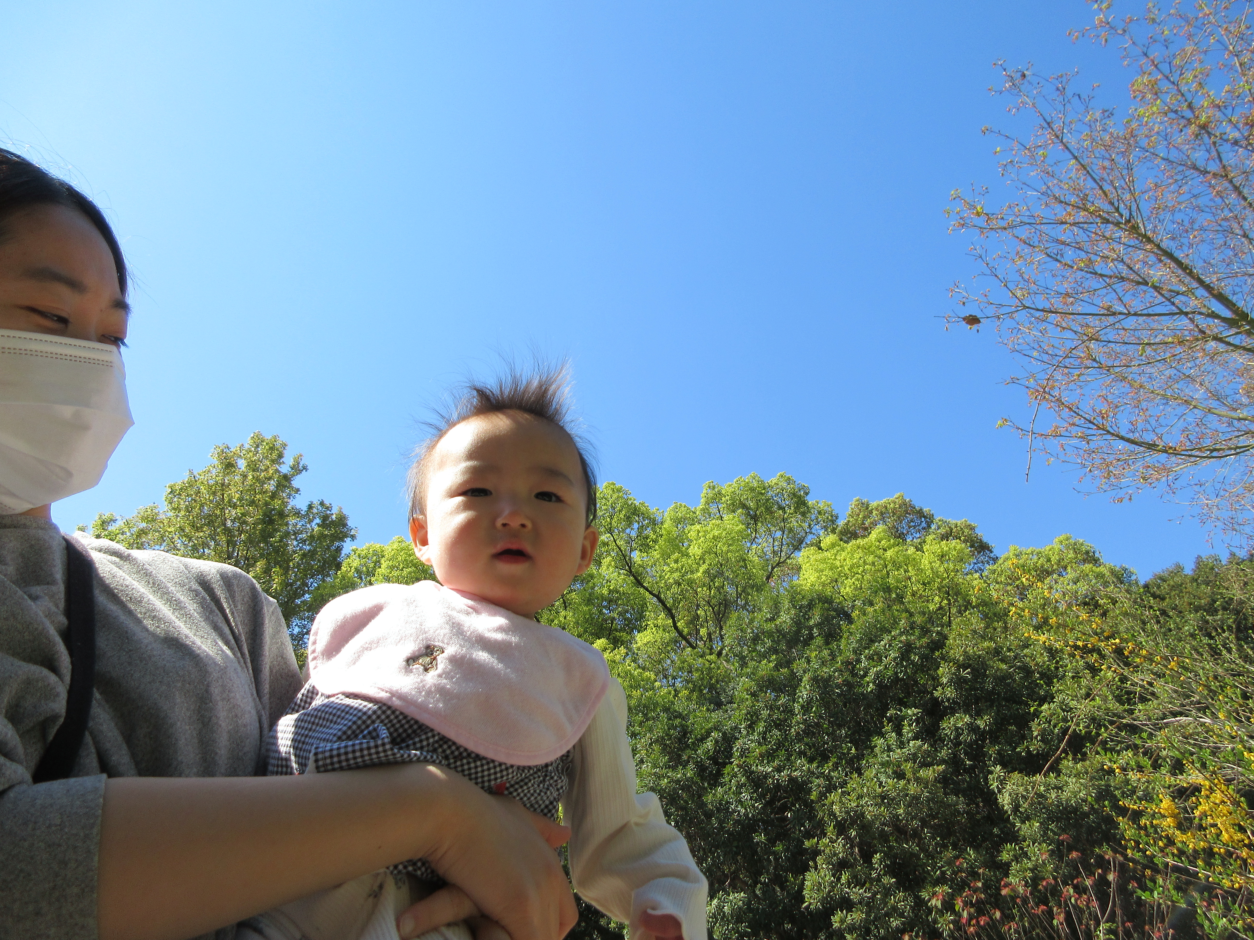 サクラの若葉が見えてきています。まぶしいくらいの日差しを浴びて3人でお外に出かけました。