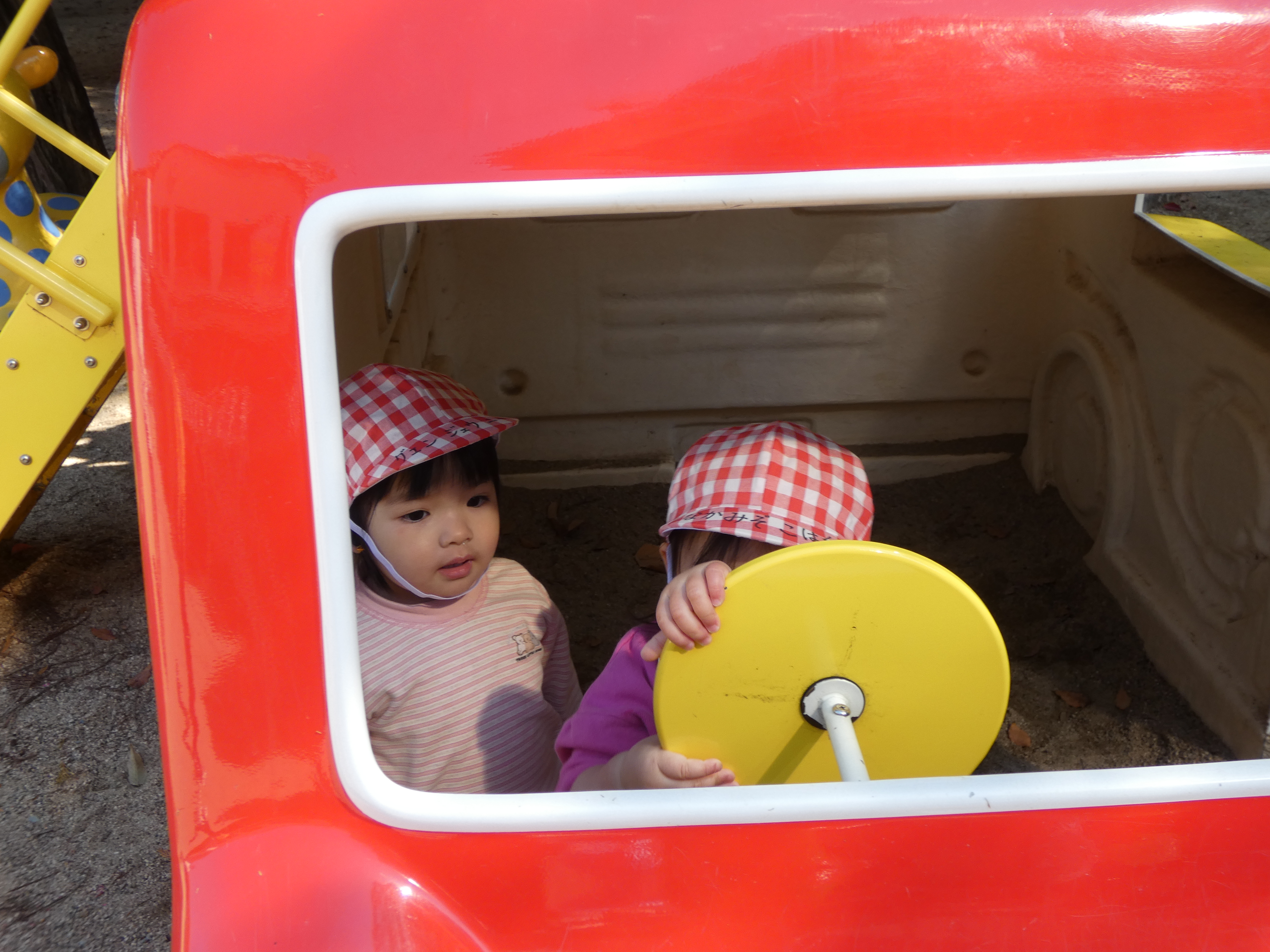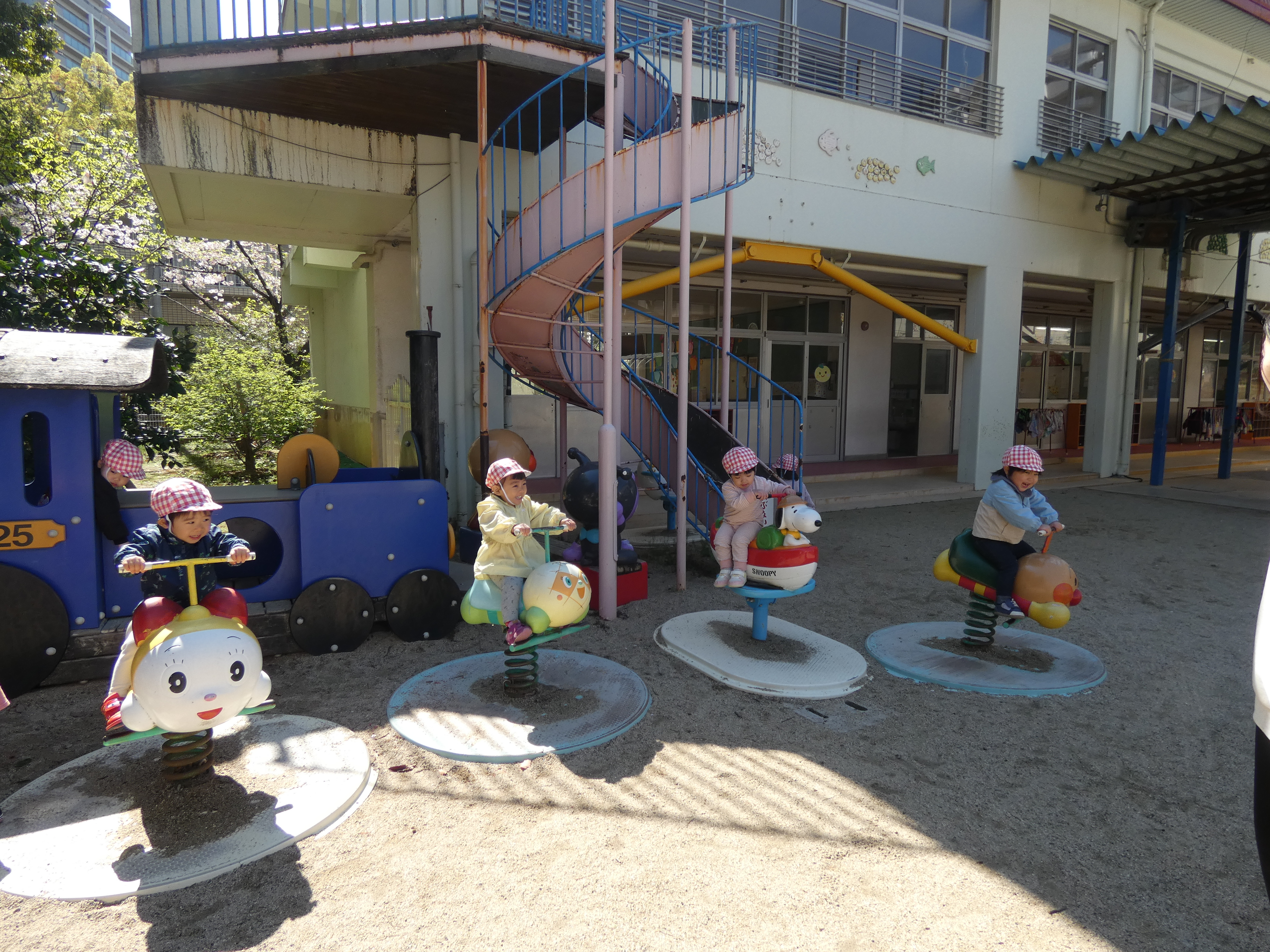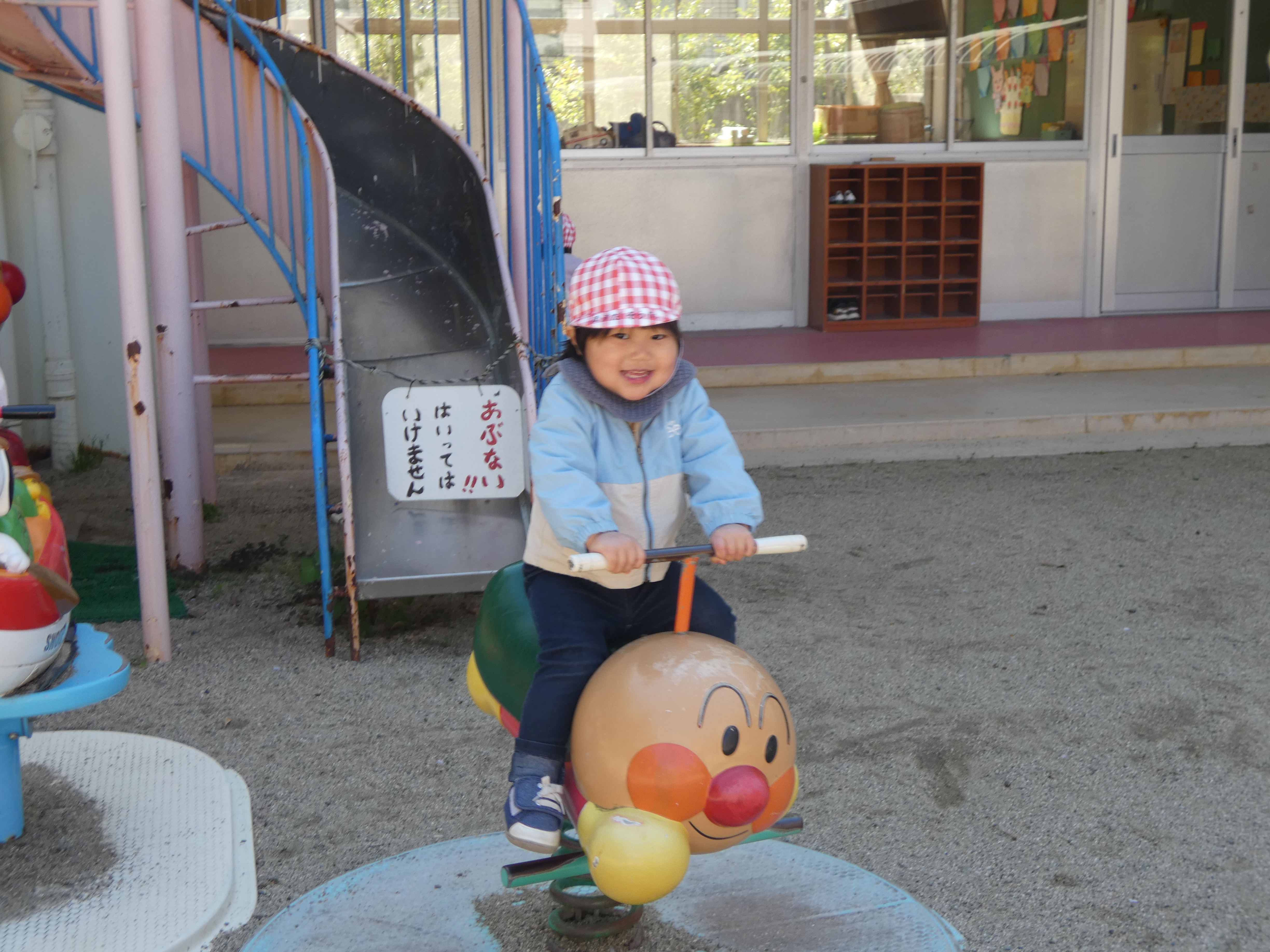 そら組さんは電車の遊具の所ですべり台をしたり、アンパンマンシーソーに乗ったりして遊びました。