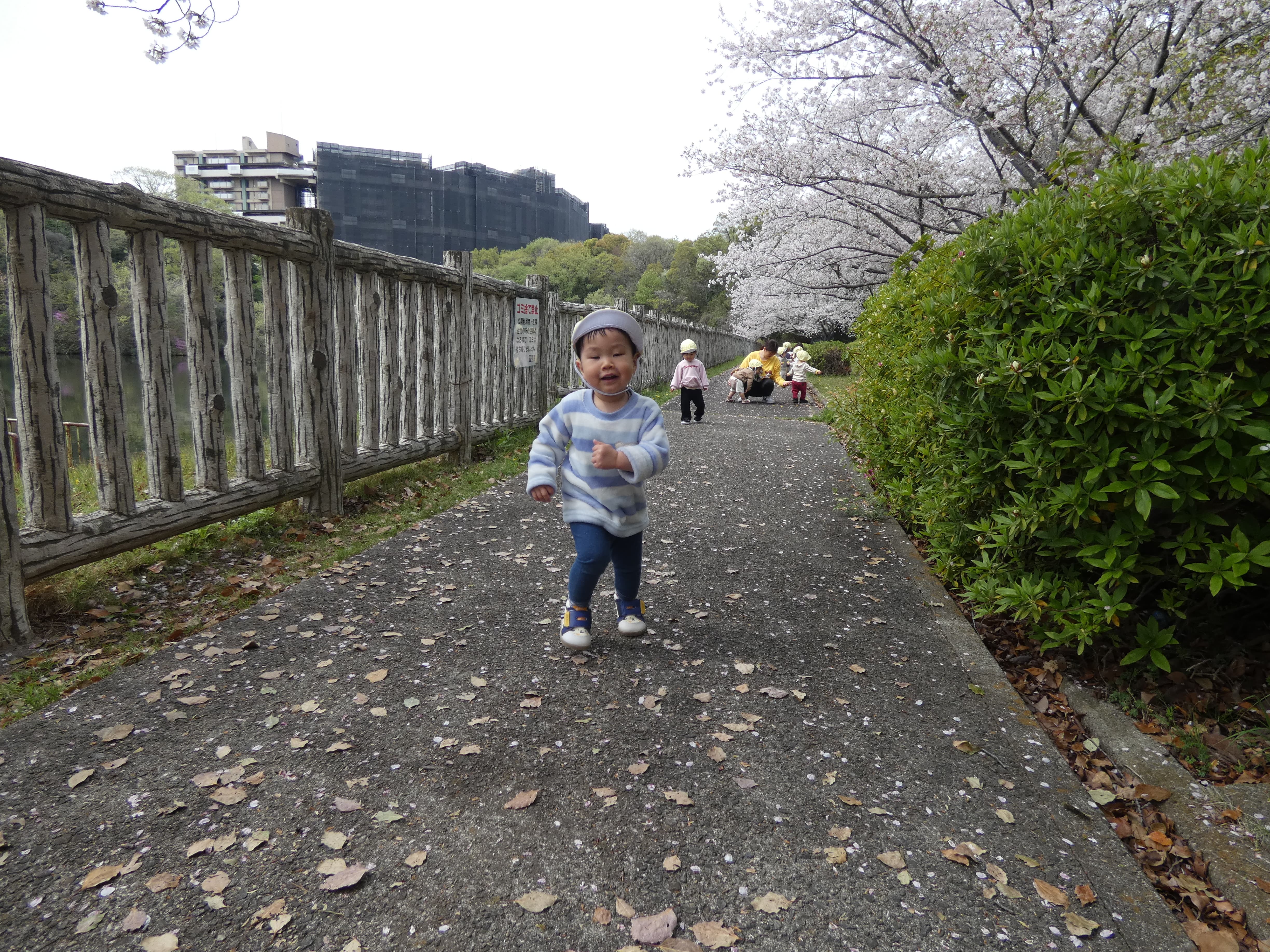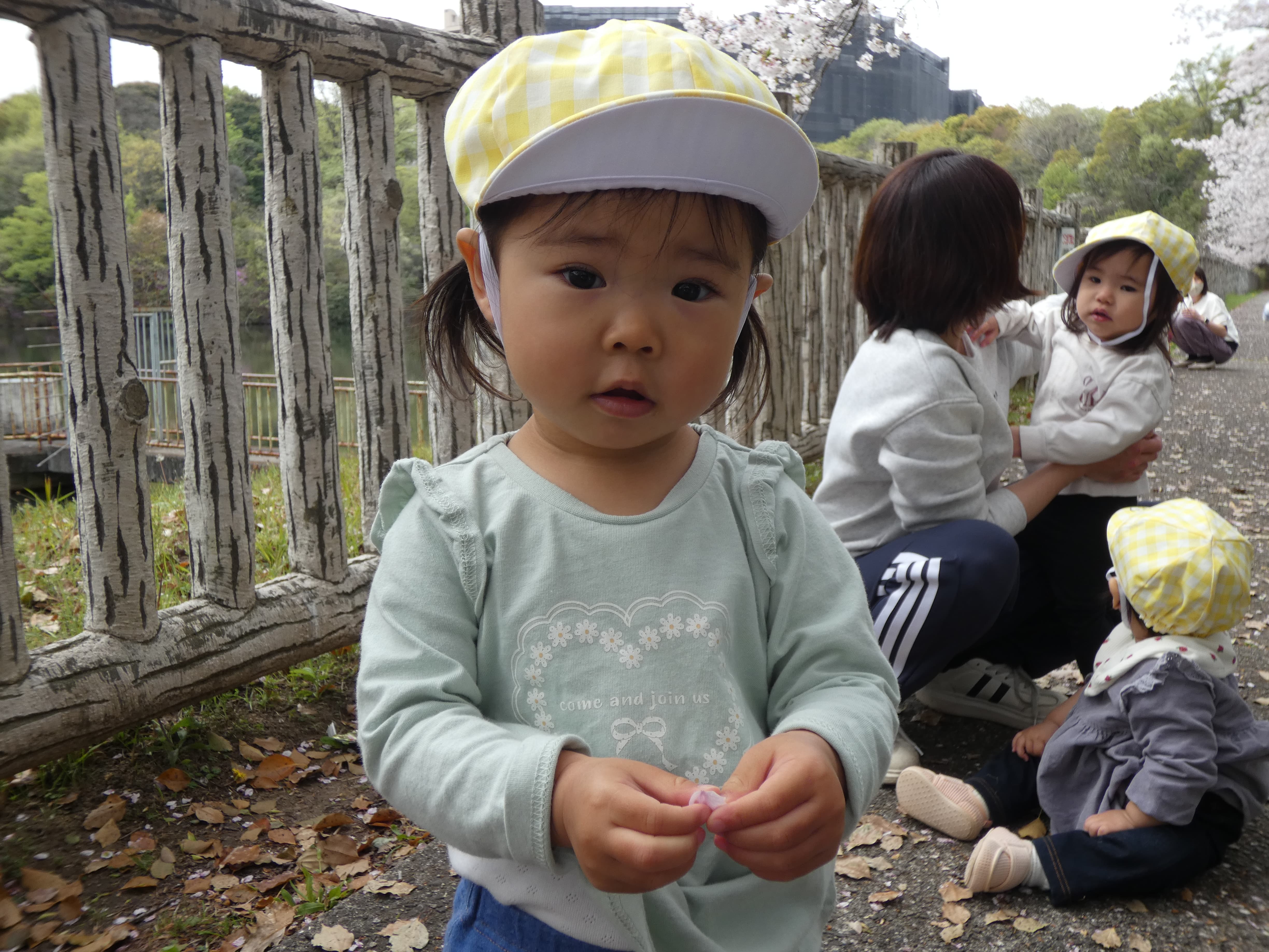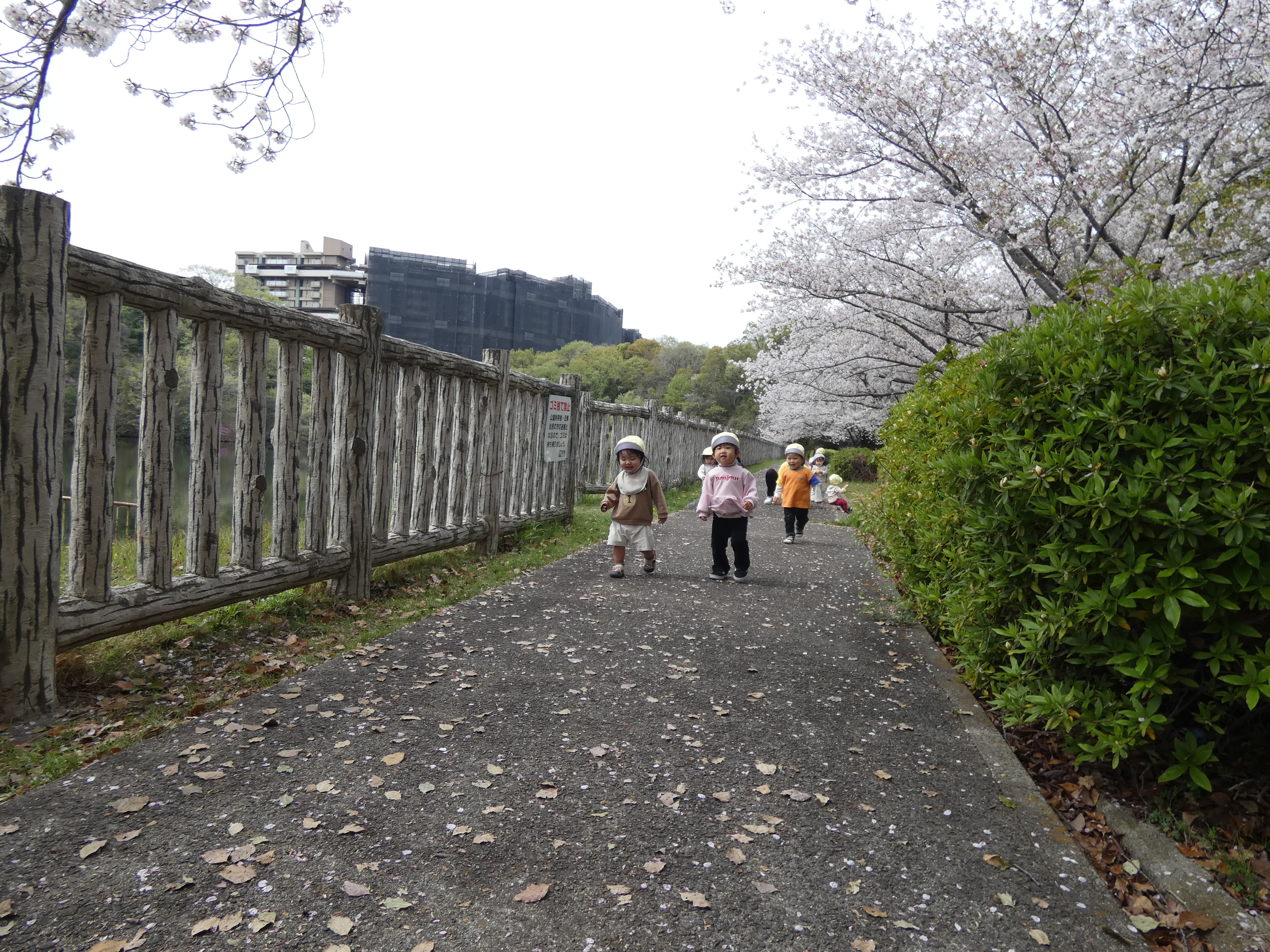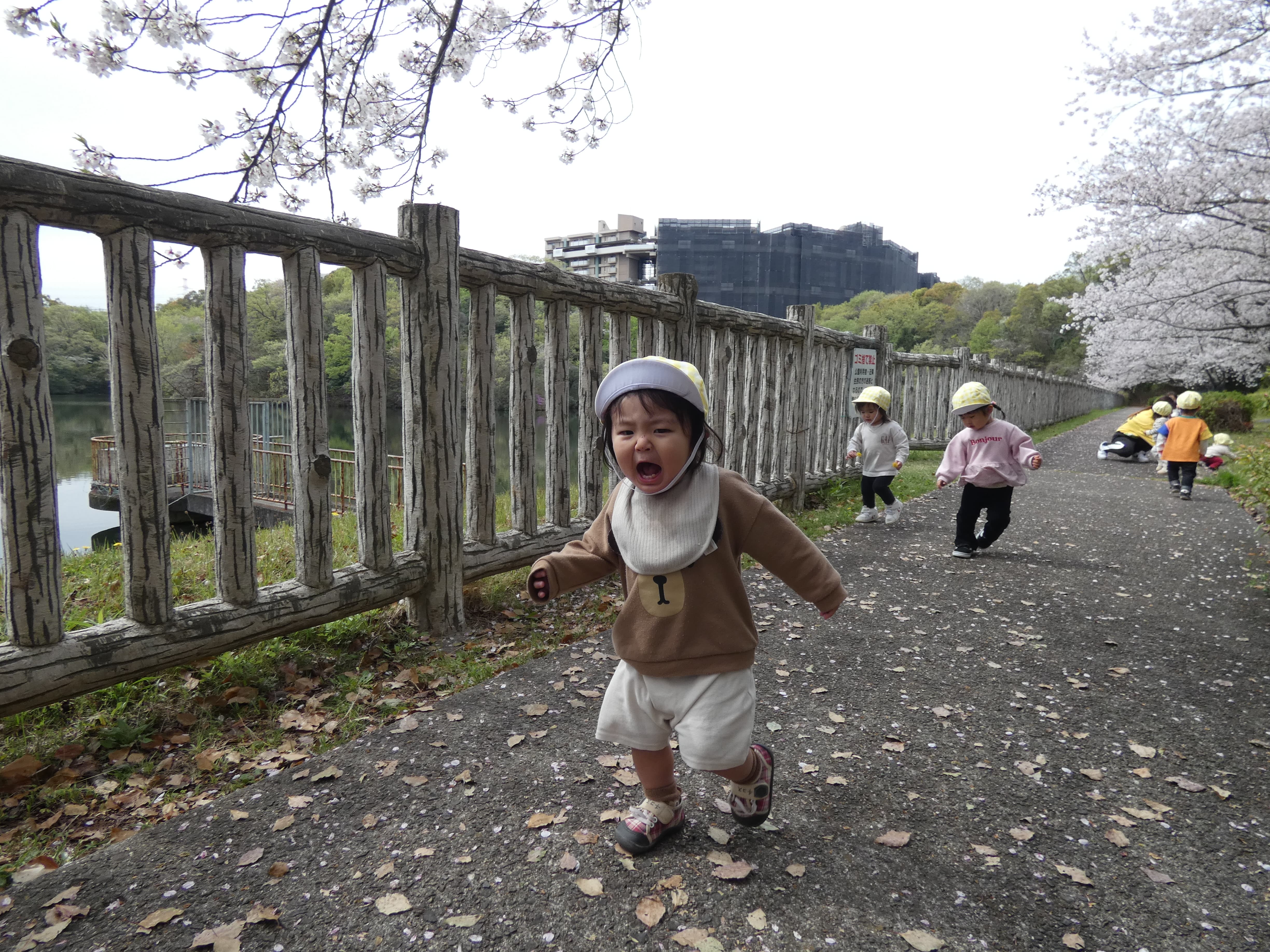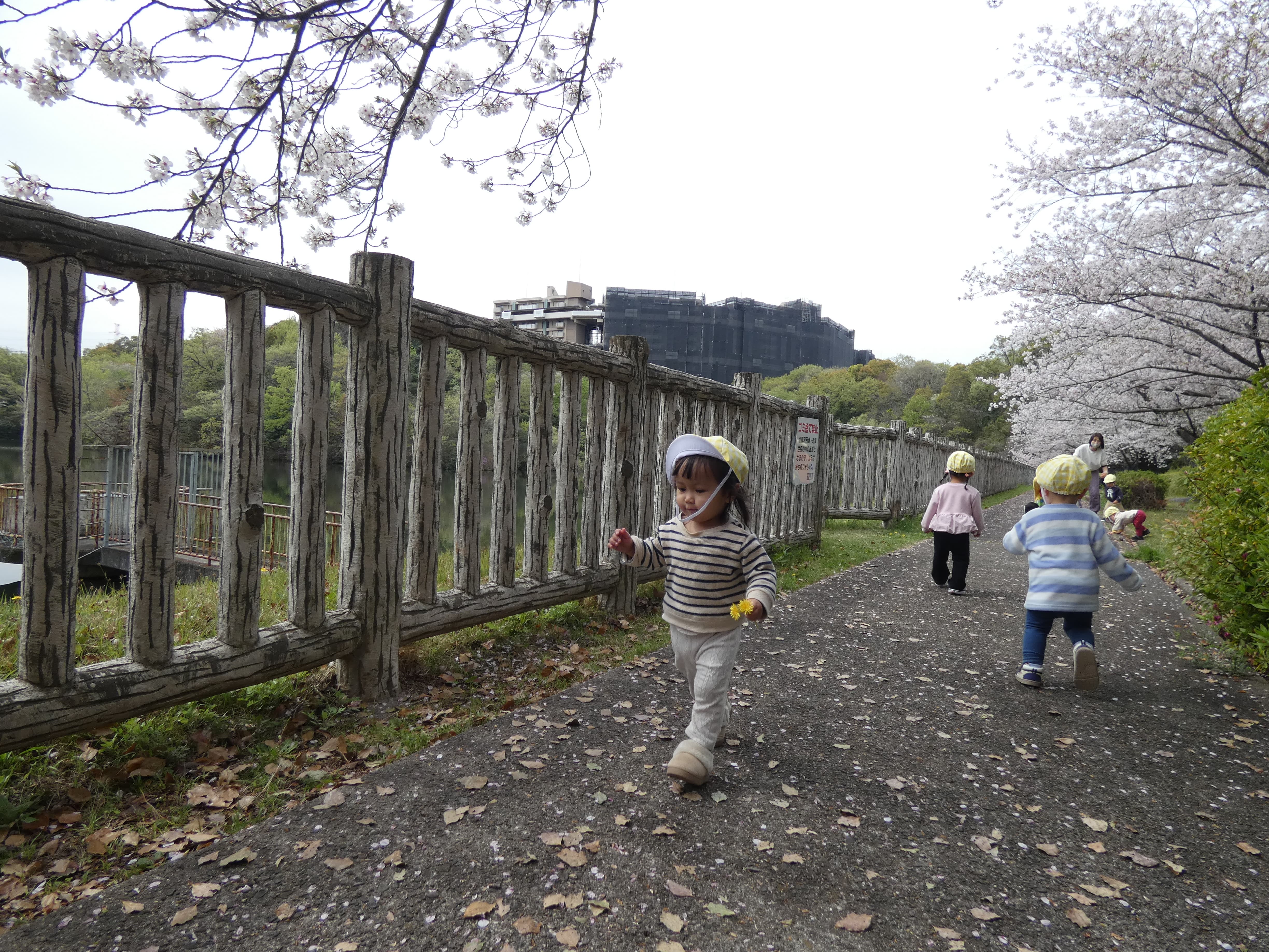 お池の公園まで遠出をしました。桜吹雪の舞う中でみんなで遊びました。