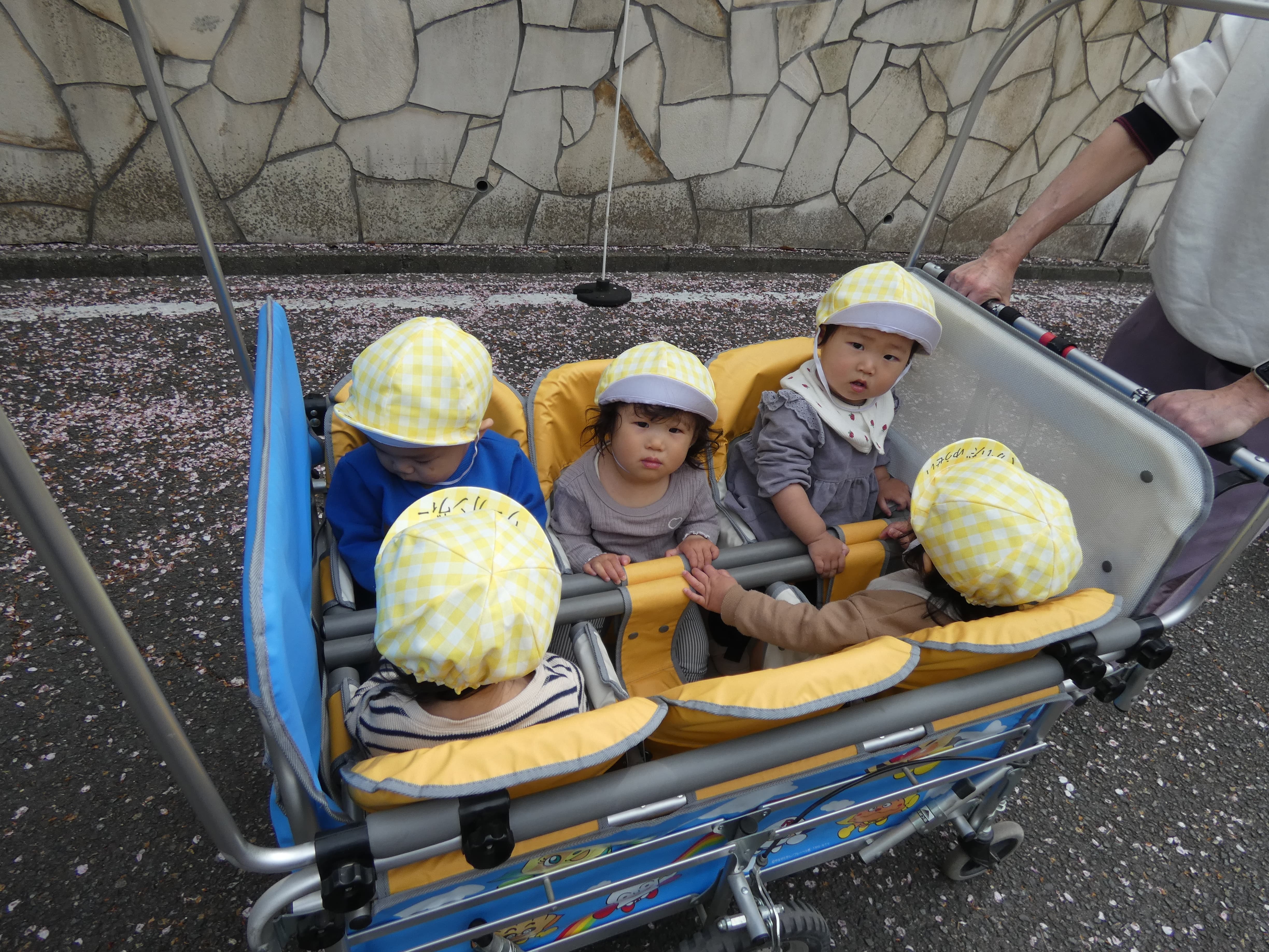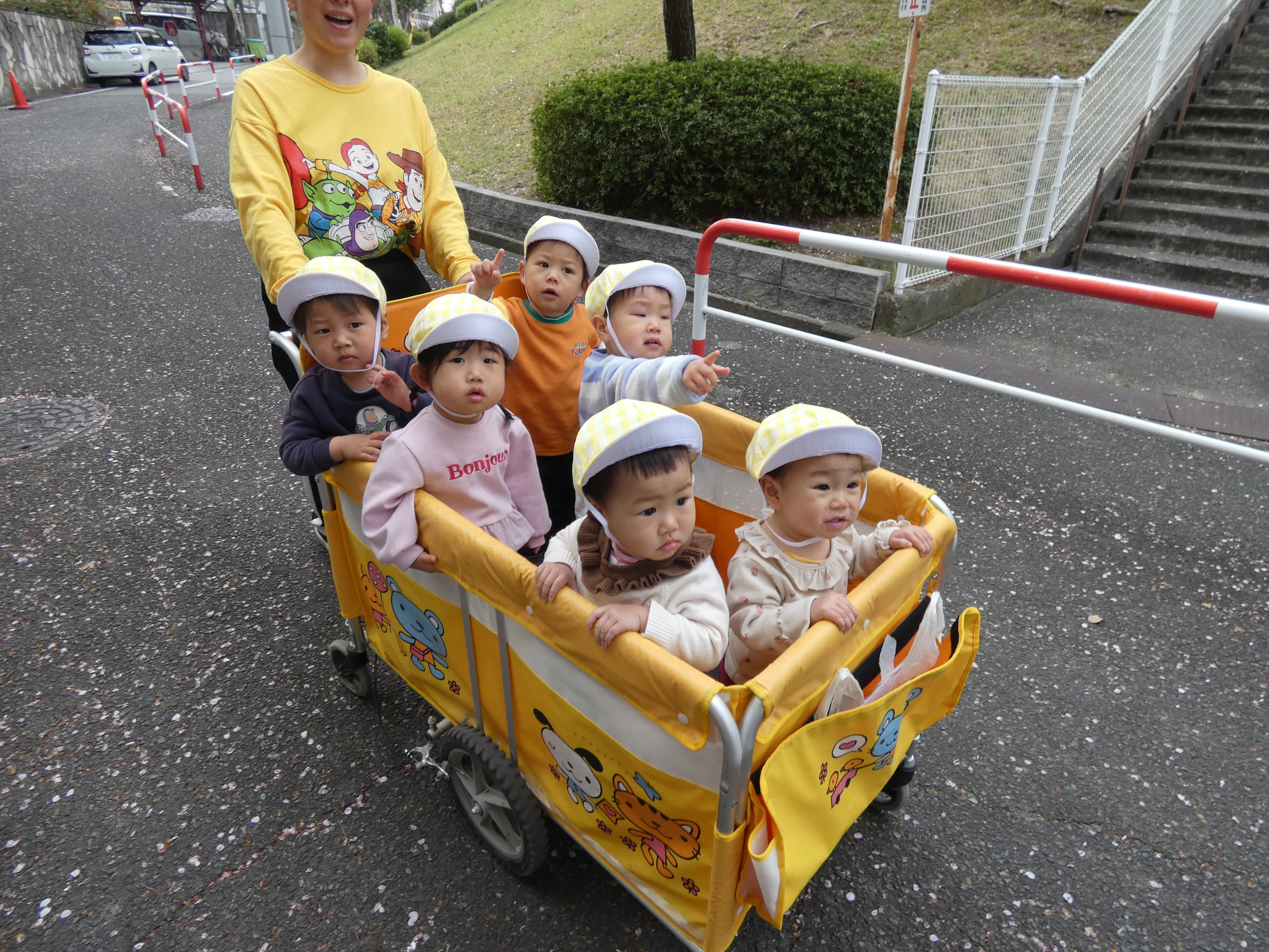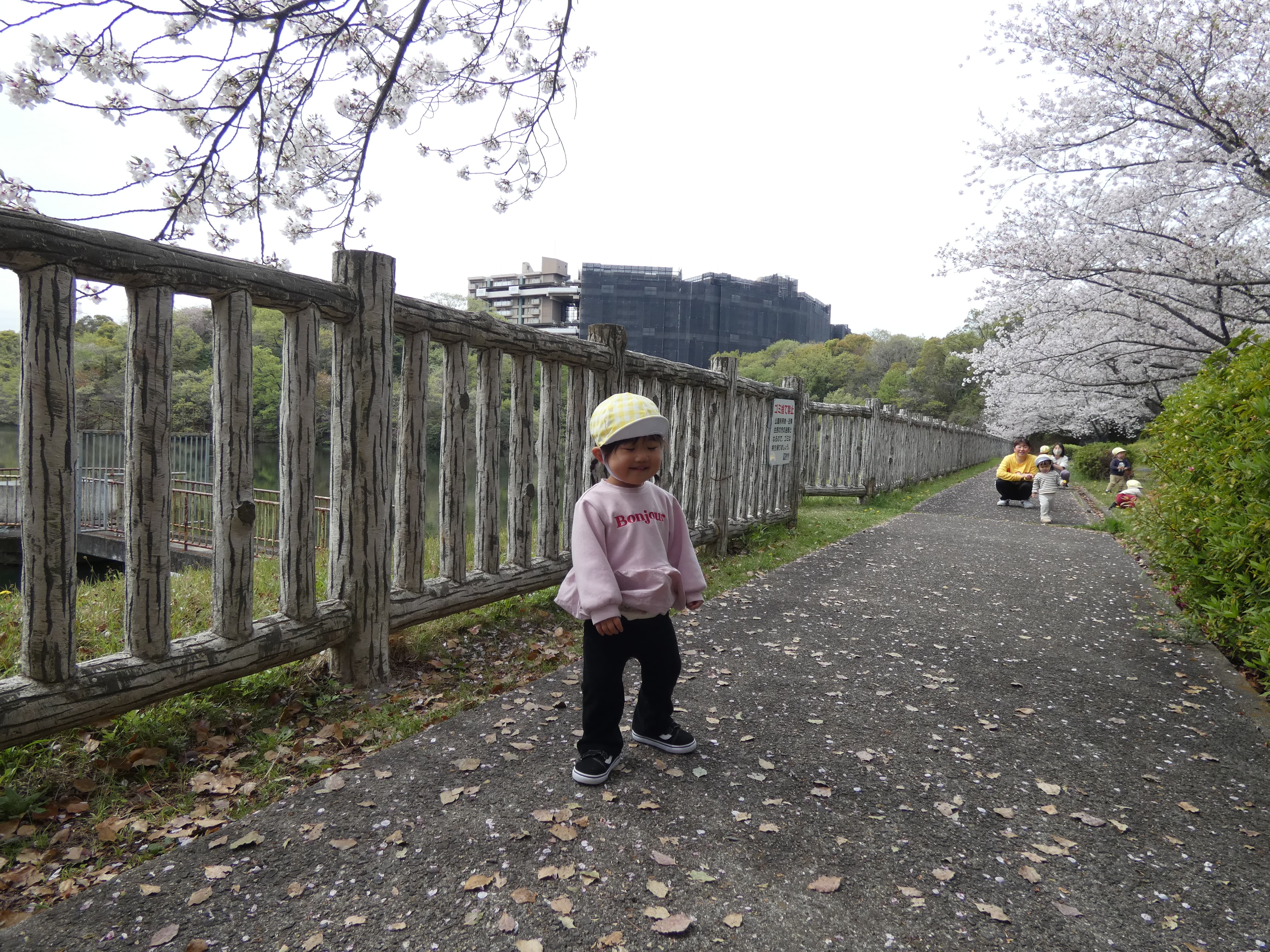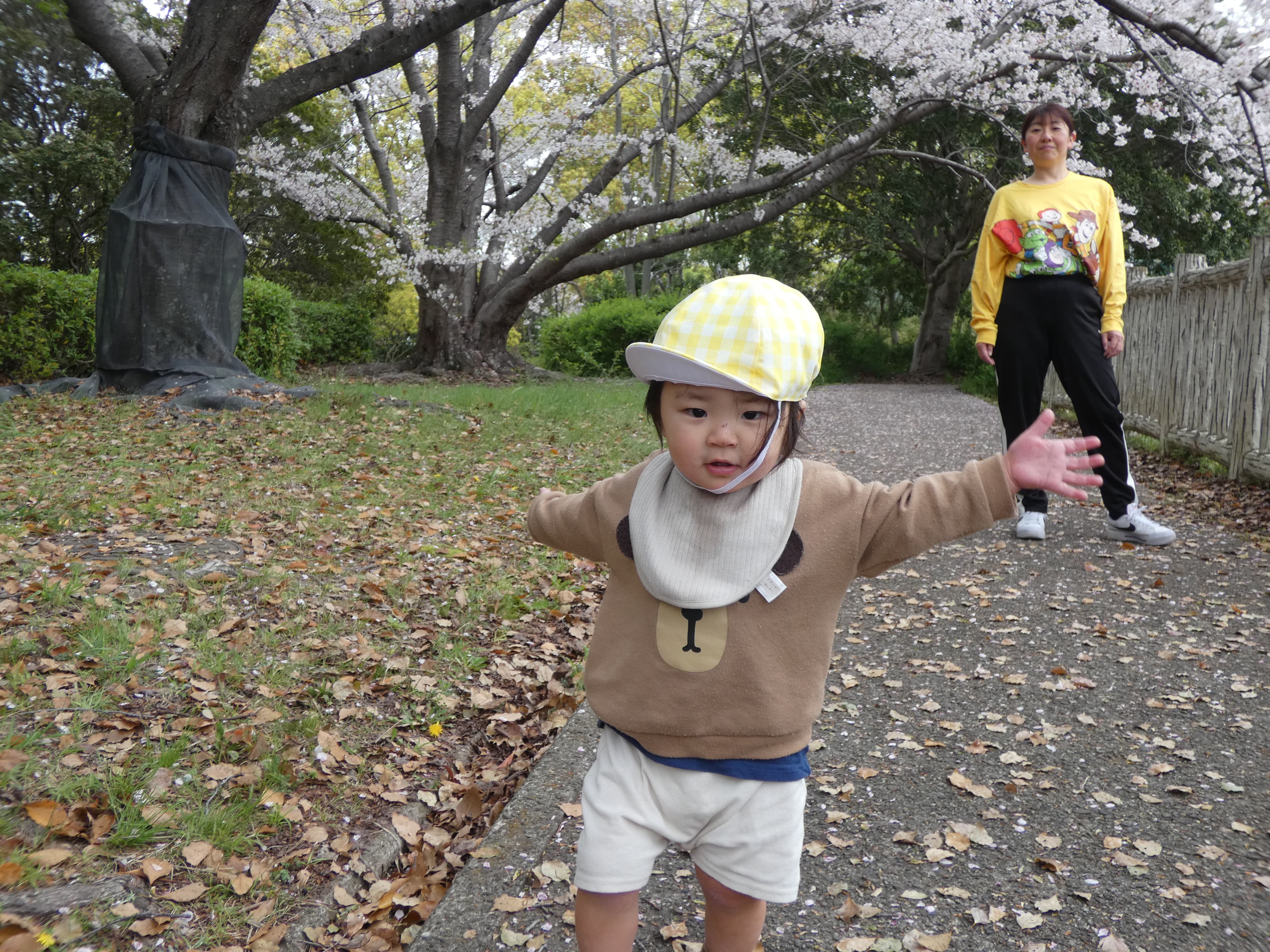 お池の公園まで遠出をしました。桜吹雪の舞う中でみんなで遊びました。