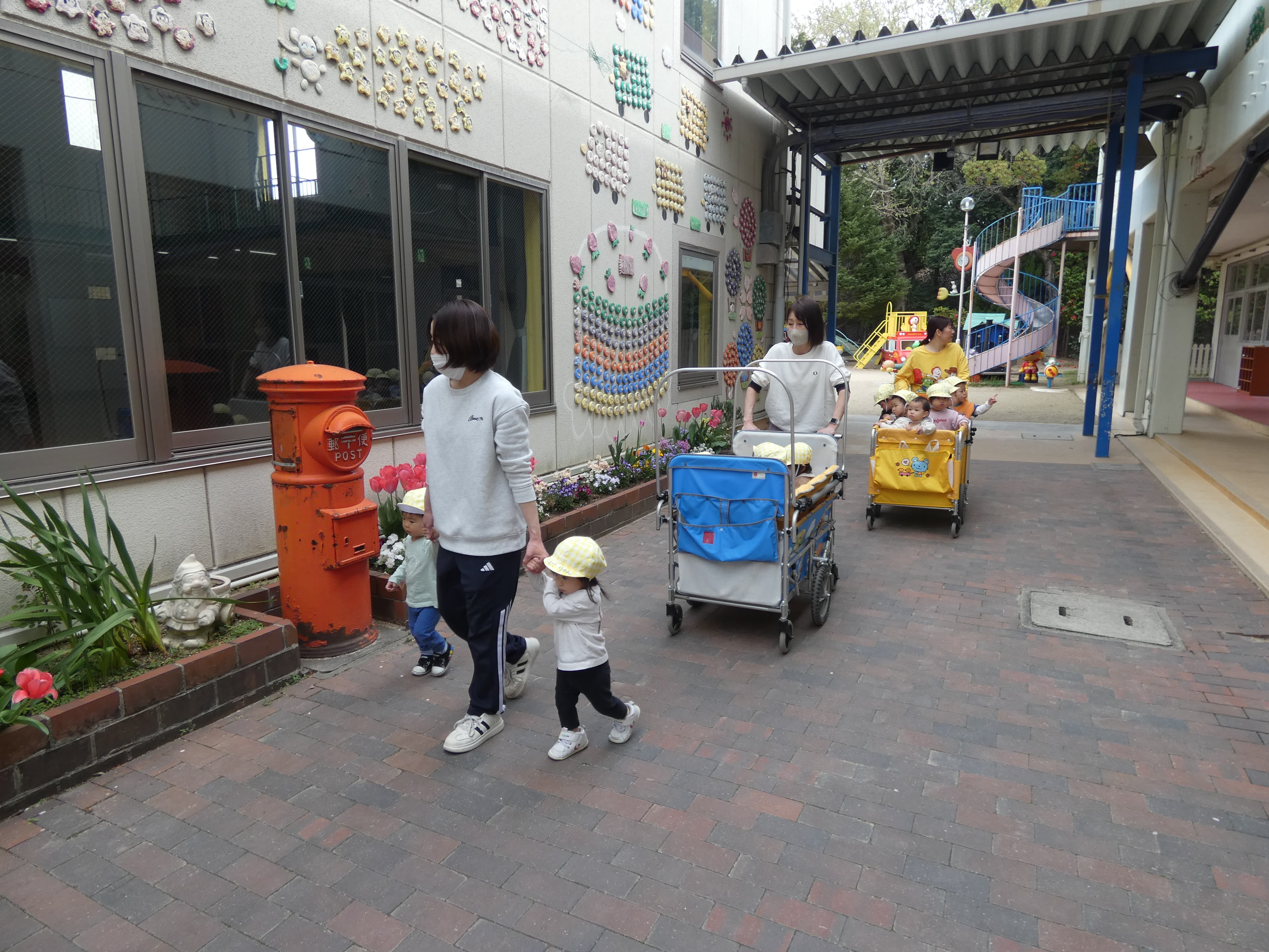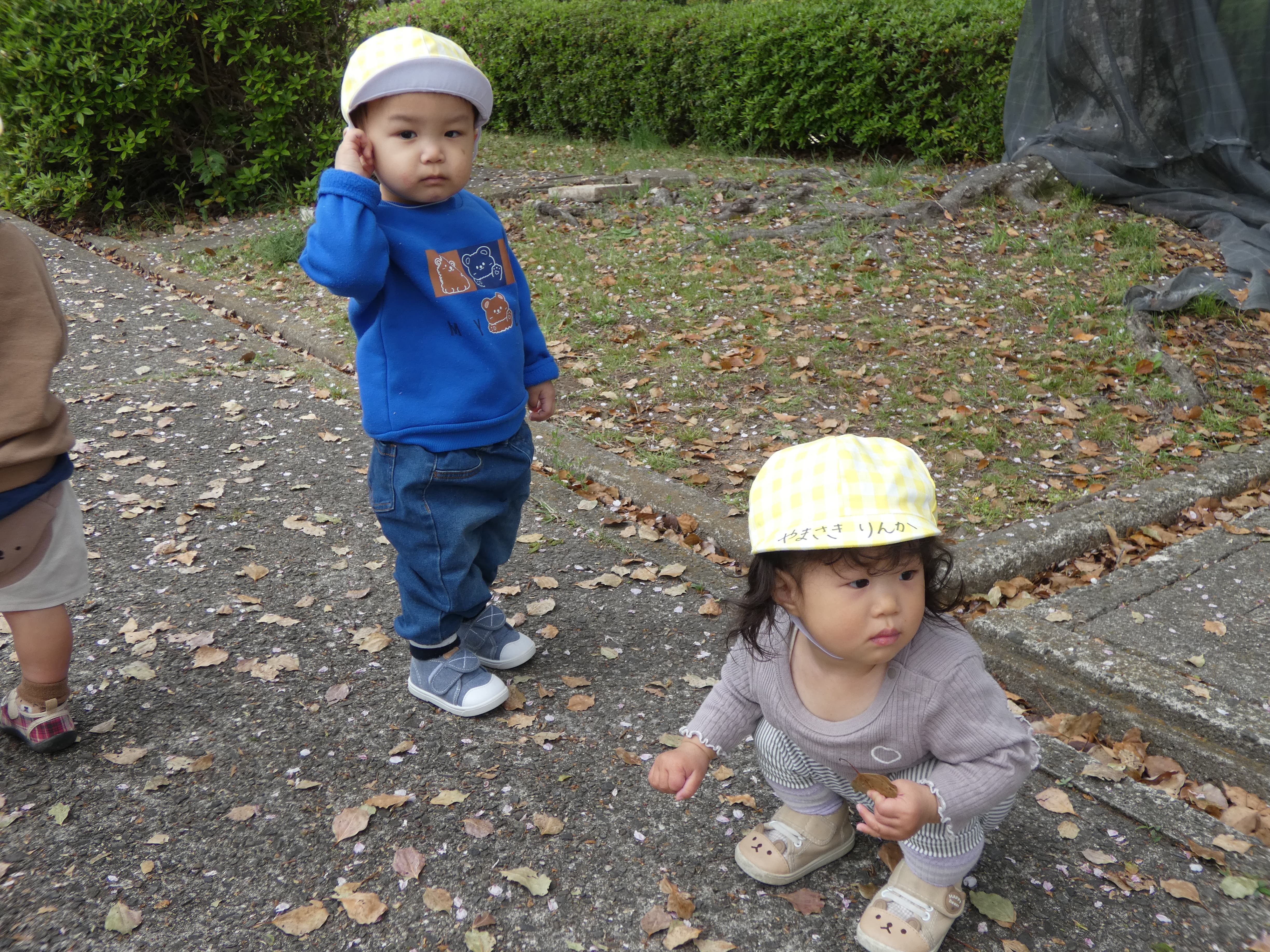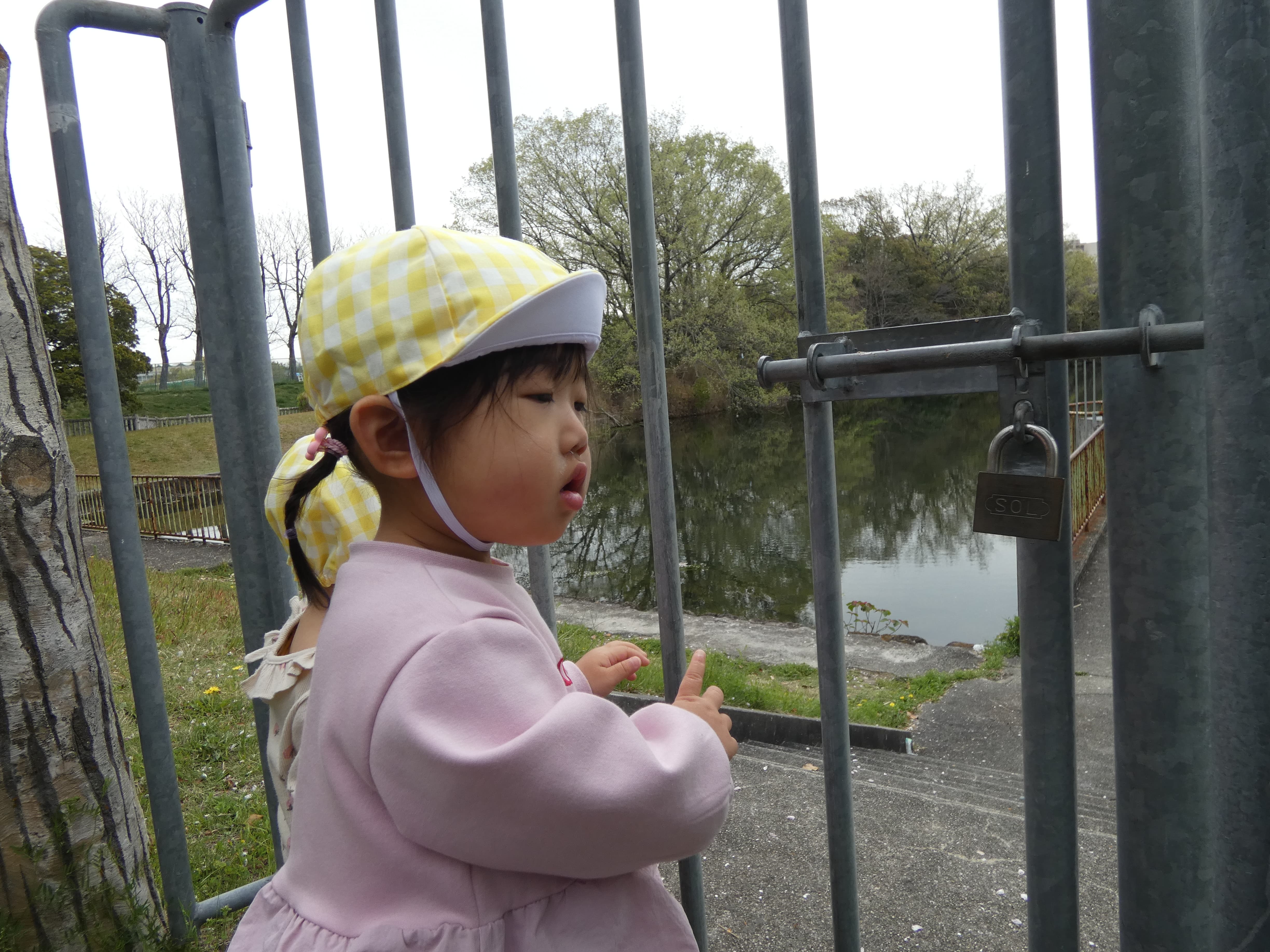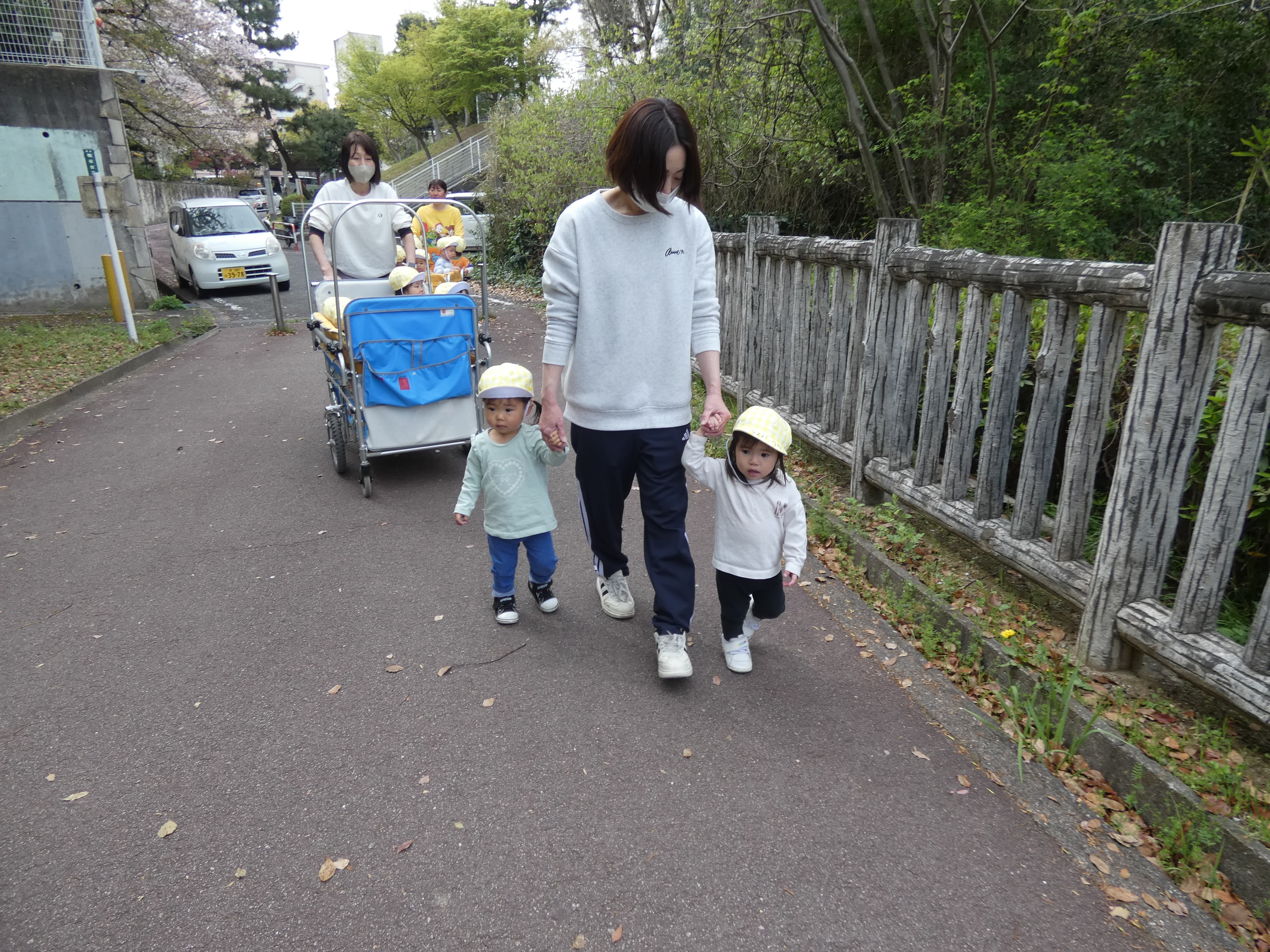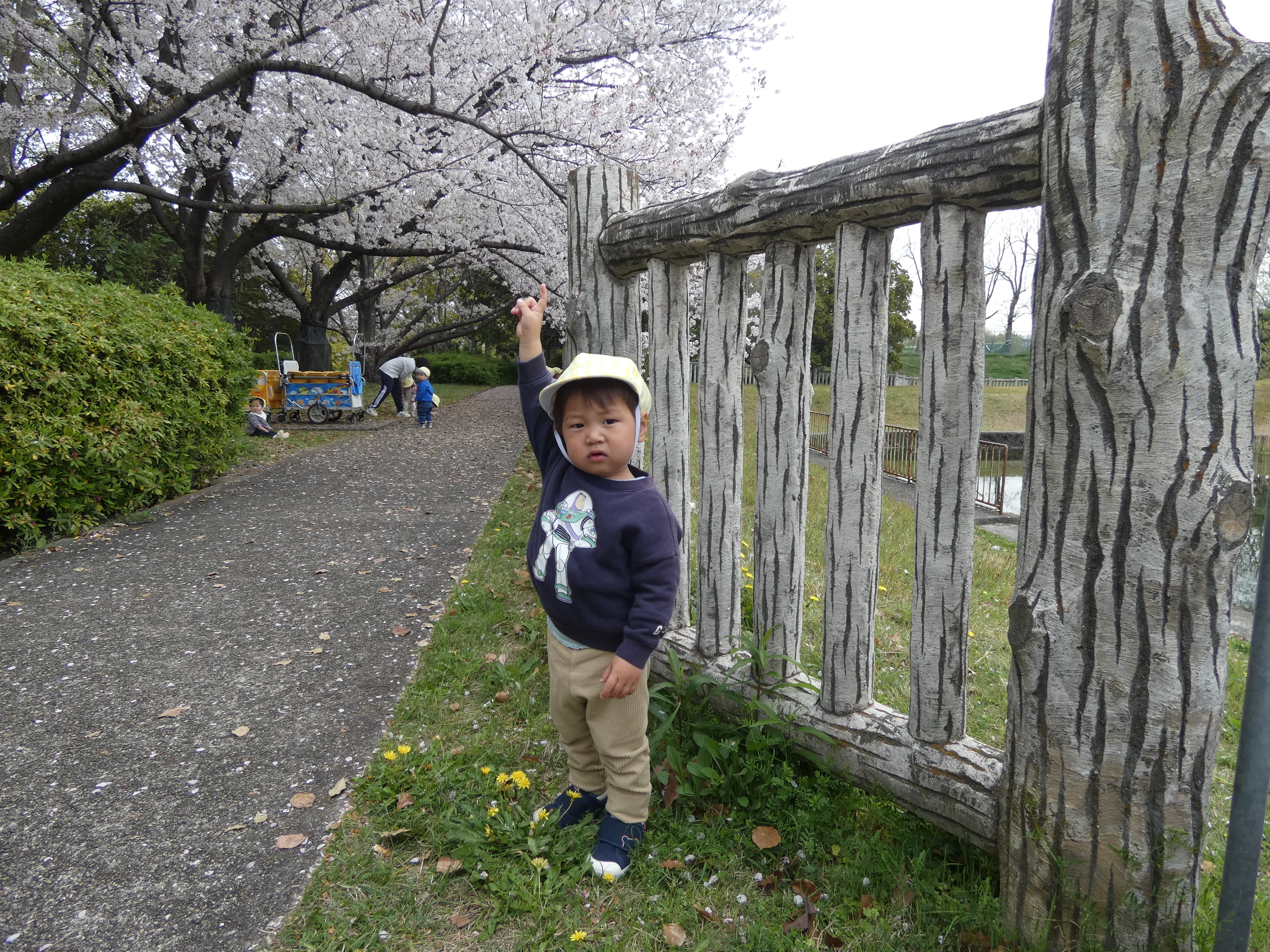 お池の公園まで遠出をしました。桜吹雪の舞う中でみんなで遊びました。