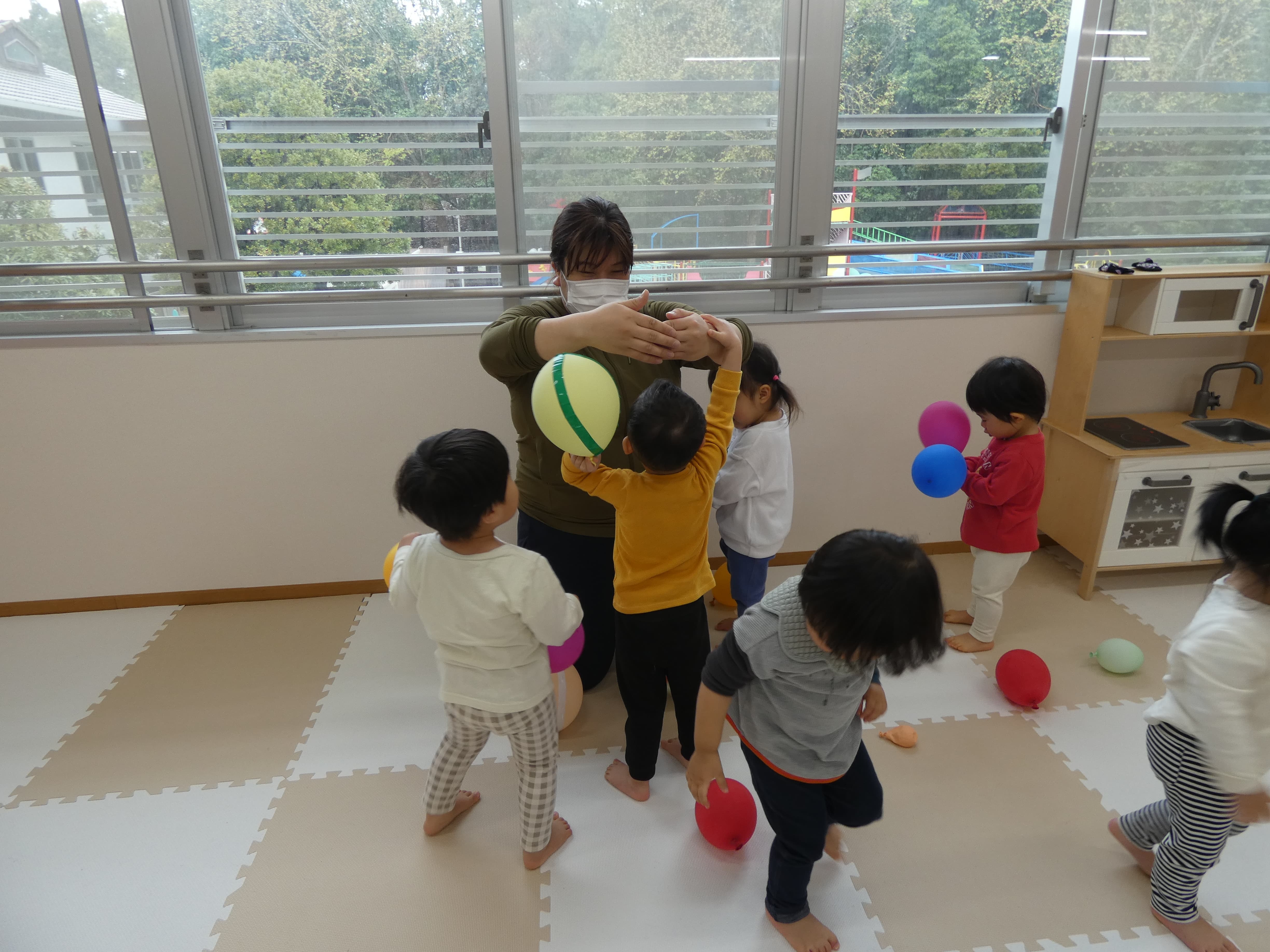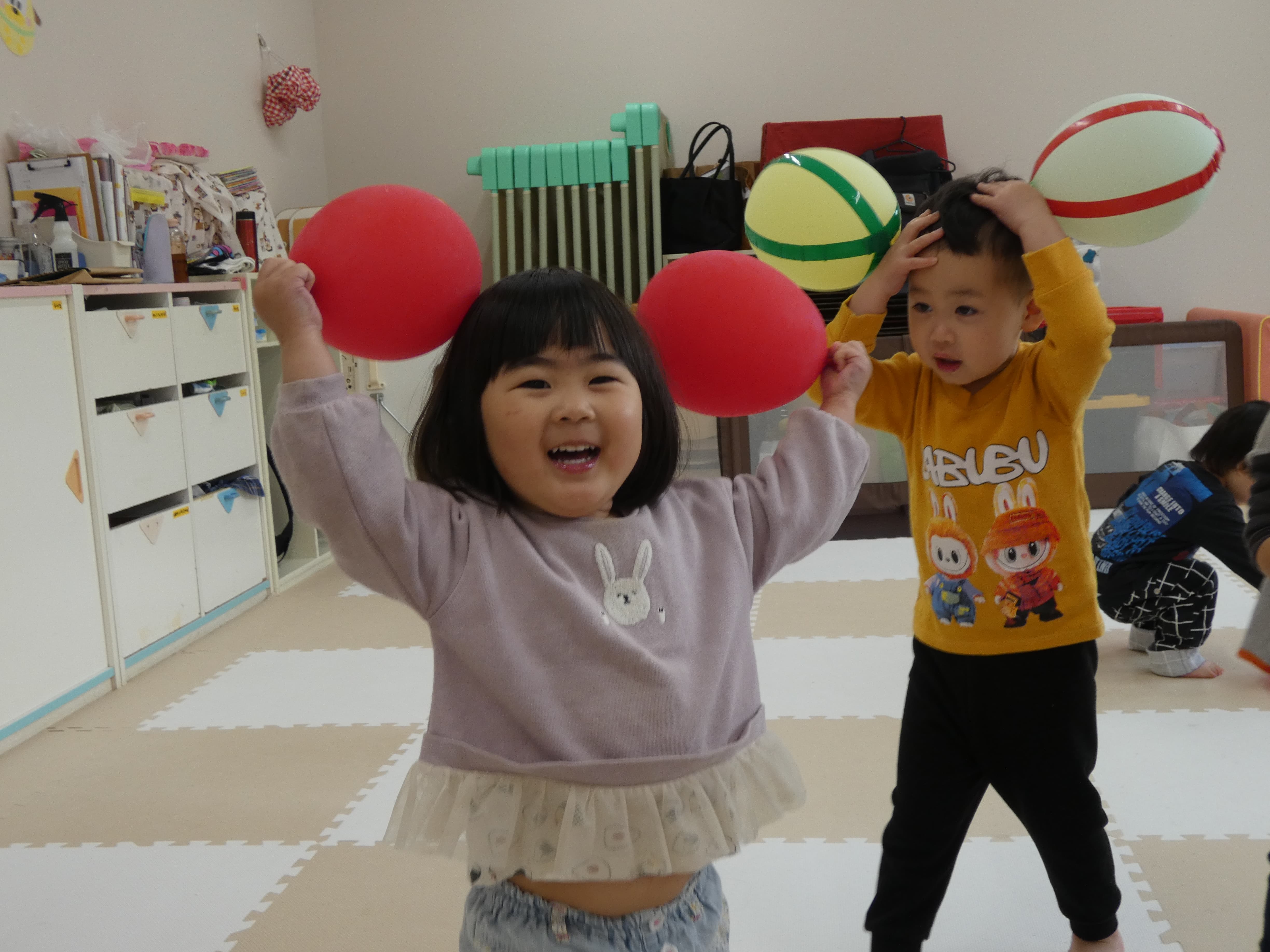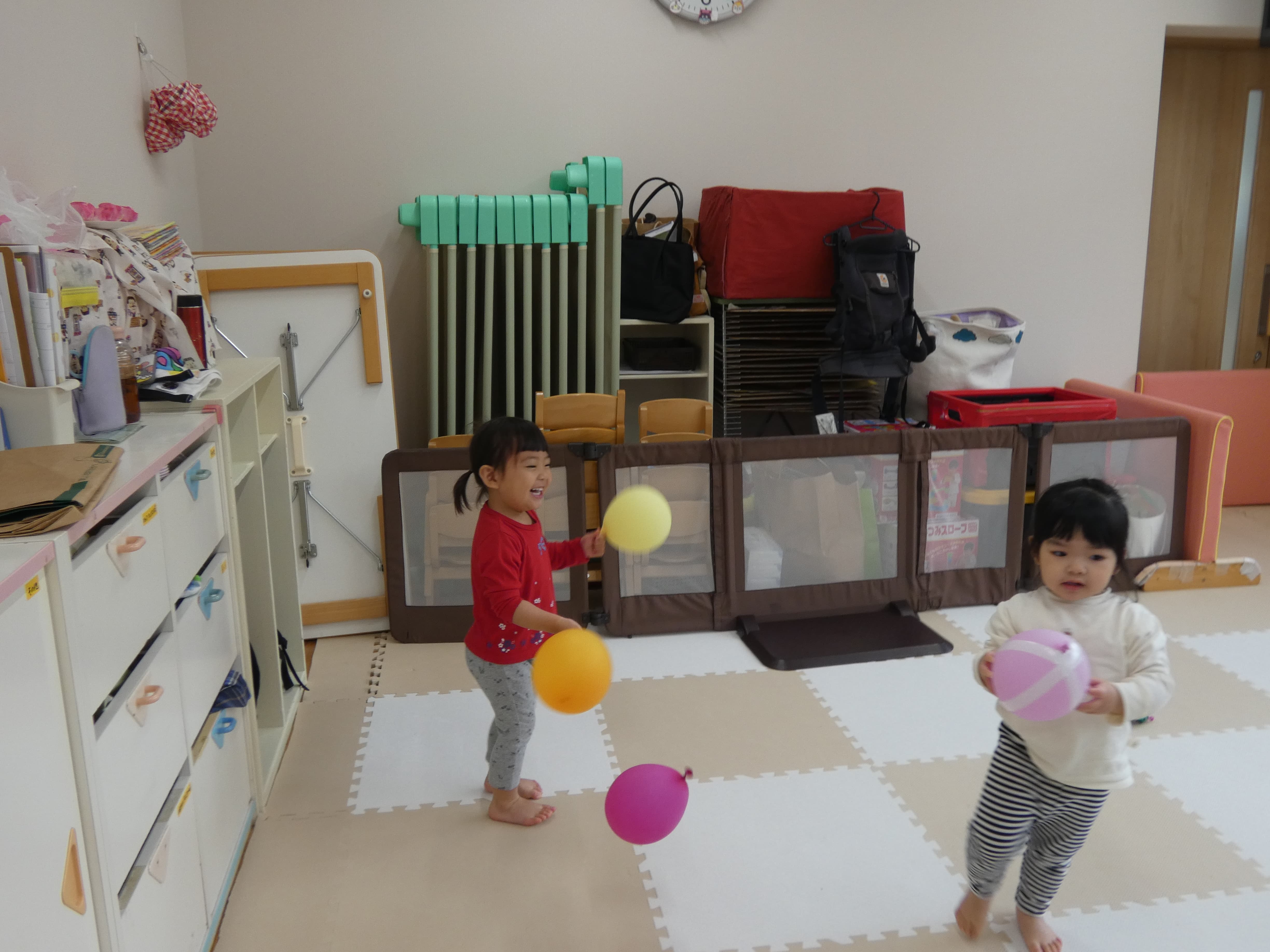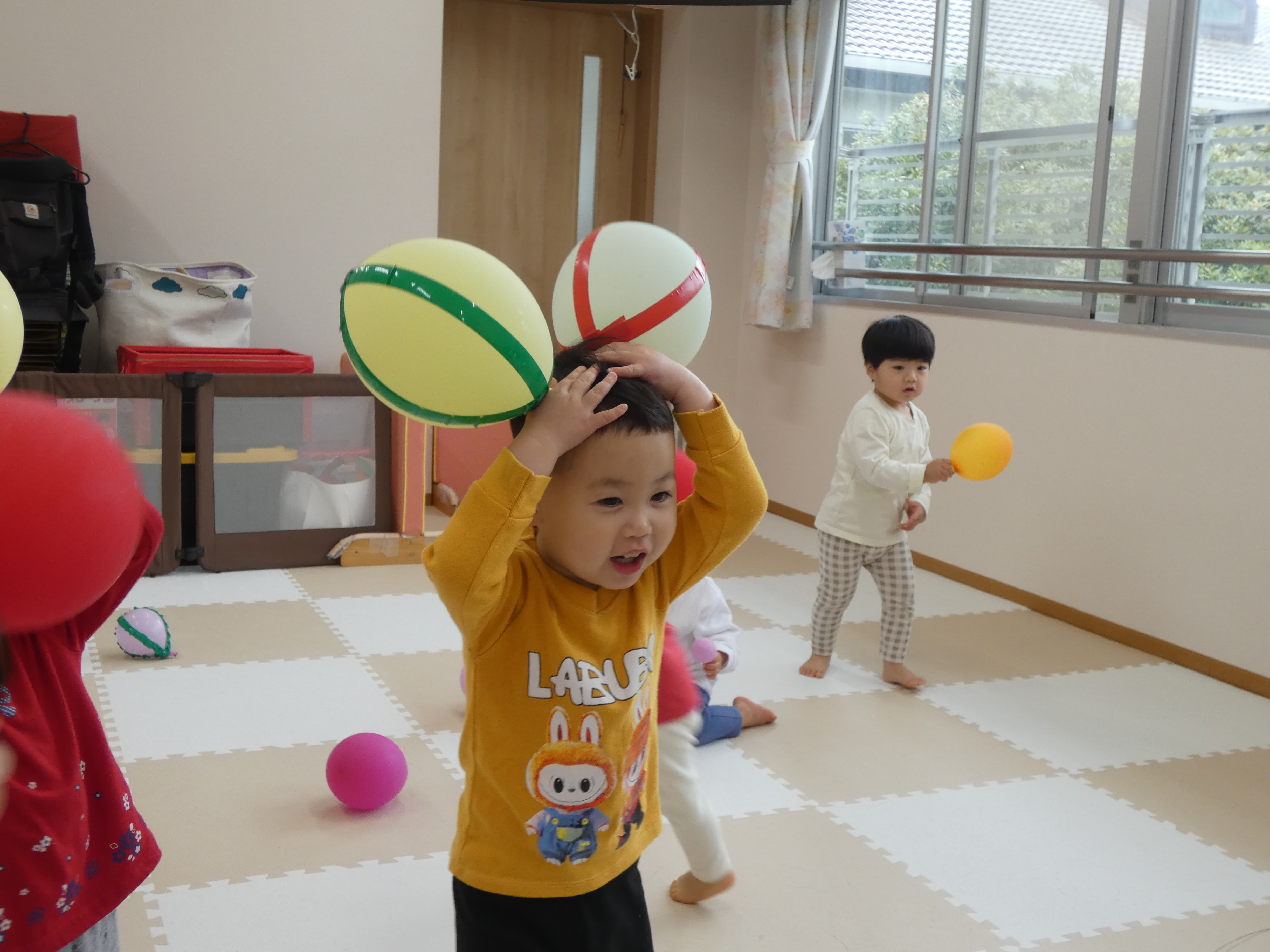 雨でお外遊びができないけど、身体を動かしたいみんなは風船でたくさん遊びました。