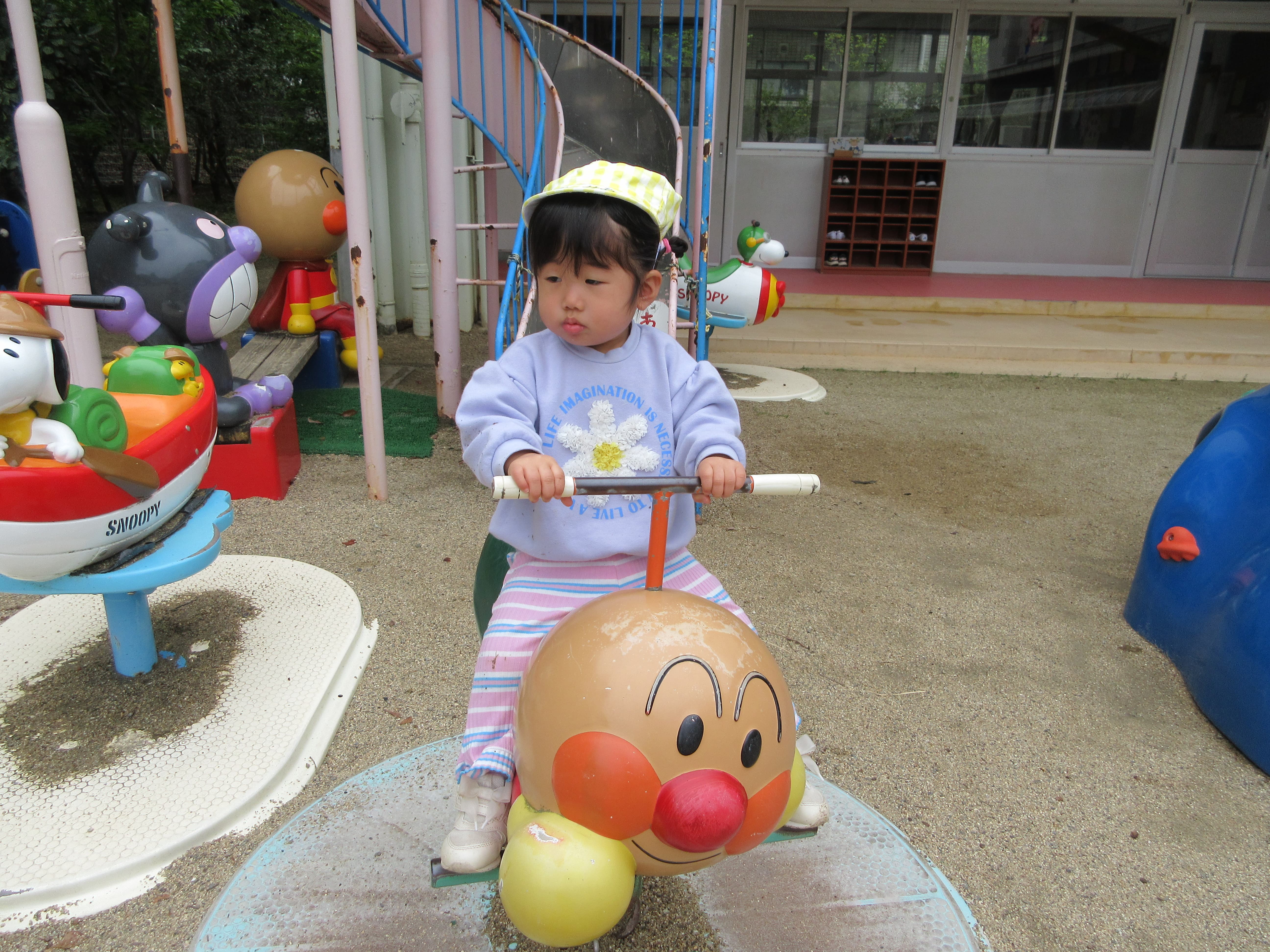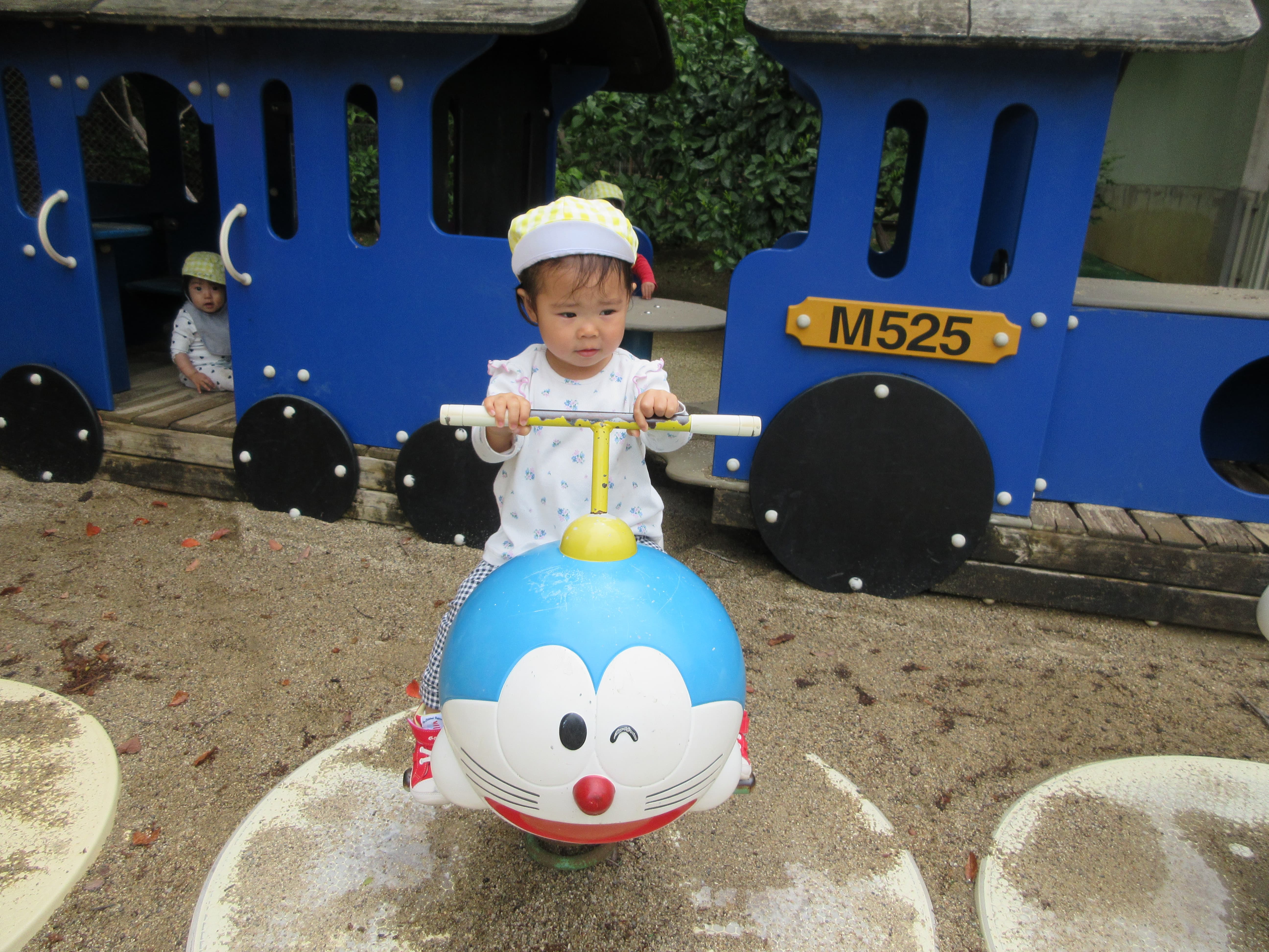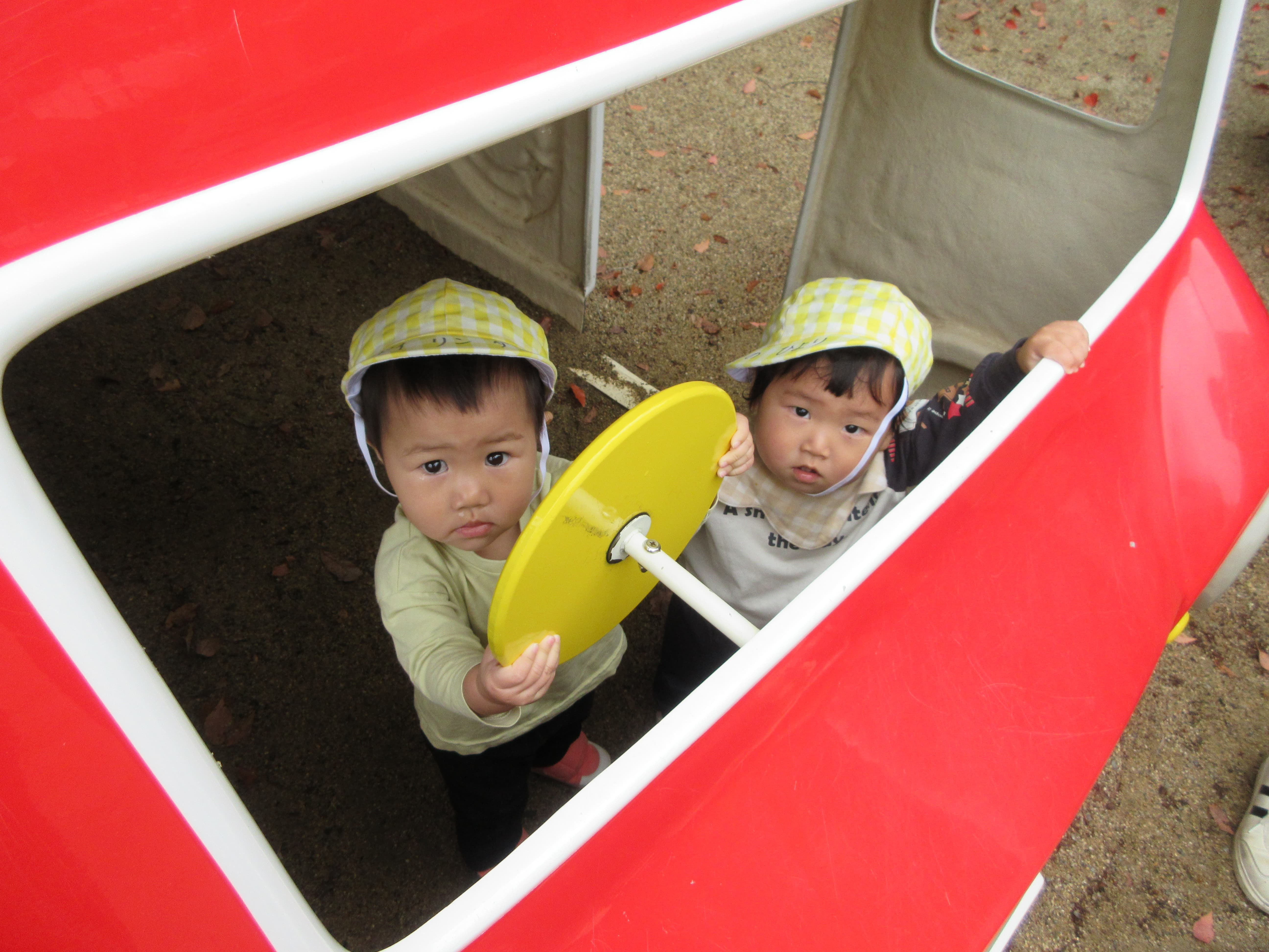 昨日の雨は上がりましたが、まだ曇天。お部屋でも遊びましたが、園庭でもすこし遊びました。