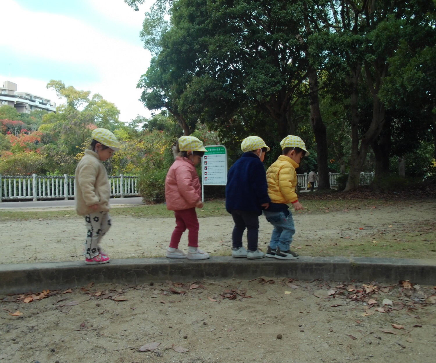 すべての記事, 美木多チコスブログ 19 11月 2025 お山の公園 つき組は枯れ葉がいっぱい積もっているお山の公園に。お山を登るのも好きだけど、お砂場のヘリを歩く行進もお気に入りの遊びです。 美木多 幼稚園