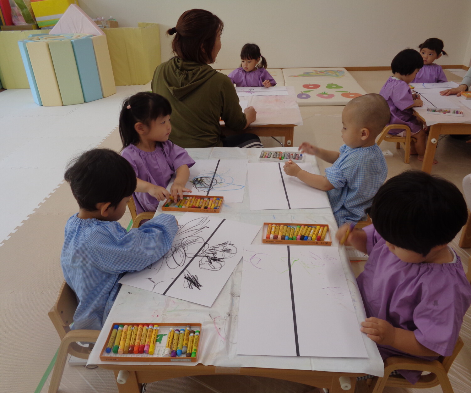 美木多チコスブログ 11 9月 2025 なぐりがき(つき組) 白い画用紙に横1本の補助線がひかれてあります。その上になぐりがきをしました。舟井先生は「紫色を使う子が多いわね」とおっしゃっています。なんと子どもたちのスモックは紫色。「子どもたちは身の回りの身近な色を使う傾向があります。」という舟井先生のお言葉に納得の時間となりました。 美木多 幼稚園