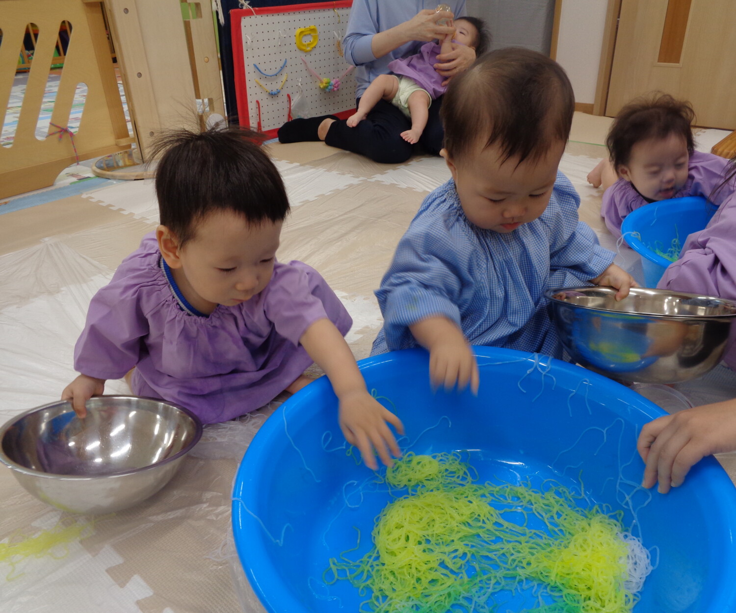 美木多チコスブログ 04 11月 2025 つるつるだね(そら組) カチカチの春雨があたたかいお湯に入るとつるつるに変身しましたよ。カラフルな春雨を使ってみんなでおままごとをしたり混ぜたりして遊びました。 美木多 幼稚園