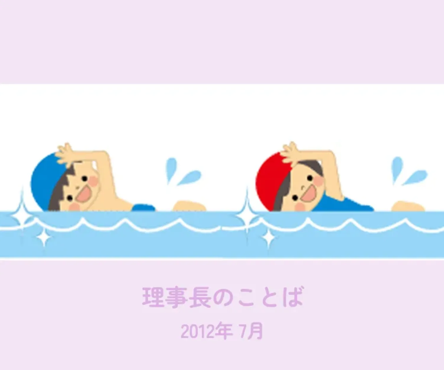 平泳ぎの北島選手のライバル、ノルウエーのダーレ・ オーエン選手の死、今は下火になったが、ゴム製のスイムスーツの問題、オーストラリア屈指のスイマー、イアン・ソープ選手の落日、水泳界ひとつとっても話題がいっぱいです。4の倍数の年に開催されるオリンピック、今回はヨーロッパ一の大都市、ロンドン市での開催、果たしていくつのメダルが日本にもたらされるのか。「世界の壁は厚かった。」「こんなはずじゃなかった。」「参加することに意義がある。」等という言葉は聞きたくない。戦前の選手がそうであったように必死の覚悟を持って臨んでほしい。精いっぱいの努力やその結果については惜しみない喝さいを送ろう。選手のために、私たちの日本のためにも。美木多幼稚園のちびっこスイマーたちはどうだろうか。子どもたちは新しいこと、珍しいこと、普段とは違ったことが大好き、特に私たち陸上に生活する者にとっては、水中での行動はなじみのない異空間の出来事、子どもたちの好奇心や興味は最高潮、そんな未知の世界でどのように練習するか、どのように慣れるか、そして最終的にどのように水と友達になっていくか。リンゴ、年少、年中は水に慣れること、水を怖がらないことをテーマに大きな意味での水遊び、年長さんは毎日体操の先生に来ていただいて、顔付けや、浮くことの基礎の体得です。必要以上に水を怖がることはないが、いつも慎重で用心深い態度も肝要。用心深いというのは水そのものに対することと同時に実際にプール遊びを決行すべきかどうかの判断です。幼稚園の基準は水温+気温≧50です。前者が高くて後者が低いときには水の中のほうが温かく感じられ、逆の場合は水をひんやり感じることもある。49や51の場合も機械的に判断せず、子どもの意欲、健康、これからの天候の移り変わり等慎重な判断を要求されることもある。プールの季語は夏、幼稚園では6月から7月にかけて毎日プール遊びに取り組んでいます。いつの日か世界的なスイマーが現れんことを期待して。今の時期、子どもたちを興奮させるもう一つのことは「シャボン玉遊び」。シャボン玉の歌も習いました。その歌を時には口ずさんでさまざまな大きさのシャボン玉を目を輝かせながら一心不乱に作ります。園庭を埋め尽くしたシャボン玉が太陽光に反応して一種幻想的な雰囲気です。今日のこのイメージが一生涯子どもたちの頭のどこかの部屋に存在し続けることでしょう。 経済一流、政治が三流と言われた日本、今やその一流の経済も青息吐息。政を司る組織が弱体化し、私利私欲が多くみられるせいでしょうか。自分の立ち位置がどのようなものか、隠れも出来ないで白日の下にさらけ出されるその姿はまさしく高邁な理想を追い求めるというよりは、どんな組織体の中にもみられるように自己犠牲の対極、自己保身の姿かもしれません。もっともその姿を批判し嘲けり笑う資格は私も含めてほとんどの人は持ち合わせていないのも正直なことでしょう。このままいけば日本沈没です。いや美しい緑の山河、こまやかの人の情、こんな素敵で豊かな国を、私たちが受け継いできたように、この子供たちに引き継ぐことを約束するために、物言わないサイレントマジョリティであり続けるよりは未来のことを考えて意思表示が必要なのではとつくづく思う。 7月、文月、一学期の終わりの月、4月から始まって三か月余り、子どもたちは大きく立派な成長への軌道に乗りました。これから迎える二学期、三学期の活動を通して、それがどれだけ膨らんでいくか本当に楽しみです。一緒に見守っていきましょう。一学期の間に私たちに頂いた保護者の皆様からのご支援、温かいお言葉、心よりお礼申し上げます。ありがとうございました。