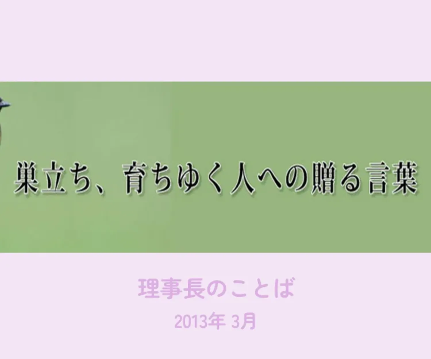 いつもの白い枝垂れ梅が満開となって私たちの目を楽しませ、潤いをもたらしている。卒園式までは順次咲き乱れることでしょう。人にも絶頂の時期が異なるように、梅にも一番華やかな時が微妙にずれている。桜は満開の期間の短さを儚さに例えられることが多いが、梅はそうではない。国花としての競争に負け、桜よりも低位に見られる梅は、ある意味不遇をかこっている。最もそんなことは人の勝手な思いで、梅にとっては迷惑千万、種の保存の為に一生懸命花を咲かせ、実をつける努力をしているのだから余計なお節介だろう。さて、そんな仄かな香りに包まれた梅の花咲く弥生、3月、その時が巡ってきました。卒園、進級です。私自身も教員として、園長として何回迎えたことでしょう。若い頃は当たり前だと思っていたことが、徐々に子どもの将来を憂え、世の中の現状を踏まえて、その行く末の幸せと健康を願う気持ちが強くなってきた。全ての人が同時に満足し、幸福になり、健康を謳歌する事は難しいかもしれない、しかしできるだけそれに近づけることは可能だろう。最も他力本願ではなくて、幸せと健康をつかみ取る努力も必要だし、満足を知る、分を知るということも大事だろう。そうでなければ、何時まで経っても自分が不幸であると思いがちになるから。人生は旅人だと誰かが言った。人生は航海に例えられるとも言った。人は重荷を背負って遠い道のりを行くようだと言う人もいた。人生50年、化天のうちを比ぶれば、夢幻の如くなりと、いにしえの言葉で語った人もいた。人は、人生は色々に比喩されるだろう。個人の一生をとっても、長いスパンで人間を観察しても、極端に言えば、繰り返しの連続にすぎない。この世に生を受け、這い、つたい、歩き、親からの愛を受け、知識を授かり、友を得る為に学校に行き、生活をし、生き甲斐を見つけ出す為に働き、伴侶と出会い、愛の絆を交わし、結婚し、子どもが生まれる。その子どもの成長を見守り、期待を抱き、齢を重ねていく。その道程では筆舌しがたい喜怒哀楽があり、子どもの生長と共に、自身も経験を積んで、大人としての風格を備えていく。やがて子どもたちが独立し、新しい領域、高齢者の仲間入りをしていく。遂には後に続く者へバトンを引き継いで、消え去っていく。日本だけ考えても非常に荒んだ不幸な時代も多々あったが、種の保存行為は営々と続けられた。本当に驚くべき繰り返しである。その繰り返しの中で君たちが生まれた。2年、3年、4年の幼児教育の過程を終えて今巣立ちの時を迎えた。本当に大きくなった。本当によく生長した。賢くなった。それなりの礼儀を身につけることができた。これから始まる人生の第一歩は無事完了したと思う。人生は陽炎のように儚いと言う人もいるが、考えによっては随分長い。活躍し、腕をふるうには充分だ。失敗してもやり直せるだけの時間もある。その為にこれからの学校生活では思いっきり勉強して知識を深め、友をたくさん作り、体力を強固なものにしよう。貪欲さも必要だが、謙虚ということも忘れないでほしい。自分一人でないということも憶えておきたい。人それぞれ生き方も千差万別だろう。しかし決して諦めたり、自暴自棄にならないでほしい。勇気を持って進んでいこう。希望は君たちの頭上にあるのだから。