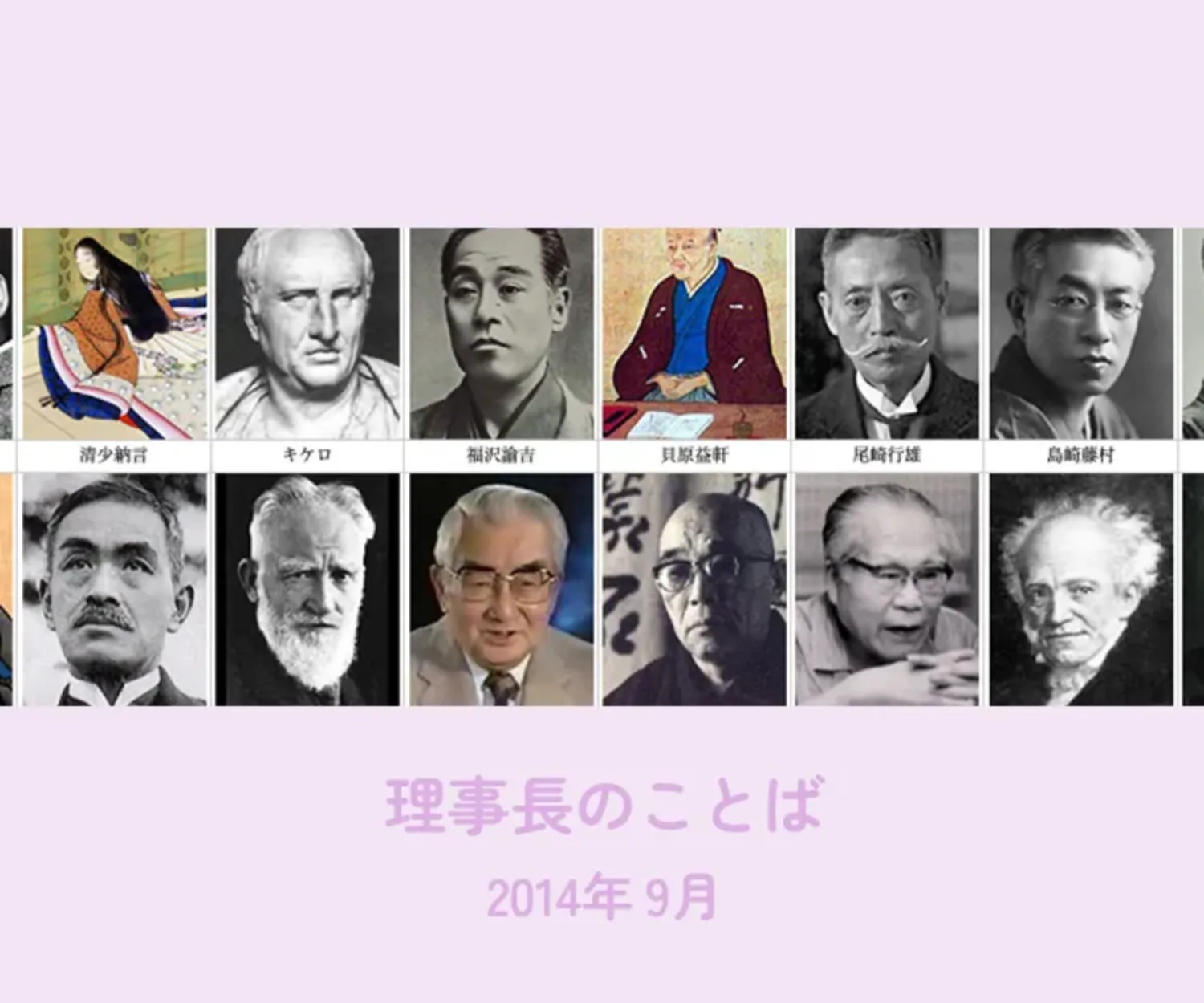 山路を登りながらこう考えた。情に掉させば流される。意地を通せば窮屈だ。とかくに人の世は住みにくい。(夏目漱石)春はあけぼの。やうやうしろくなり行く、山ぎはすこしあかりて、むらさきだちたる雲のほそくたなびきたる。夏はよる。(清少納言)恩を受けた人はその恩を心にとめておかなければならないが、恩を与えた人はそれをおぼえているべきでない。(キケロ)学問とは唯むつかしき字を知り、解し難き古文を読み、和歌を楽しみ詩を作るなど世上実のなき文学を云うにあらず。(福沢諭吉)養生の術は先心気を養うべし。心を和にし、気を平らかにし、いかりと慾とをおさえ、うれひ・思ひをすくなくし、心をくるしめず、気をそこなはず、是心気を養ふ要道なり。(貝原益軒)良い憲法さえ作れば国が良くなるなどという軽率な考を以て、これに御賛成になりますと非常な間違いである。憲法で国が救われるならば、世界に滅亡する国はありませぬ。(尾崎行雄)昨日またかくてありけり 今日もまたかくてありなむ この命なにを齷齪 明日をのみ思ひわづらふ(島崎藤村)人と人との接触に関心する人々の心にあって最も重き地位を占むるものはいうまでもなく愛の問題である。愛は初め花やかなる一団の霞のごとくに、たのしく、胸をおどらす魅力を備えて私らの前に現れる。(倉田百三)子日わく、学んで時に習う、亦説ばしからずや。有朋、遠きより方び来たる、亦楽しからずや。人知らずして慍らず、亦君子ならずや。(孔子)春高楼の花の宴 めぐる盃影さして 千代の松が枝わけ出でし むかしの光いまいづこ。(土井晩翠)わたしにとっては、人生には美もなければロマンスもありません。人生はあるがままのものです。そしてわたしは人生をあるがままに受け入れるつもりです。(バーナード・ショー)バスの中で三歳の子が母に言った。「ね、あのおうちも向こうのおうちも大きいね、ボクんとこどうして小さいの」すると若い母がいった。「あんな大きなおうちだったら、ママが坊やにお話ししても聞こえないでしょう。ひろすぎて」坊やがいった「ホントだね」私はこの母に感動した。(淀川長治)日本料理にはまた、料理以外の美的要素といいますか、日本人独特の繊細なセンスを生かすことも必要でっせ。なにしろ、朝の山の色と、ゆうがたの山の色とが変わるという国やさかい、そのデリケートなところが料理法にも反映して、世界に冠たるものやと思います。(辻嘉一)約束の時間を守らないで、他人に迷惑をかけることの悪徳であることは、なんびとも否定できまい。にもかかわらず、どうして私たちはこんなに時間についてルーズなんだろうか。その根本の原因は、私たち日本人は、時間をムダにしたり、ムダにされたりすることにあまり神経質でないからだと思われる。(河盛好蔵)蔵書数がどんなに多くても整理のできていない図書館は、冊数はほどほどながら整理に行き届いた書庫ほどには役立たない。それと同様にどんなにたくさんの量の知識でも、自分で一度考えぬいてない場合には、量としてははるかに少なくてもいろいろ考えつめた知識より、その価値ははるかに低い。(ショーペンハウエル)武士道は刀の正当なる使用を大いに重んじたるごとく、その濫用を非としかつ憎んだ。場合を心得ずして刀を揮った者は、卑怯者であり法螺吹きであった。重厚なる人は剣を用うべき正しき時を知り、しかしてかかる時はただ稀にのみ来る。(新渡戸稲造) 代々木ゼミナールが規模を縮小したというニュースが流れた。50年前の受験生のころ、大阪は予備校が群雄割拠していて、代ゼミがあったのかどうかわからない。私はYMCA土佐堀校を選び多くの友を得た。当時は大学の数が少なく、学生の半分以上は浪人生であった。今は大学の数が極端に増え、誰でもはいれる状態になった。換言すれば浪人してまで行きたいという大学が減ったのだろう。人口減に伴い、栄枯盛衰が様々な分野にまで忍び寄っている。将来に対する予測が難しくなってきた、ひょっとすると同じような現象の国や過去の時代も参考になるかもしれない。しかしどんな時代になろうとも、人はその状況の中でたくましく生き続けることも事実だろう、この地球号が破壊されない限り。一段と元気で頼もしくなった姿で私たちの前に現れた子供たち、本当にお帰りなさい、先生たちはいろいろ準備をして、今か今かと待っていました。さあ2学期、運動会、作品展、登山、ミカン狩りにサツマイモ堀、秋の遠足、様々な楽しいことが皆さんを待っています。大きな成長を目指してともに集いましょう。9月、長月、September, 教職員一同力を合わせて同じ方向を向いて今月も張り切って進んでまいります。尚、今月、願書配布、来月入園受付となっています。勝手なお願いですが、何卒ご近所お知り合いの皆様に私たちの幼稚園をお勧めいただきたく、伏してよろしくお願い申し上げます。皆様方の期待に背くことなく、推薦して良かったと言っていただけます