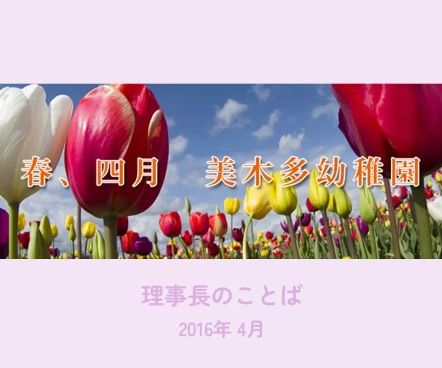 遠い異国の地で生まれた春、極寒の北極海を横断し、国境を超え、流氷を俯瞰しながら、長い旅路を終えて、私たちの暮らす祖国日本にたどり着いた。そして休む間もなく、野を超え、山を越え、河川を渡り、飛ぶ様な勢いで私たちの元にたどり着いた。待ちに待った春がやってきたのです。嬉しい、幸せな季節の到来です。今年は少し到着が早いかなと思っていると、日にちを間違えたと考えたのか、寒の戻りできっちり季節を調節している。にくい演出家でもある春、美木多幼稚園に39回目の春が音もなく静かに今到着しました。春と聞いただけで、私たちの閉ざされた心が無意識のうちに開き、体に生気が満ち溢れ、躍動感がもたらされるのも不思議なものです。冬の寒い真っ只中に、様々な形で春と言う言葉を多用しているのも、春が私たちを何かから解放してくれるという暗示を得たいためかもしれません。兎に角、今は春を目で見、その近づく足音を耳で聞き、それが醸し出す匂いを満喫するのです。わたしたちが自慢し、誇りに思っている日本の春、日本人だけが悦に入り、喜び、至福の時を過ごしていた掛け替えのない日本の春が、異国の人にもその素晴らしさが知れるようになって、日本の春を愛でる外国人が増えたとか。そんな春爛漫の四月、新入園児の皆さん、「ようこそ美木多幼稚園に」、今日から私たちの仲間です。楽しいこと、うれしいことが一杯溢れています。又ちょっぴり悲しくなる事や寂しくなることもあるでしょう。でも大丈夫。皆さんは一人ぼっちでないのです。たくさんの仲間が一緒です。優しい先生も皆さんをじっと見守っています。皆さんはこれから美木多幼稚園で2年、3年、4年の年月を仲間と一緒に過ごします。その間に未体験の経験を数多くすることになります。野山に行ったり、山に登ったり、自然と一杯触れ合ったりします。運動会、作品展、音楽・生活発表会などの大きな行事や近くの公園や田畑に行ったりする小さな活動にも喜んで参加します。楽しい行事、期待される行事もたくさんあります。お誕生会にはいろいろな人に来て頂いて、この世に生まれたことを皆で祝福します。皆さんの幼稚園生活が本当に充実したものになるよう私たち教職員は精一杯知恵を絞り、頭や体を働かせていきます。さあ、いよいよ期待と希望の始まりです。私たちにとっても皆さんを幼稚園に迎え入れて、本当の嬉しい、幸せな幕が開きます。保護者の皆さん、お子様のご入園心よりお喜び申し上げます。生まれてこの方、今まで子育てに大変なご苦労をされたことと思います。これからは私たちも仲間に加わって、子ども達が立派に大きく成長されますよう手を携えていきましょう。幼児期は人生の根の部分を形作る大事な時期であると同時に大きな成長も期待できる大切な時でもあります。この時期が将来を左右すると言っても過言ではありません。保護者の皆さんが美木多幼稚園にお子様の幼児教育を託されたことを本当にうれしく感じると同時に責任の重さもひしひしと伝わってきます。保護者の皆さんと一緒になって何がこの子たちにとって大事なのか、どうしてあげたらいいのか、経験と体験を踏まえながら、よく考えて実践していきましょう。又同様に子供たちの安全、安心の面にも十分注意を注いでまいりましょう。在園児の皆さん、ご進級おめでとうございます。皆さんはすでに美木多幼稚園で1年、2年、3年を過ごしました。その間に先生もびっくりする程、体も大きくなり、心も豊かになりました。知識の量も以前と比べ物にならないくらい増えました。これからの1年でもっと大きく成長することと思います。先生と一緒になって楽しく有意義に幼稚園生活を送りましょう。最後になりますが、在園児の皆さんも、新入園児の皆さんもお父さん、お母さんを悲しませることのないよう、事故にあわないよう、怪我をしないよう又病気にならないよう体と健康に十分気をつけましょう。私たちは保護者の皆様の負託に十分こたえることが出来ますよう、誠心誠意力を尽くしてまいります。今後ともご支援、お力添えをよろしくお願い申し上げます。そして又皆様方がご多幸でご健勝で過ごされますよう、心よりお祈り申し上げます。